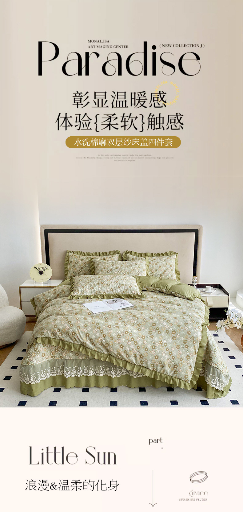(总)艺慕家纺 2025新款水洗棉麻双层纱床盖四件套,太阳花绿,心动绿,春意,枫叶,粉色玫瑰,红豆,花丛兔,萌小兔,郁金香紫,青花瓷,夕颜,屋顶花园,夏日仙草