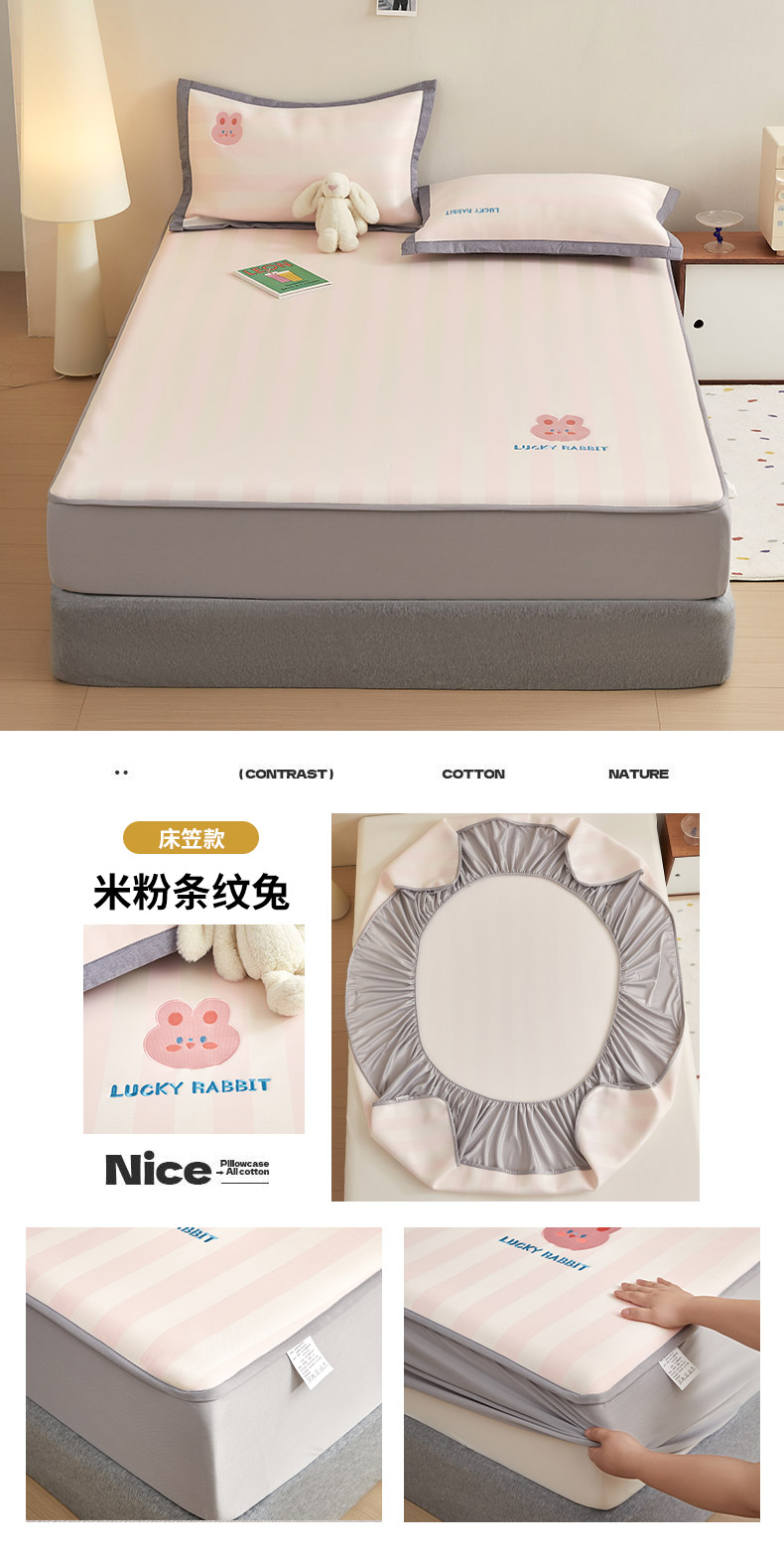 商品名称:怡家居 2024新款A类PE凉感提花刺绣床笠款凉席 米粉条纹兔-床笠款