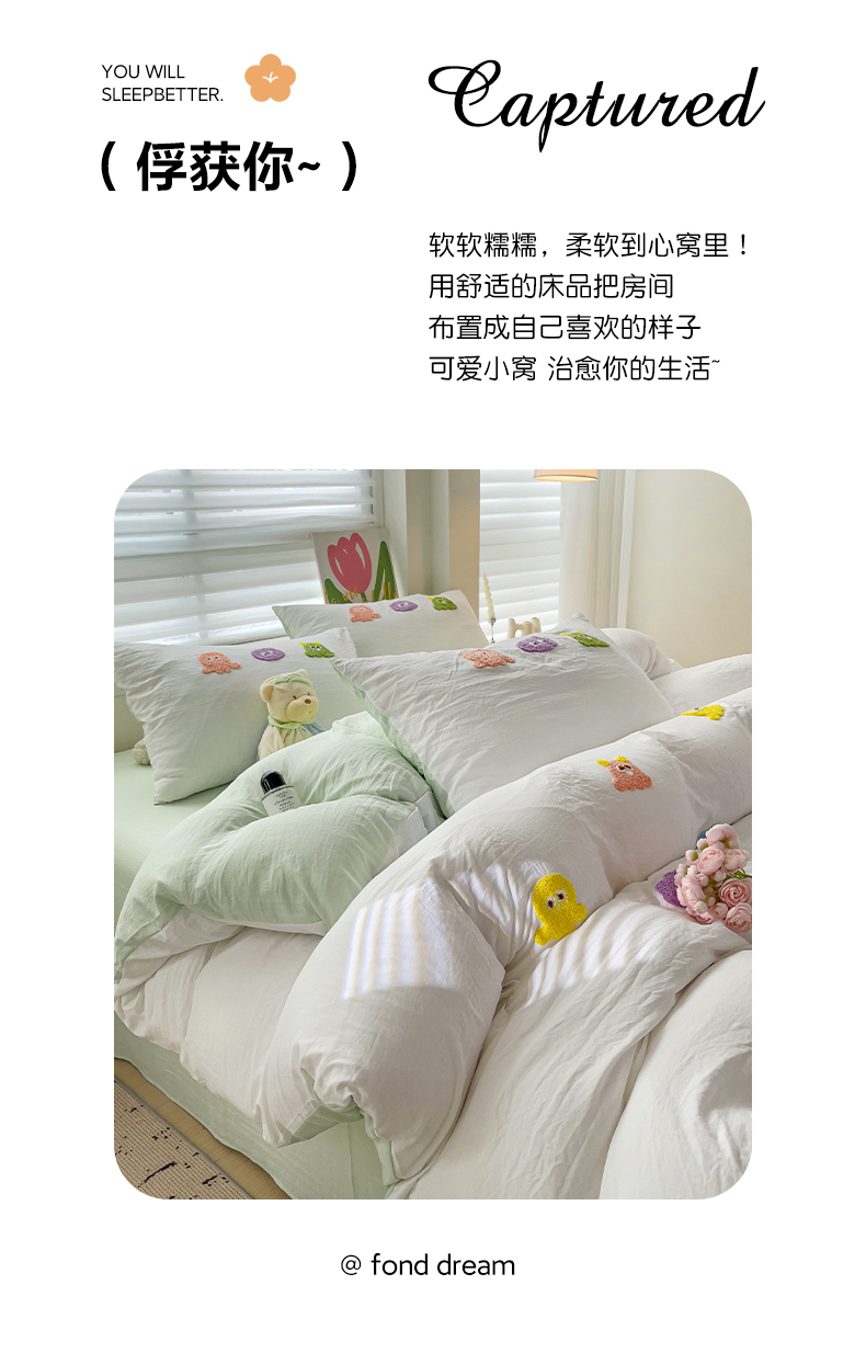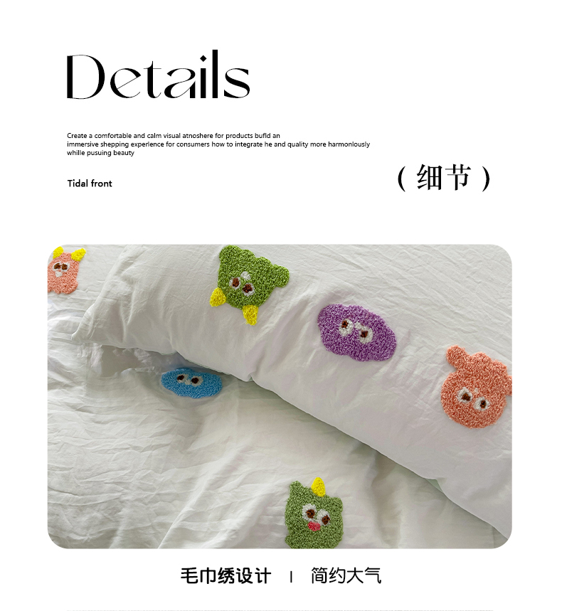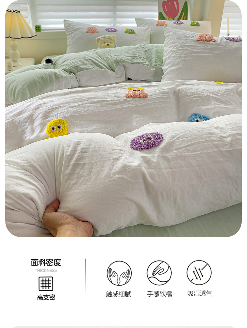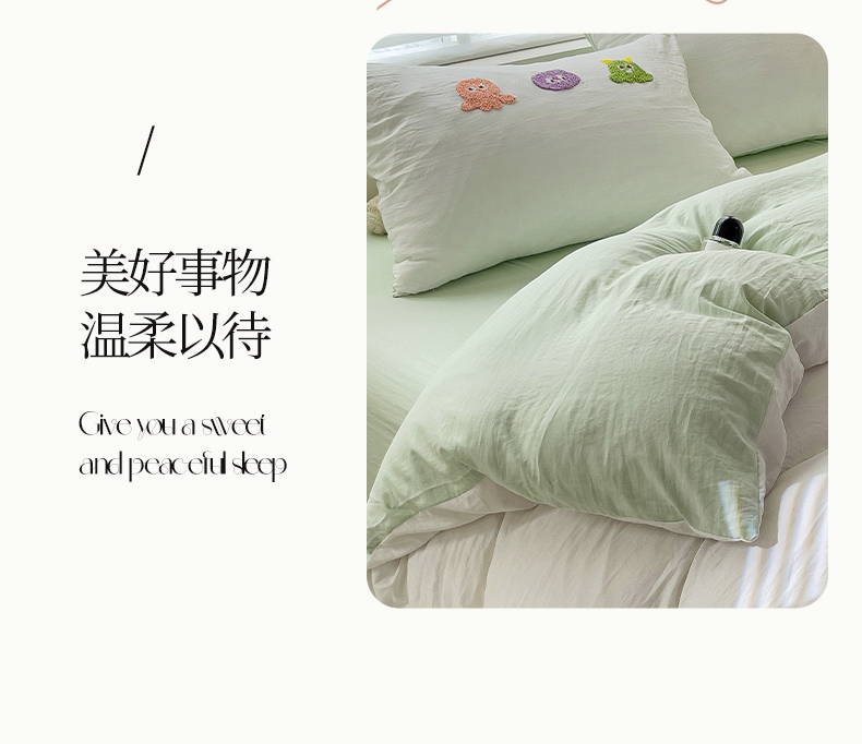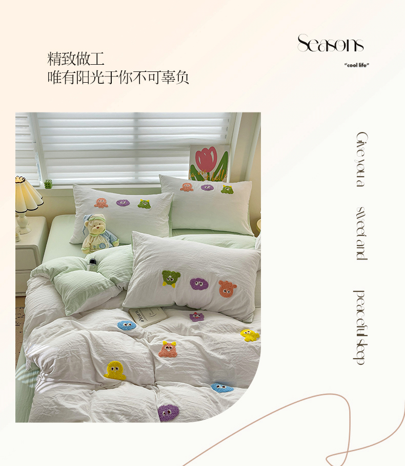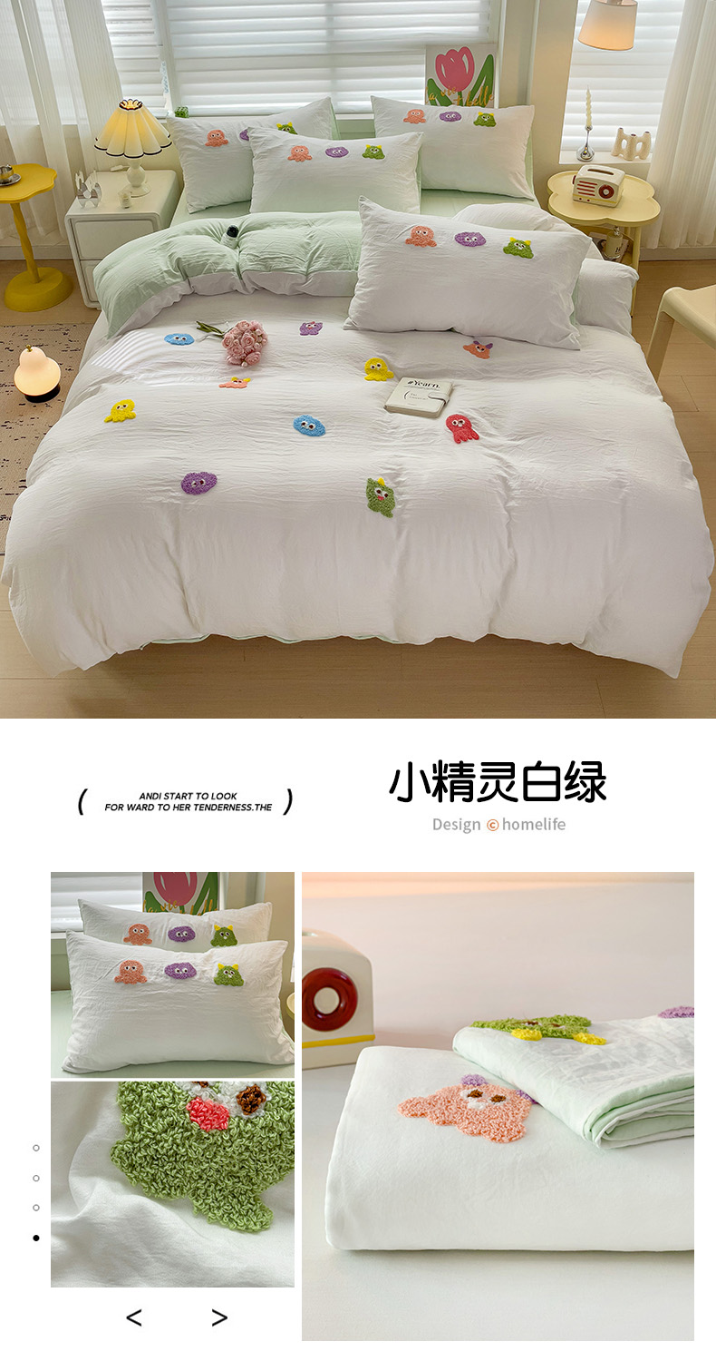 商品名称:韩巢家纺 2024热款超柔水洗棉毛巾绣单件被套-小精灵系列(提供精美卖家秀 ) 小精灵白绿