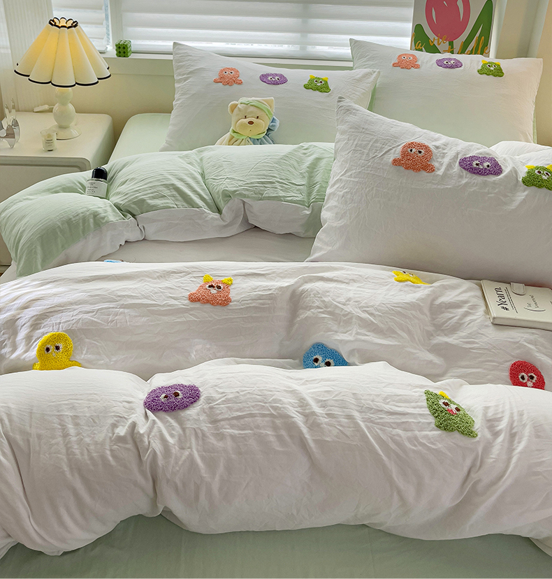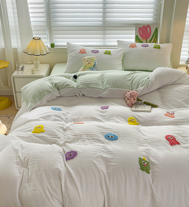 韩巢家纺 2024热款超柔水洗棉毛巾绣单件被套-小精灵系列(提供精美卖家秀 ) 小精灵白绿