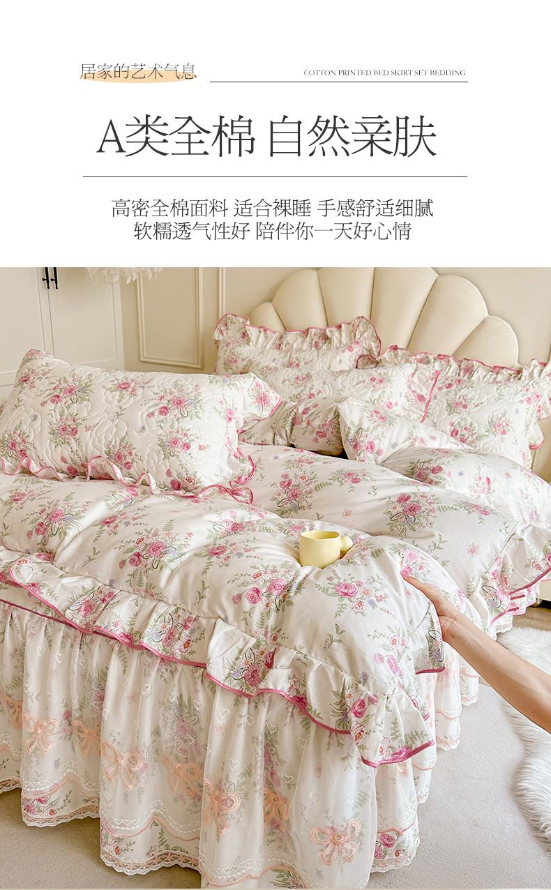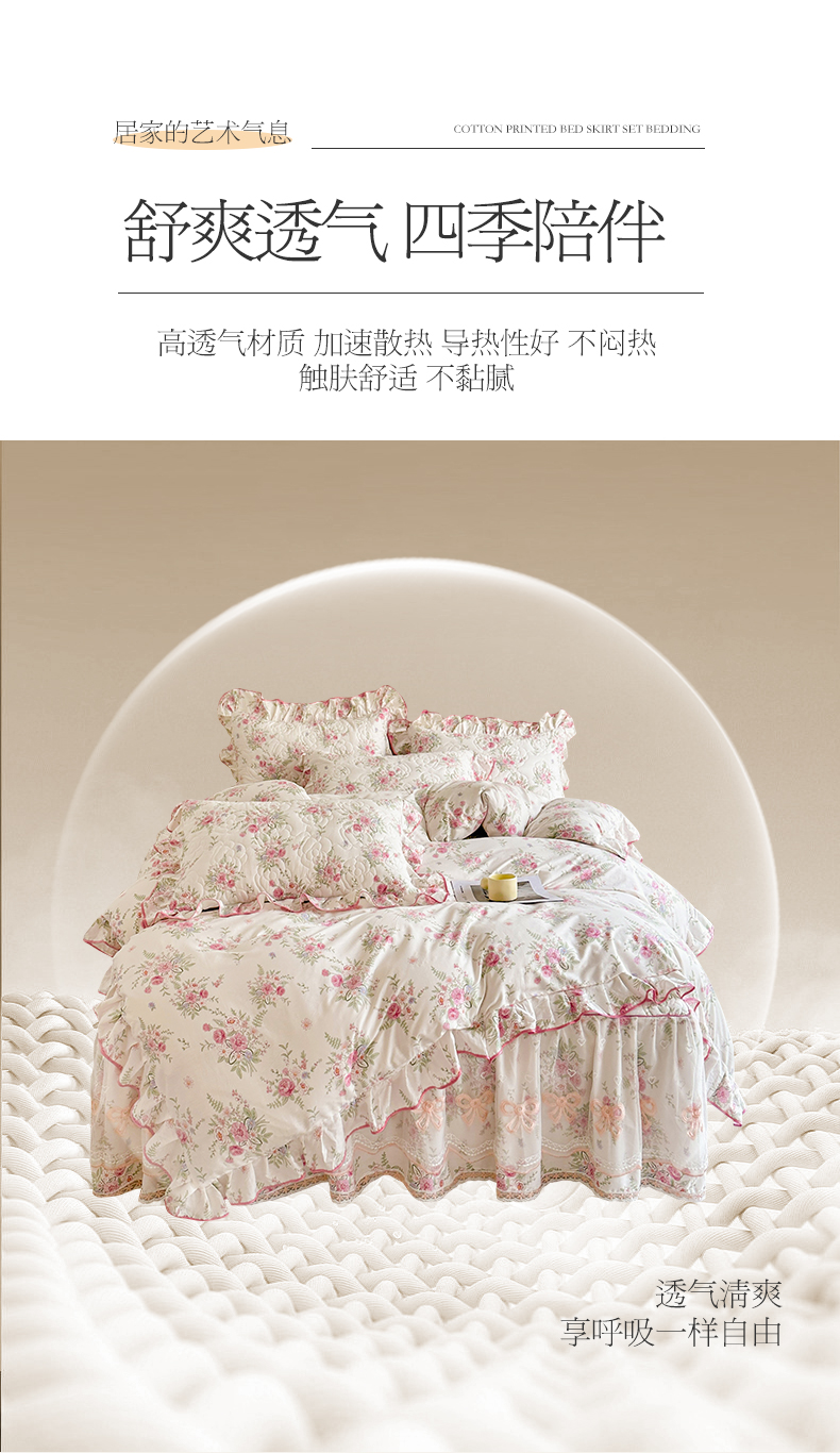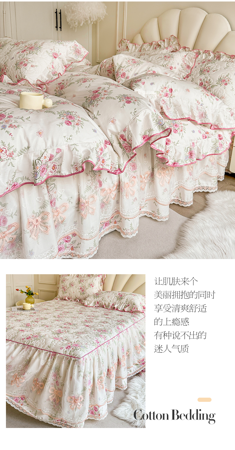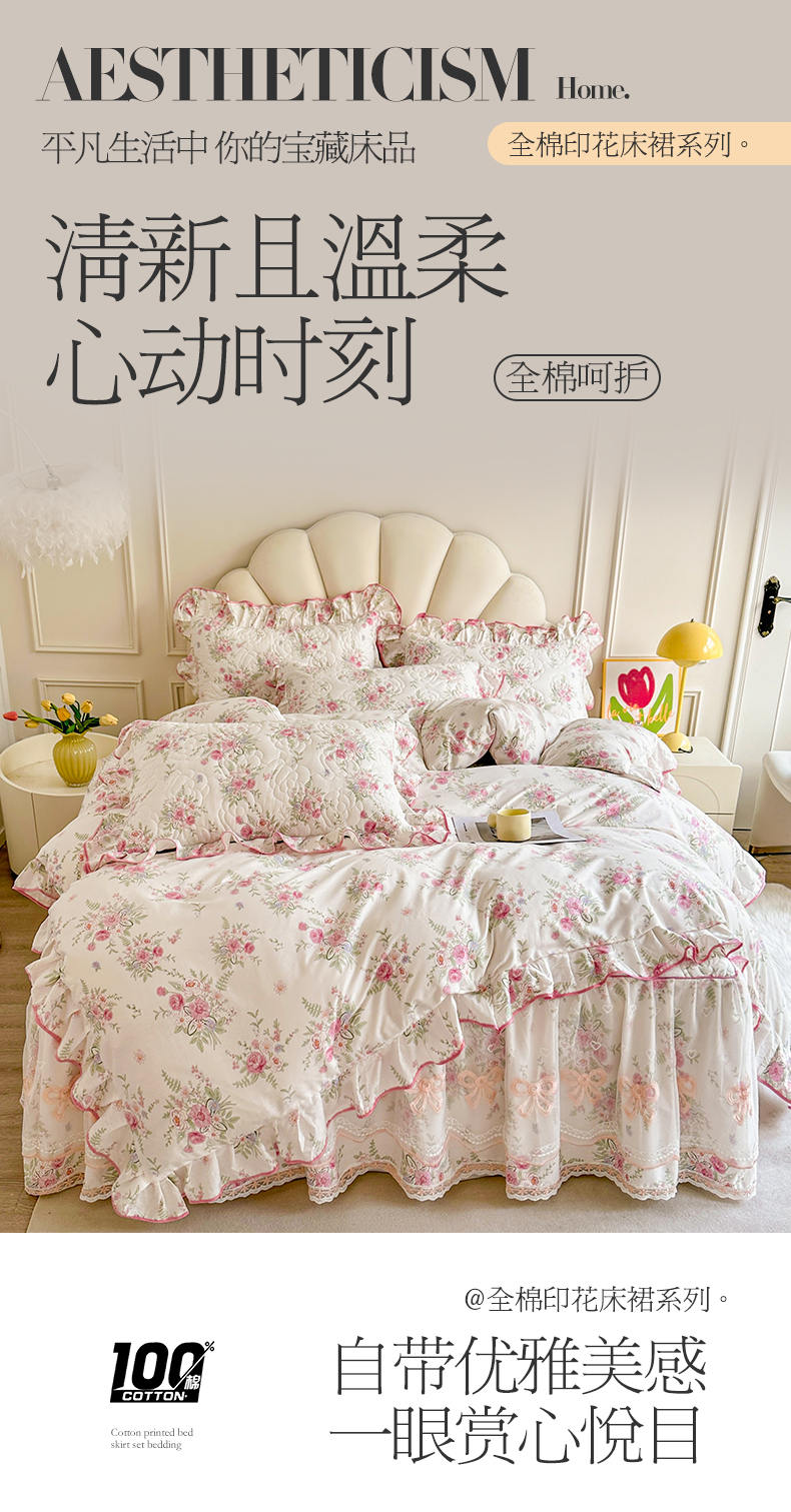 当前位置: 91家纺网 > 商品网购 > 床品套件 > 四件套 > 全棉普通四件套 > 宜凡家纺 2024新款全棉印花公主风夹棉床裙四件套 芳菲花园