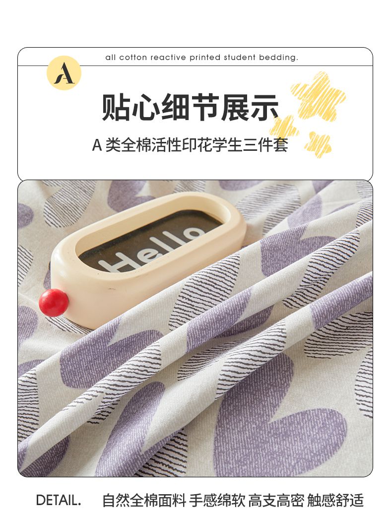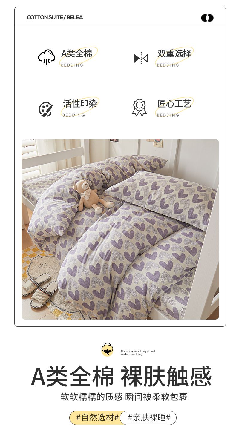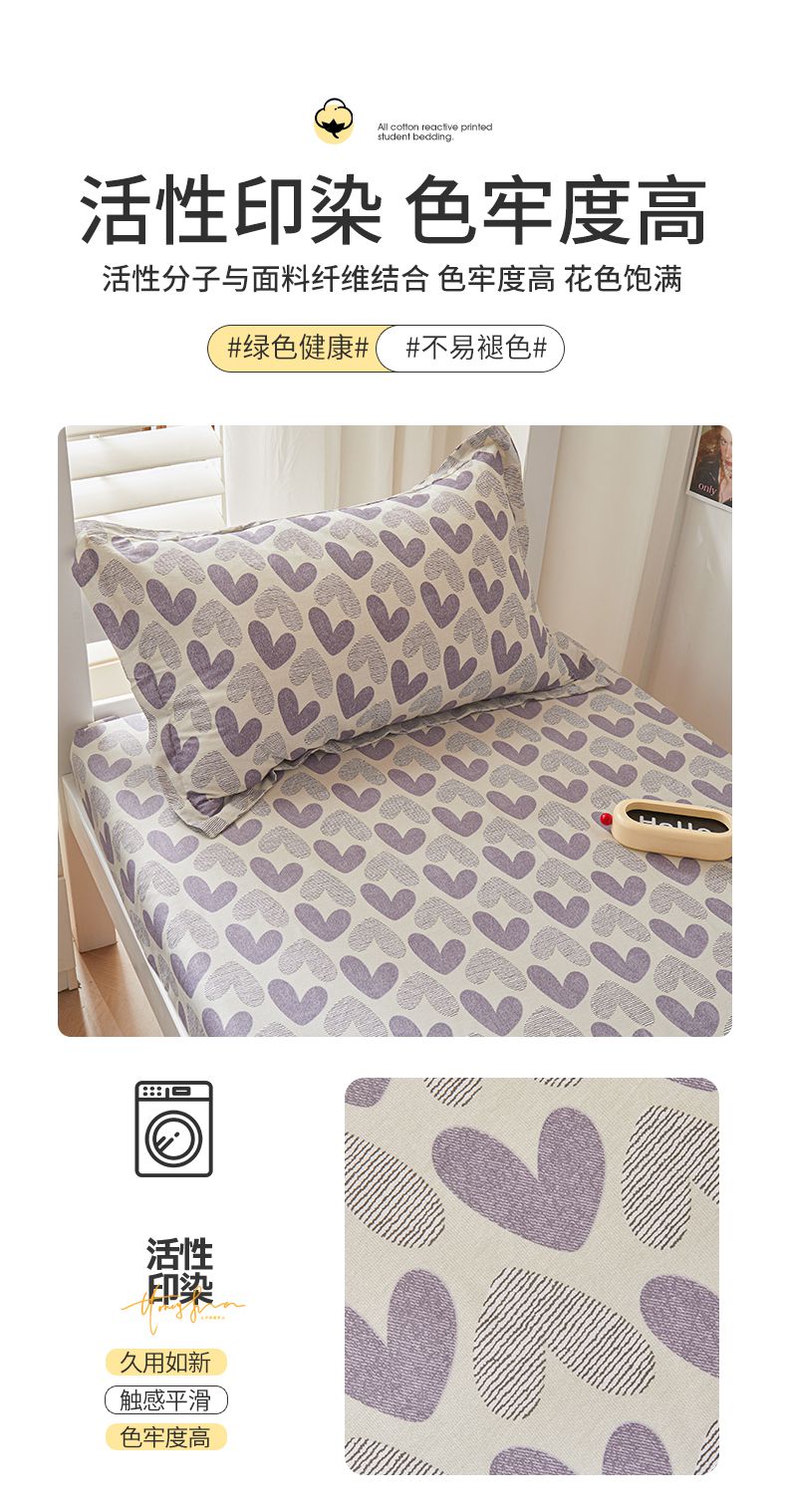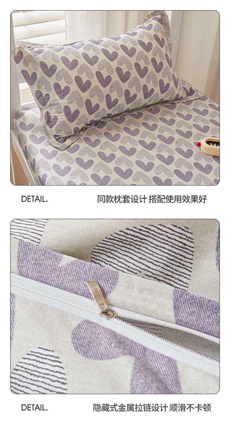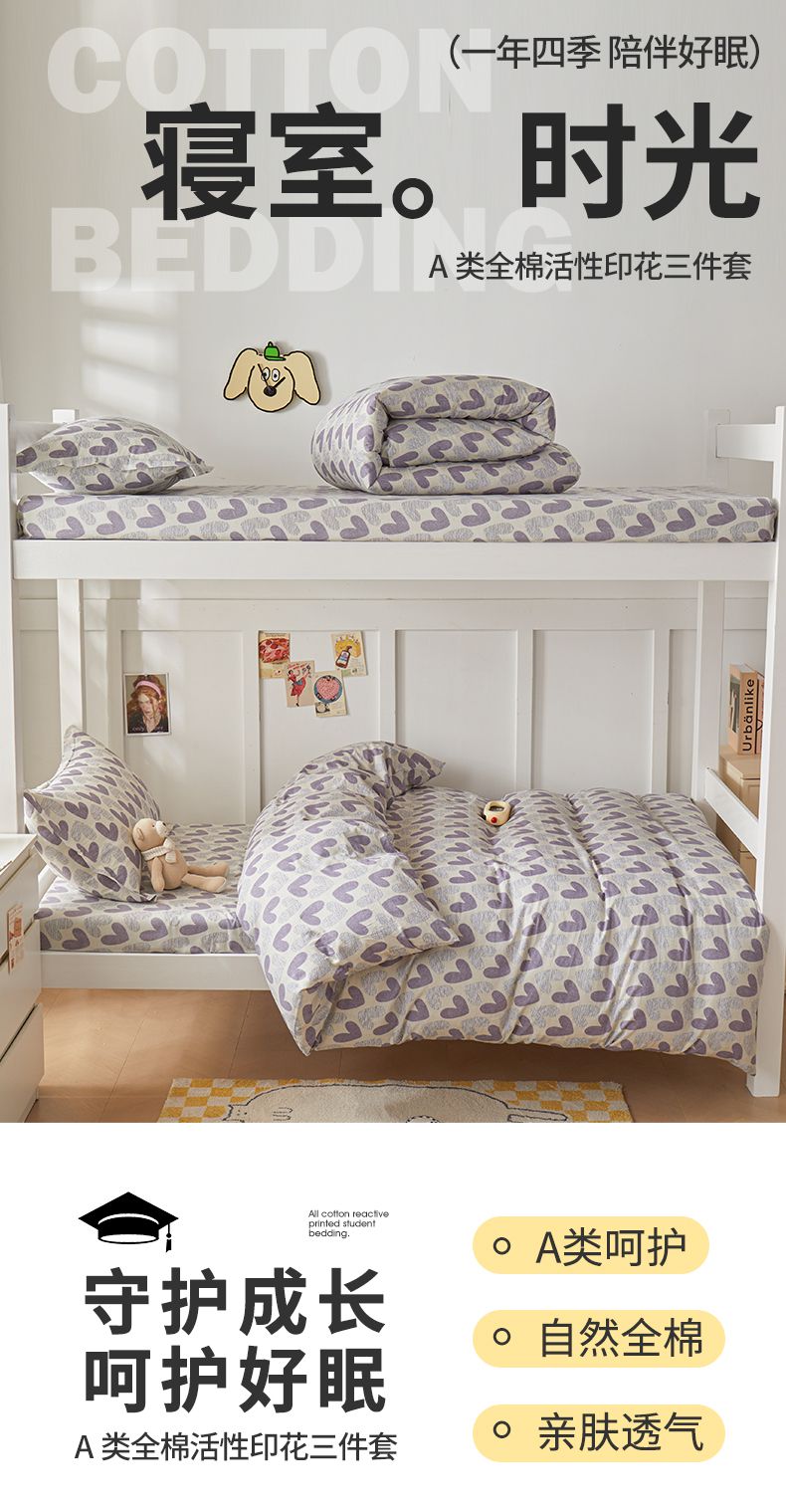 当前位置: 91家纺网 > 商品网购 > 床品套件 > 三件套 > 名优家纺 2024新款全棉三件套学生宿舍上下铺套件 紫雾爱心