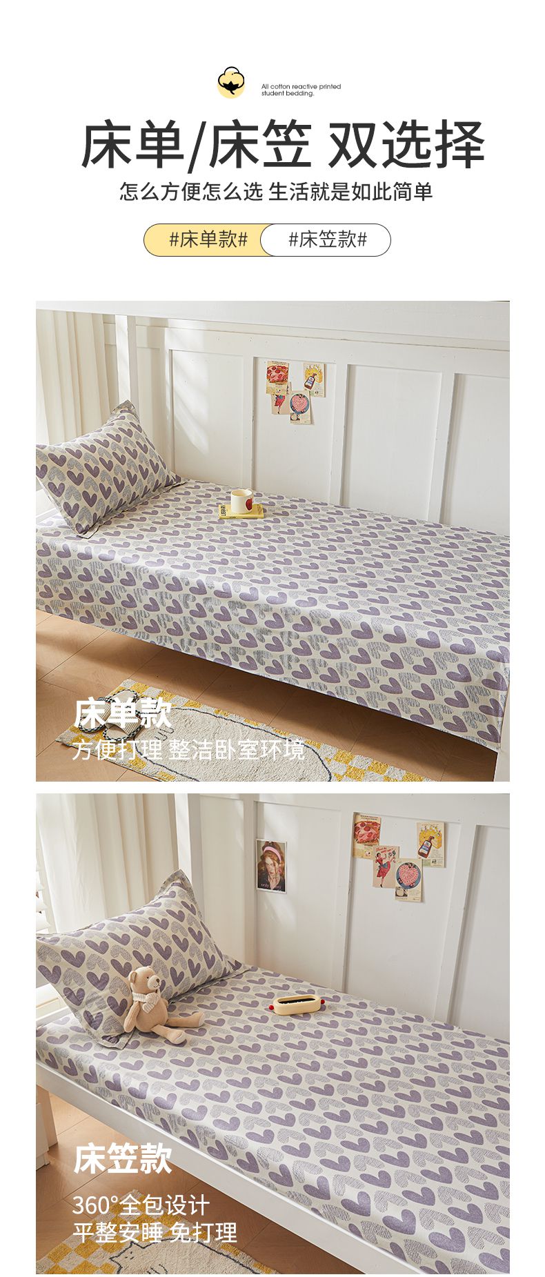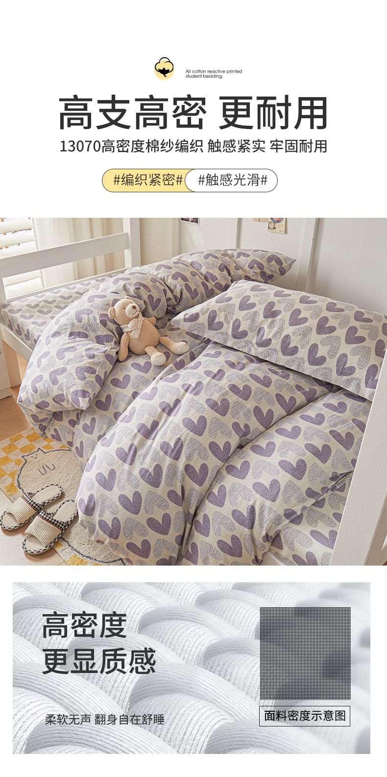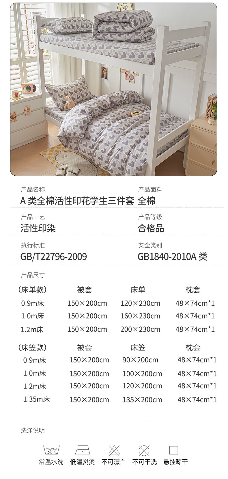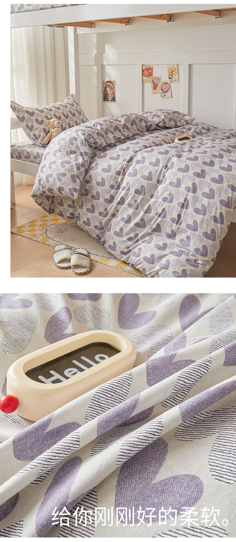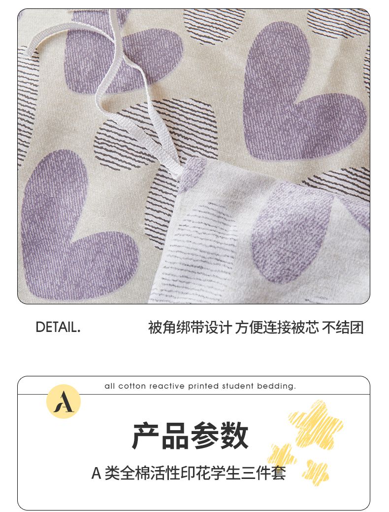 当前位置: 91家纺网 > 商品网购 > 床品套件 > 三件套 > 名优家纺 2024新款全棉三件套学生宿舍上下铺套件 紫雾爱心