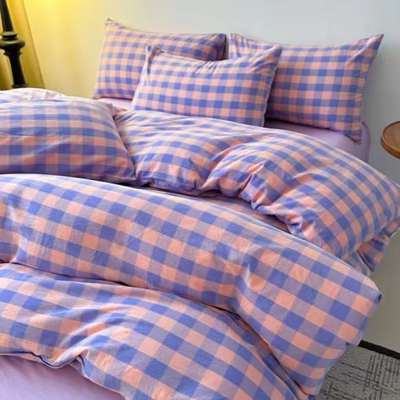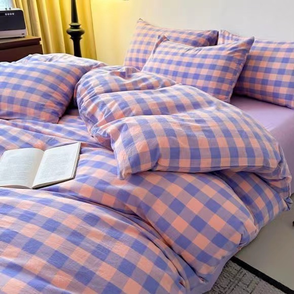 玖琳家纺 2024新款全棉色织水洗棉四件套 粉紫中格