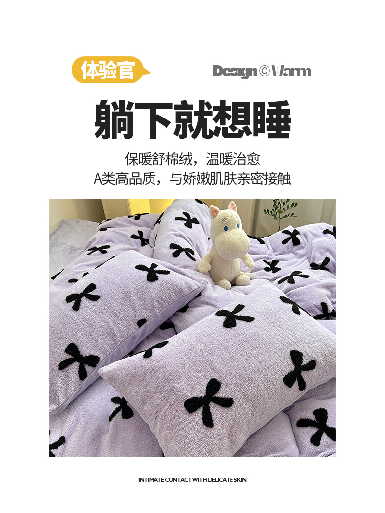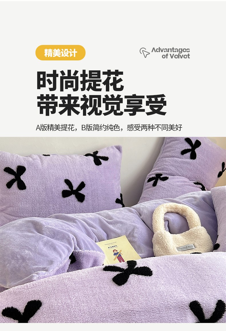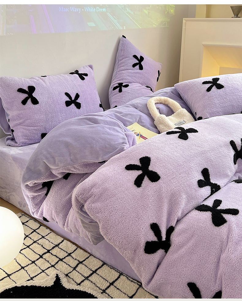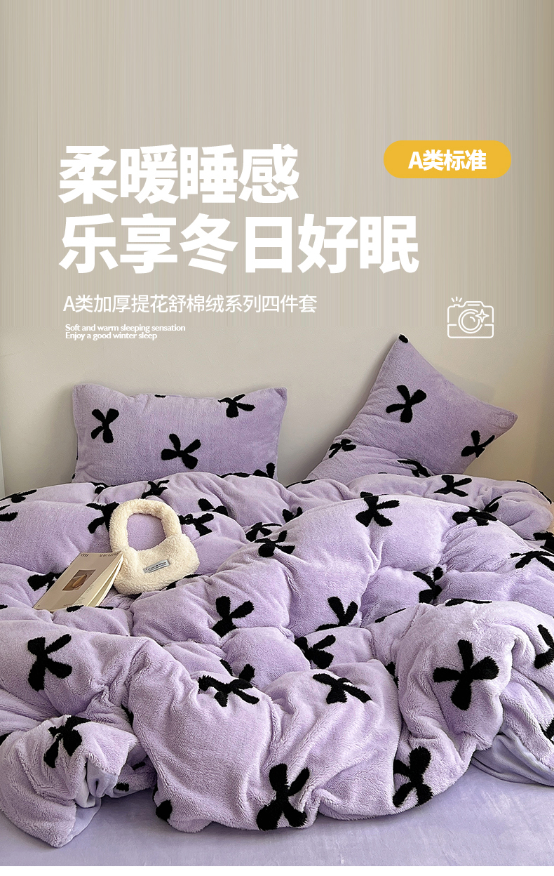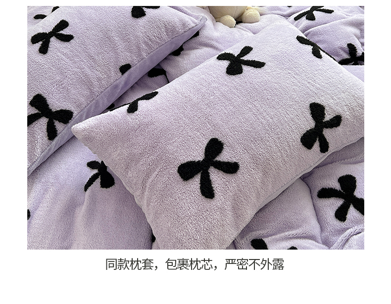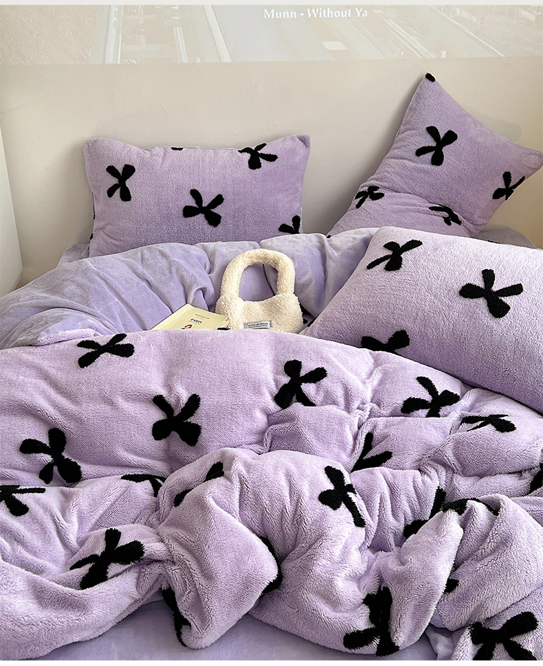 当前位置: 91家纺网 > 商品网购 > 床品套件 > 四件套 > 牛奶绒四件套 > 2024新款A类加厚色纱舒舒绒提花蝴蝶结爱心少女舒棉绒牛奶绒系列四件套 舒棉绒提花-紫色蝴蝶结