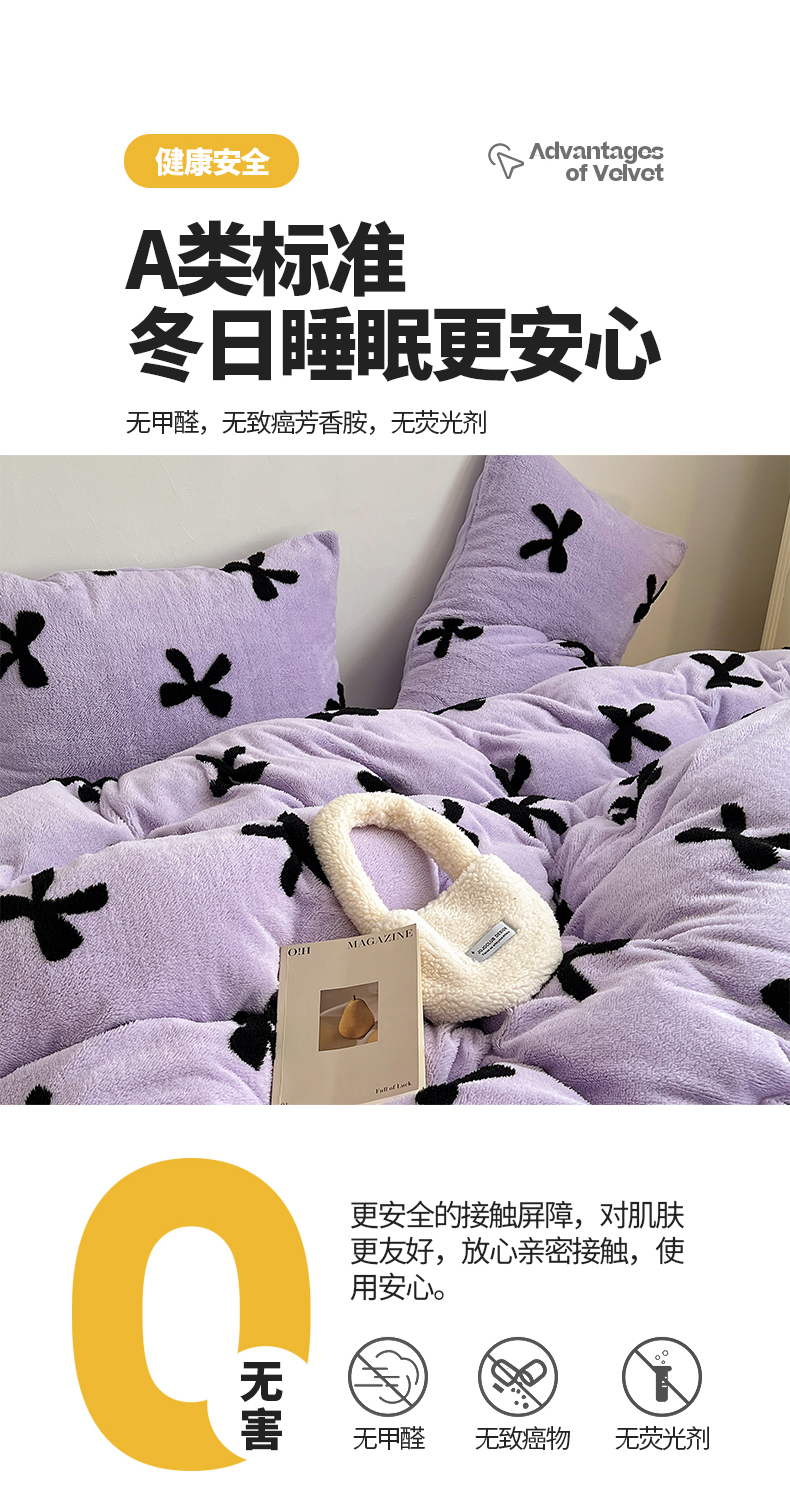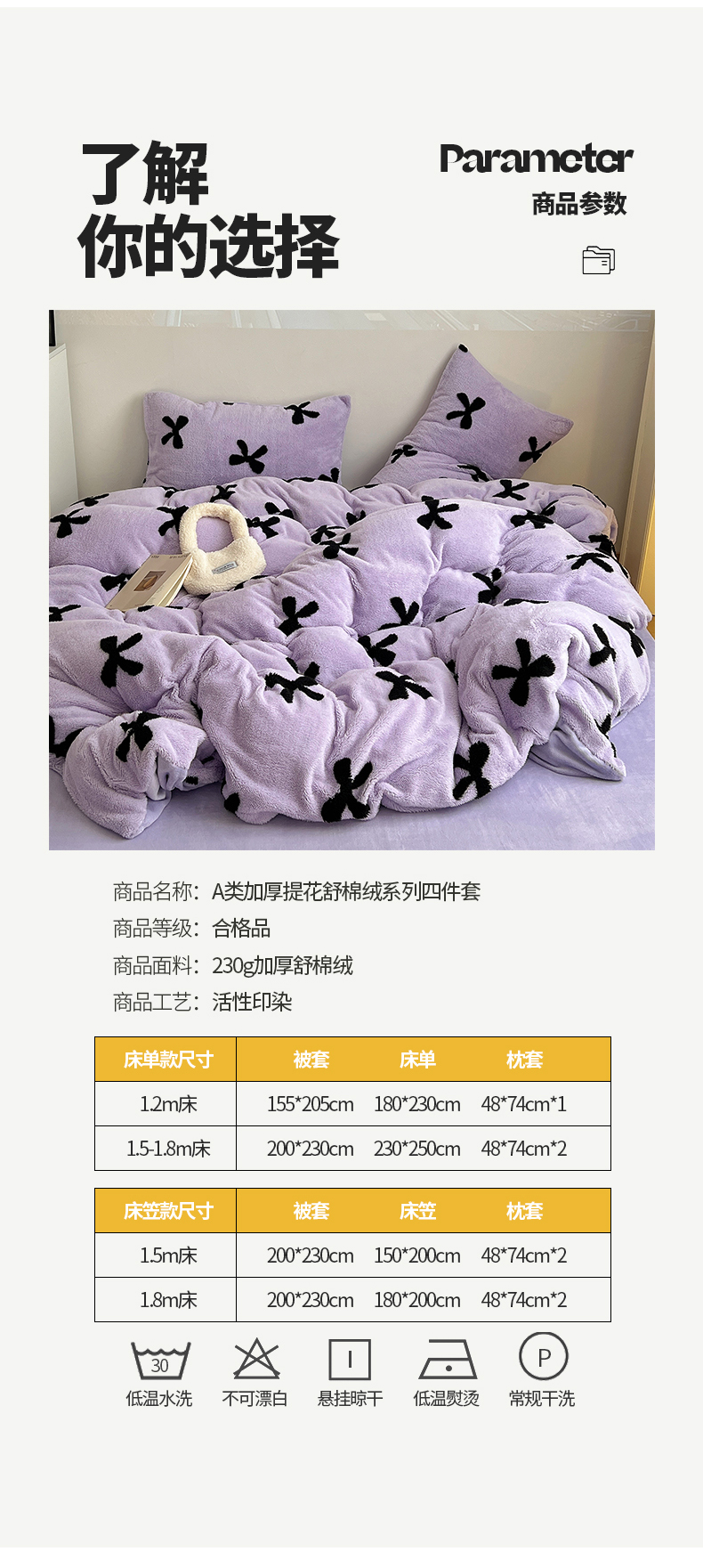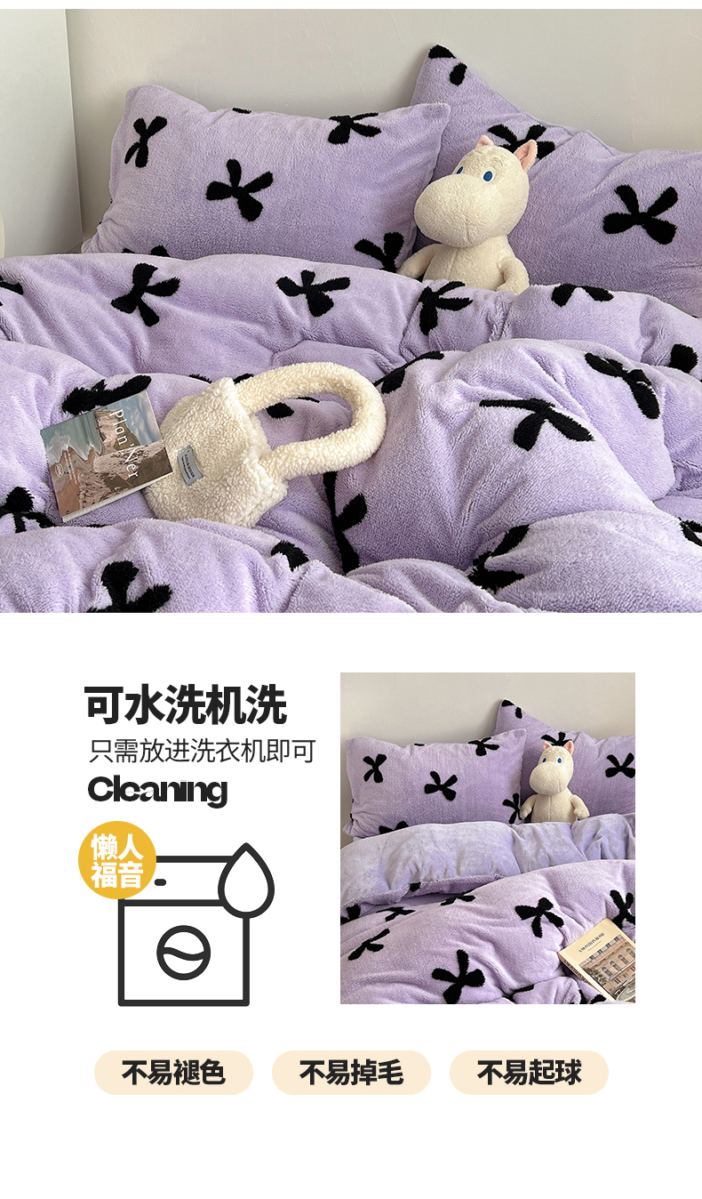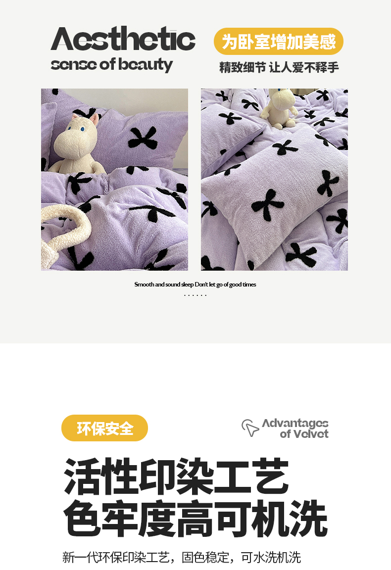当前位置: 91家纺网 > 商品网购 > 床品套件 > 四件套 > 牛奶绒四件套 > 2024新款A类加厚色纱舒舒绒提花蝴蝶结爱心少女舒棉绒牛奶绒系列四件套 舒棉绒提花-紫色蝴蝶结