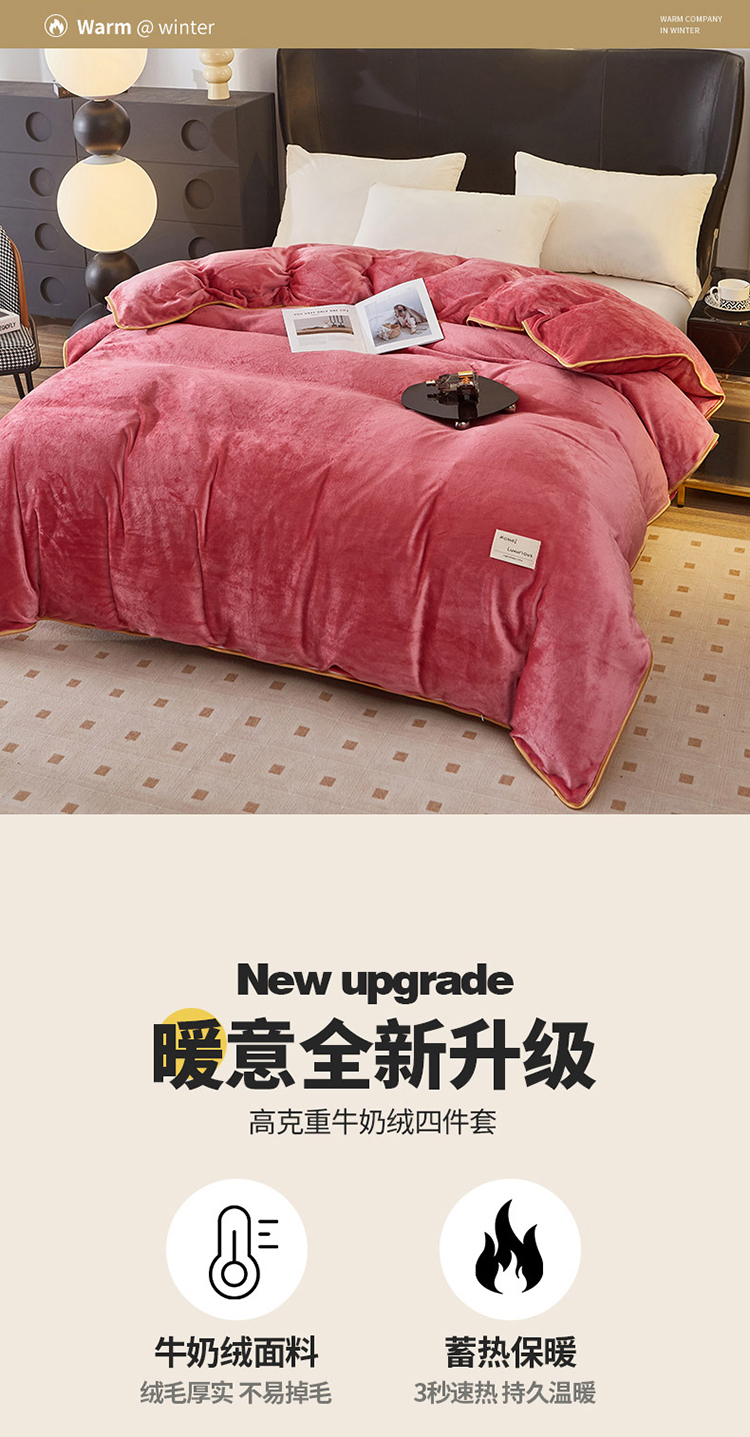 2023牛奶绒保暖四件套韩版蕾丝花边,紫色,松花绿,灰色,豆沙,宾利蓝
