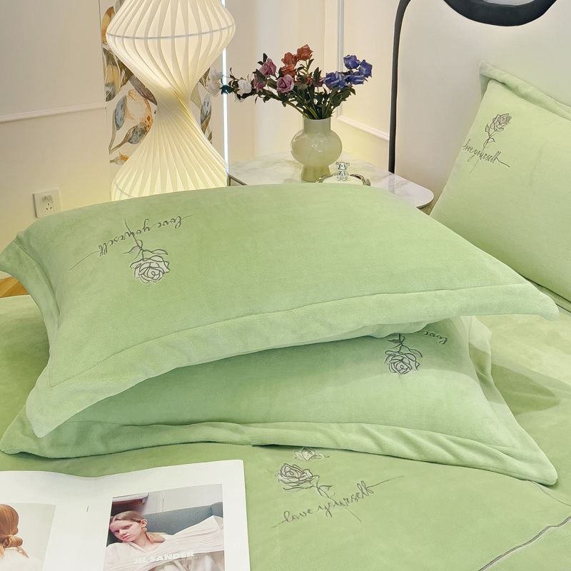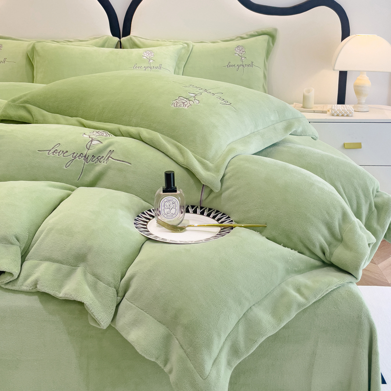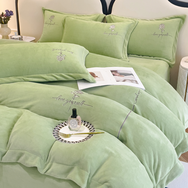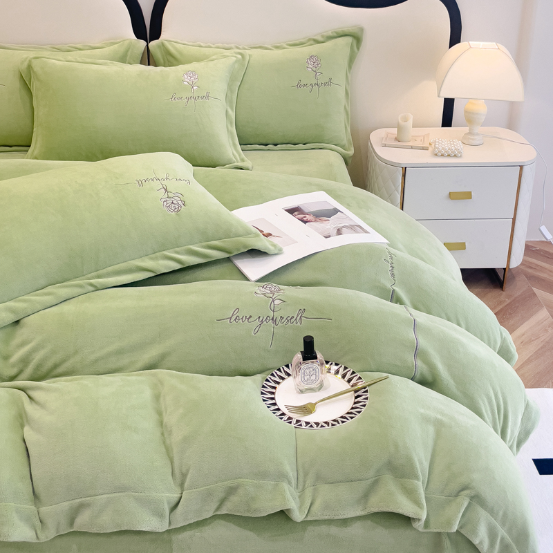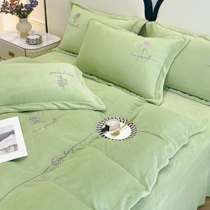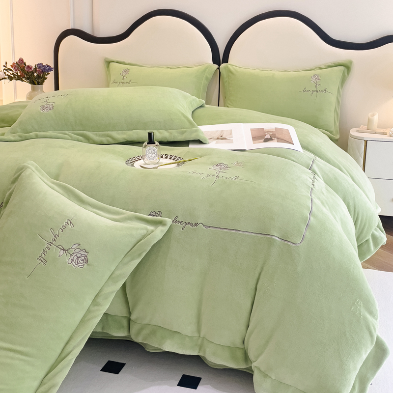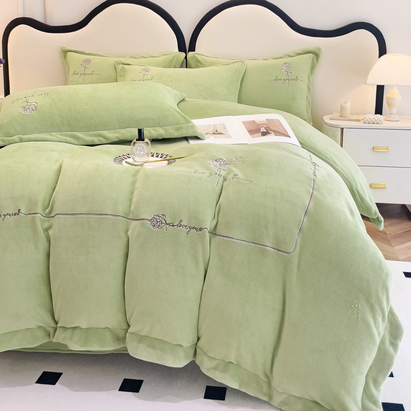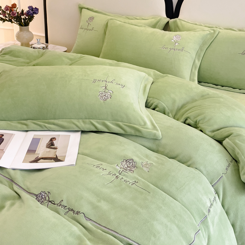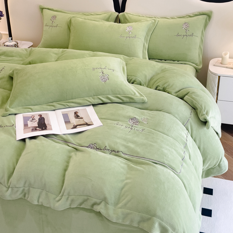 商品名称:八方汇(一户被芯生活馆) 2024新款加厚牛奶绒轻奢花卉刺绣四件套-玫瑰庄园 绿