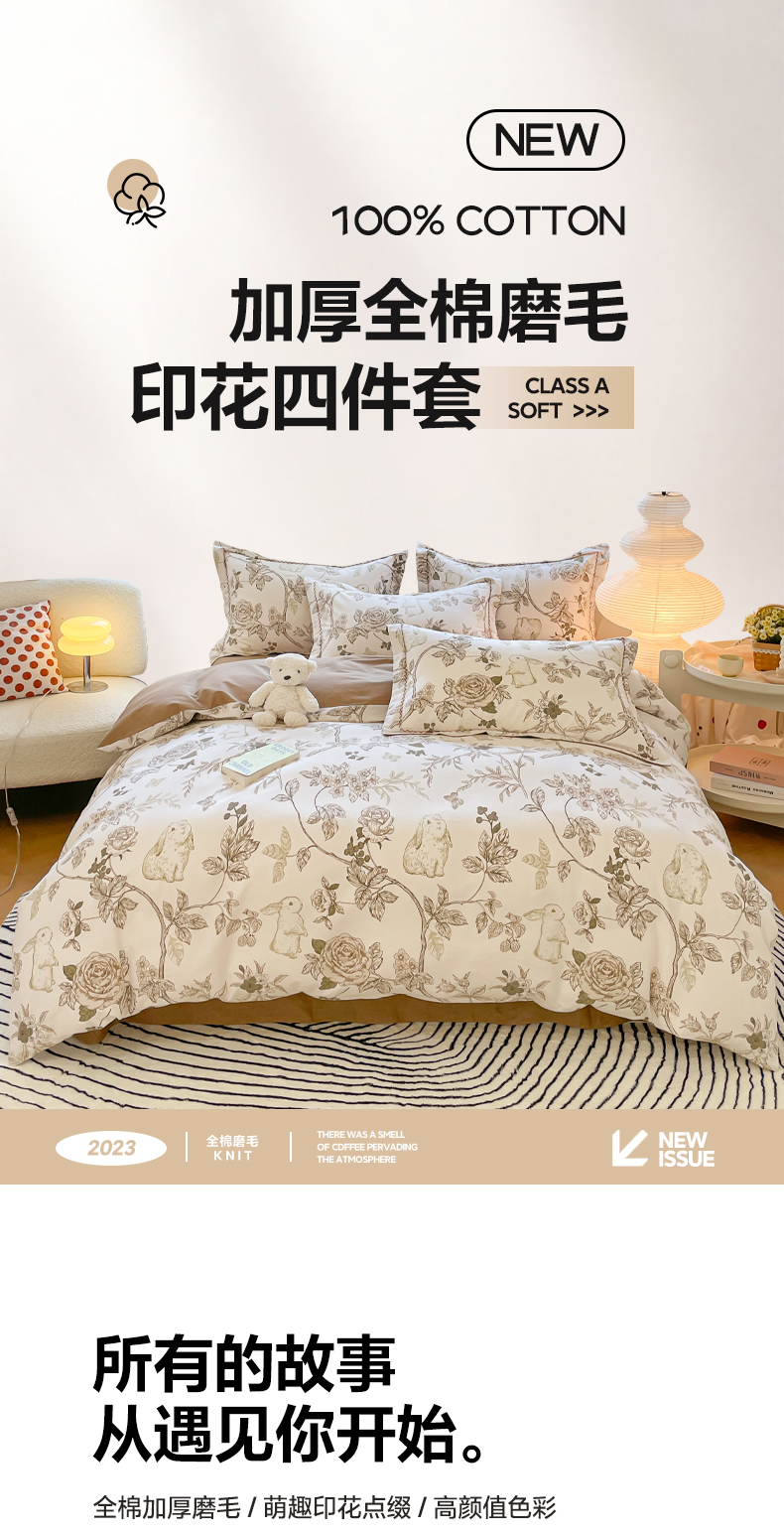 (总)宜家坊 2023新款直播韩版印花花边款牛奶绒四件套,比格熊,草莓兔,春暖花开,告白,加油鸭,流星花园,萌萌熊,牛油果,千鸟格,小女孩,一见倾心,郁金香