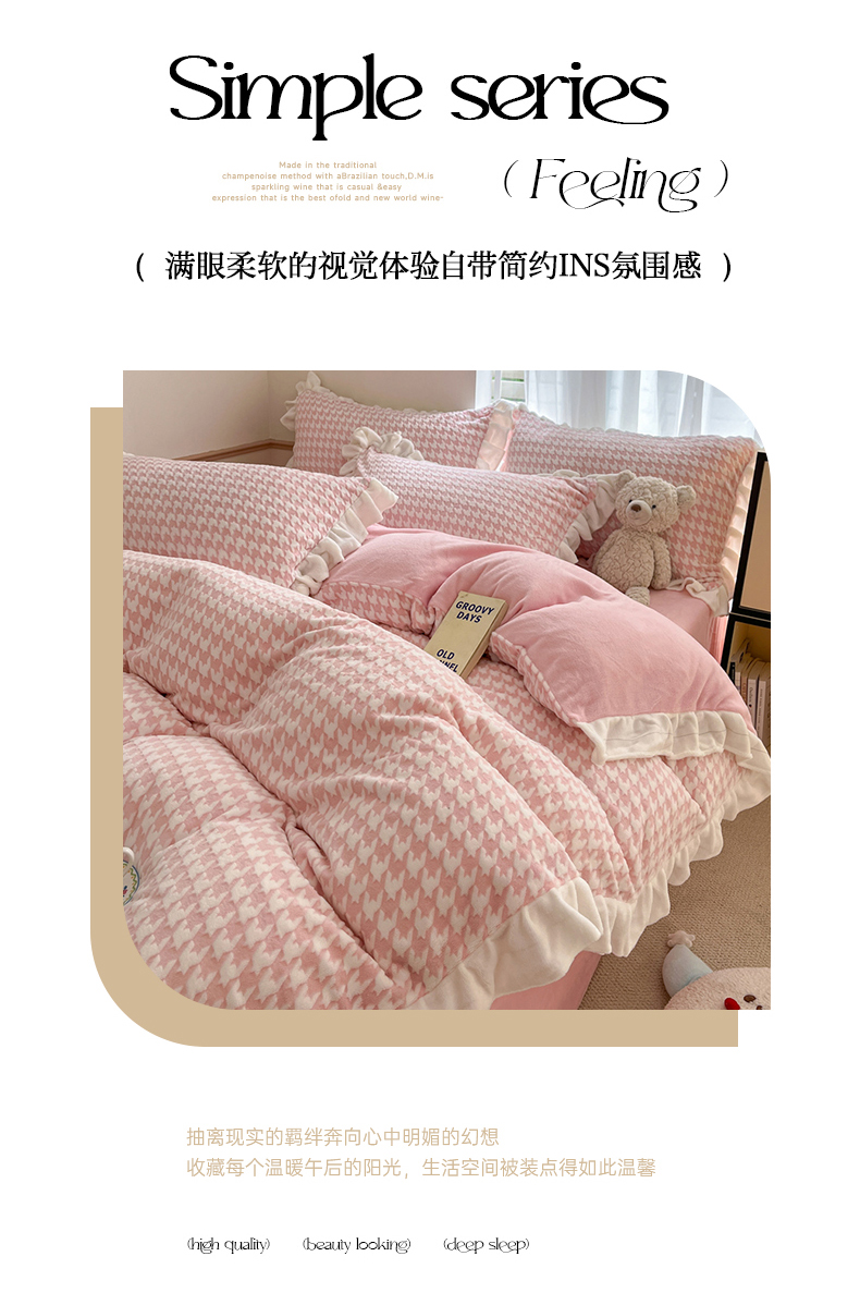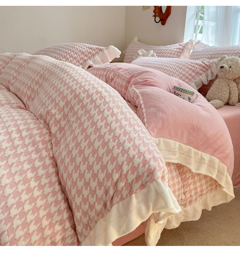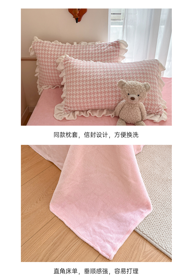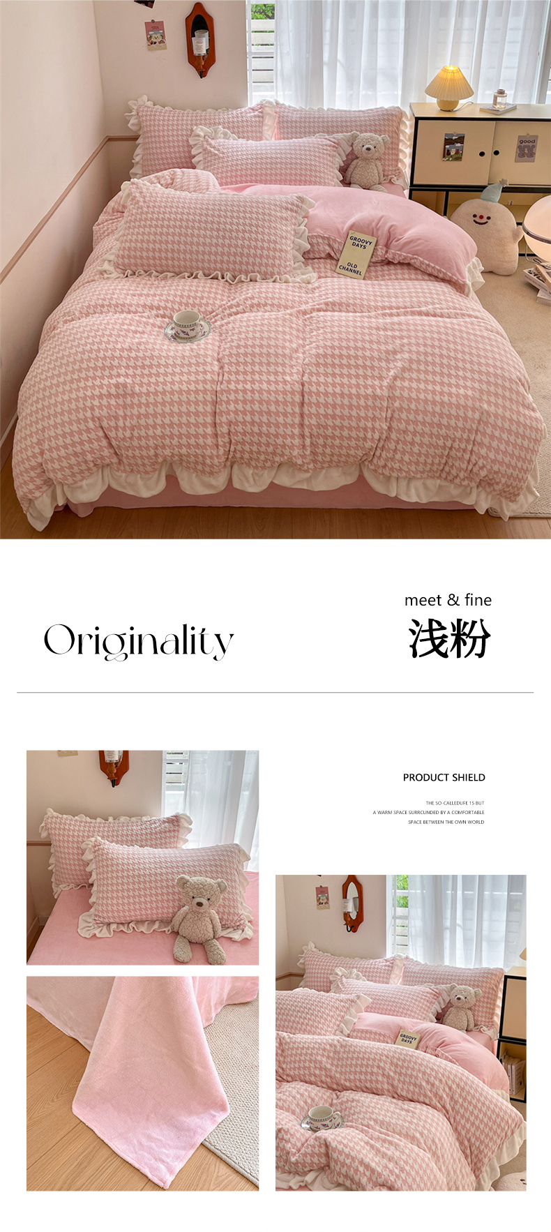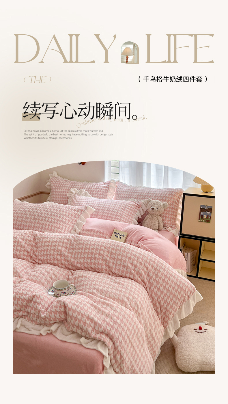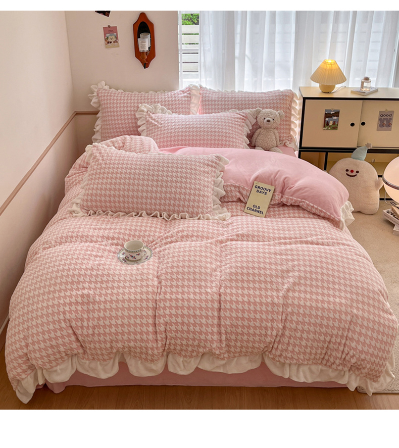 商品名称:星座家纺 2025新款千鸟格花边款牛奶绒四件套 千鸟格-浅粉