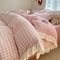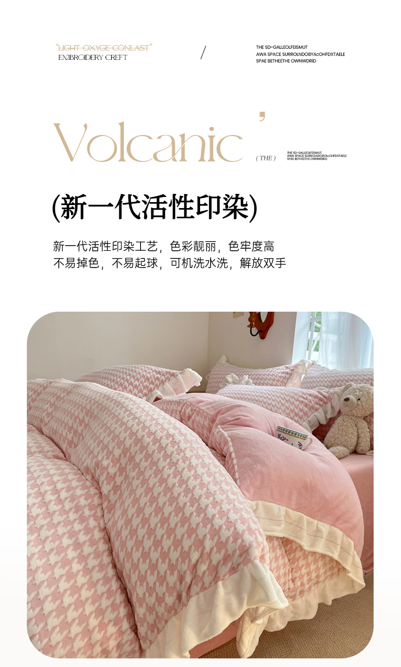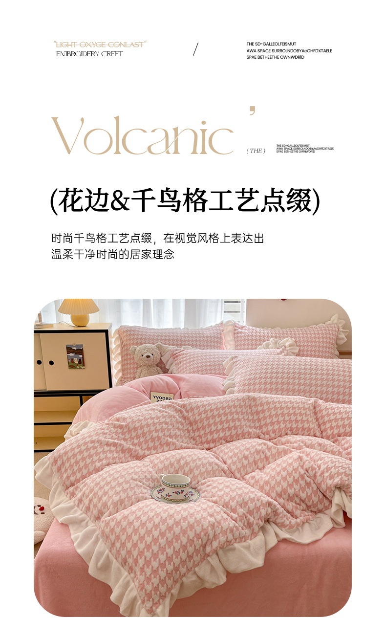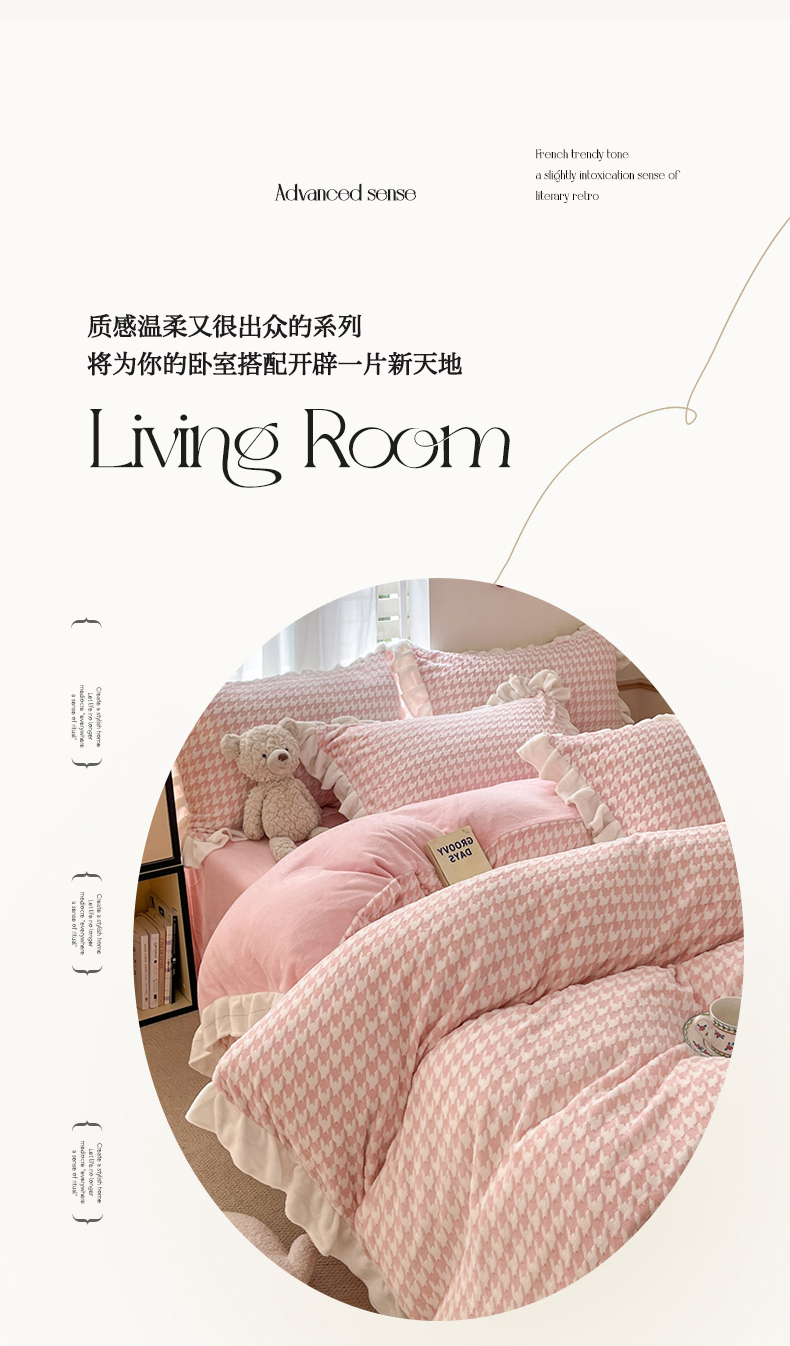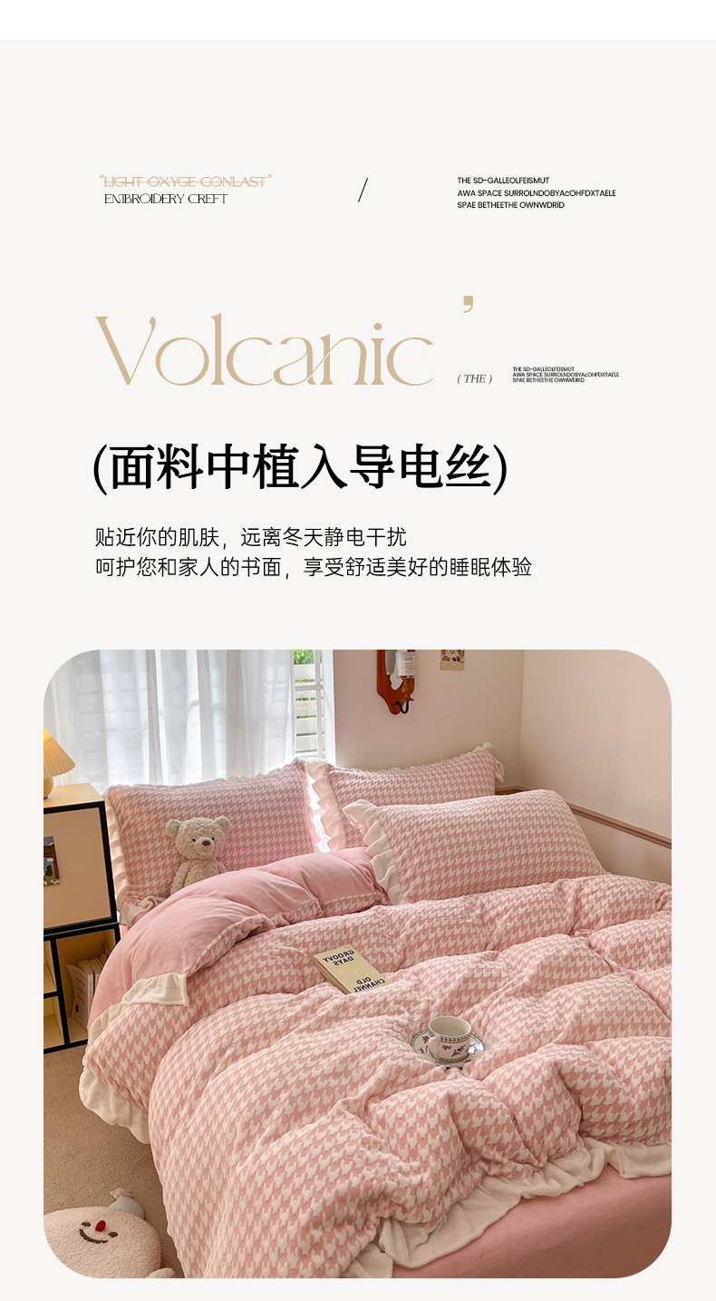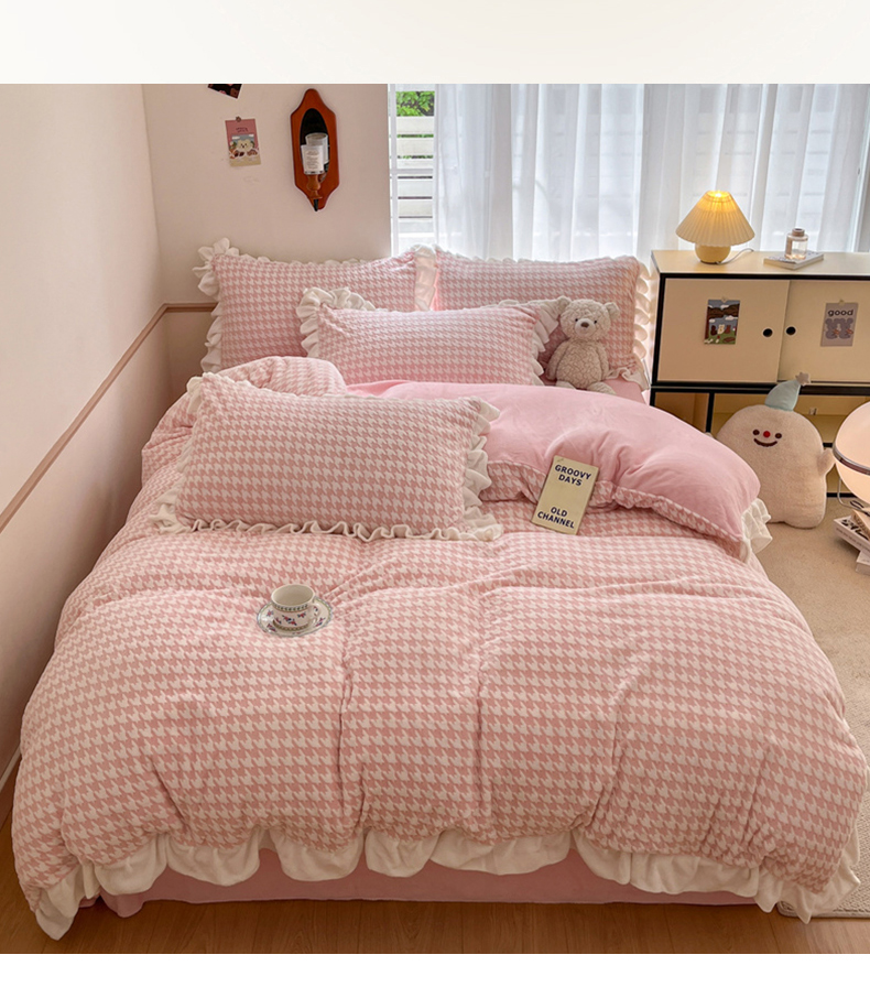 商品名称:星座家纺 2025新款千鸟格花边款牛奶绒四件套 千鸟格-浅粉
