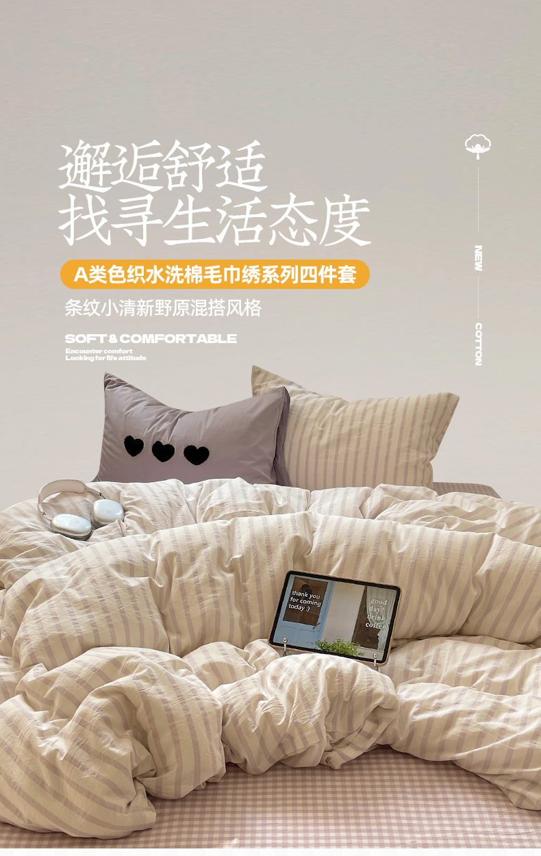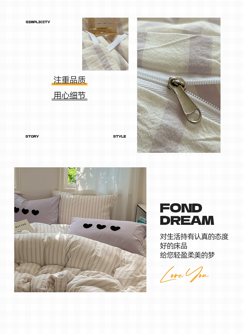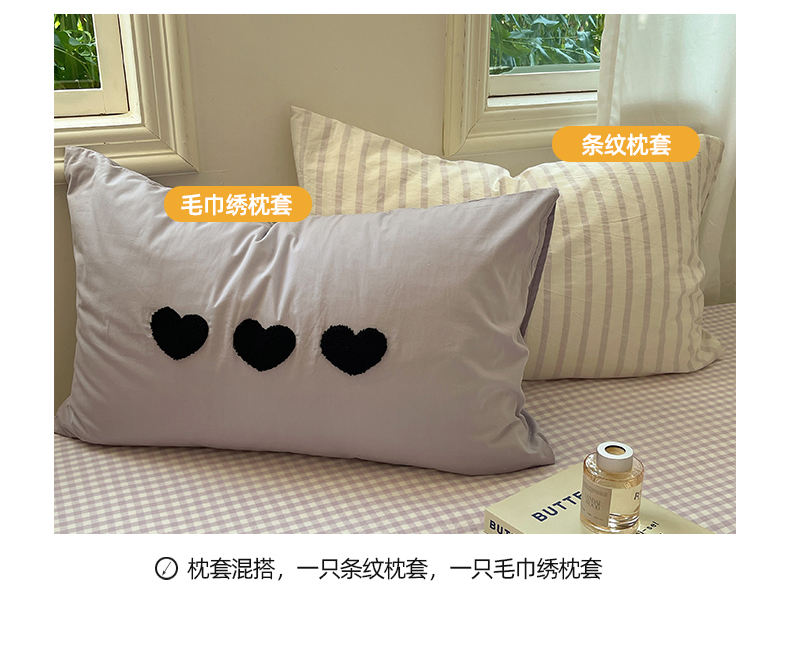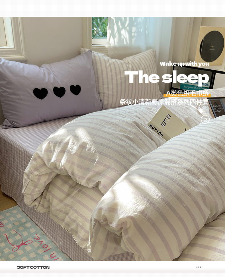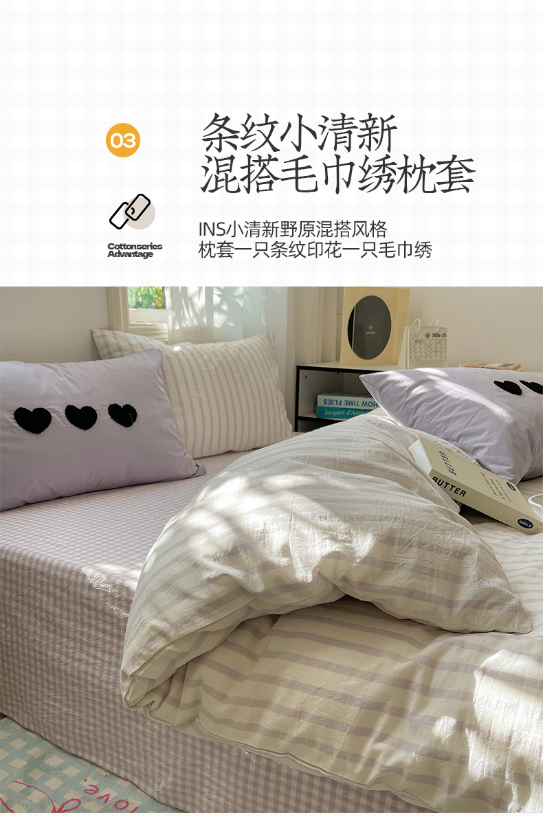当前位置: 91家纺网 > 商品网购 > 床品套件 > 四件套 > 其它四件套 > 桃子家居 2024新款A类色织毛巾绣条纹小清新野原混搭纯棉系列四件套 色织水洗棉-野原紫爱心