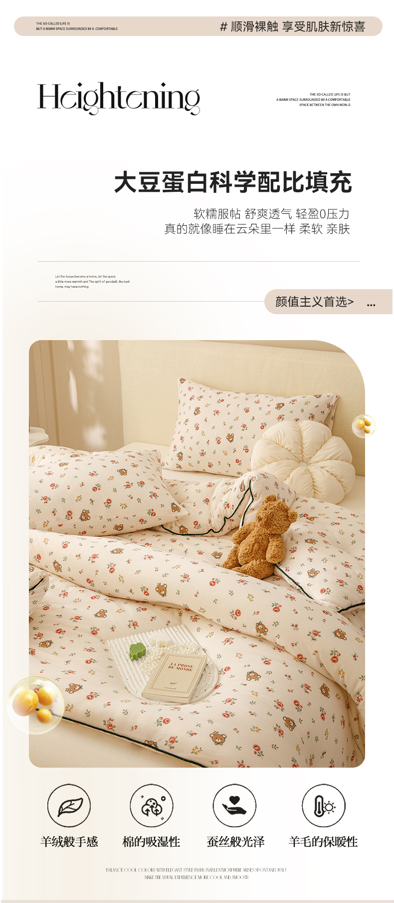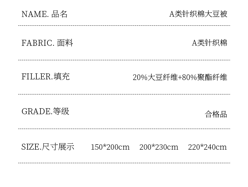 • 填充纤维种类: 大豆蛋白改性聚酯纤维