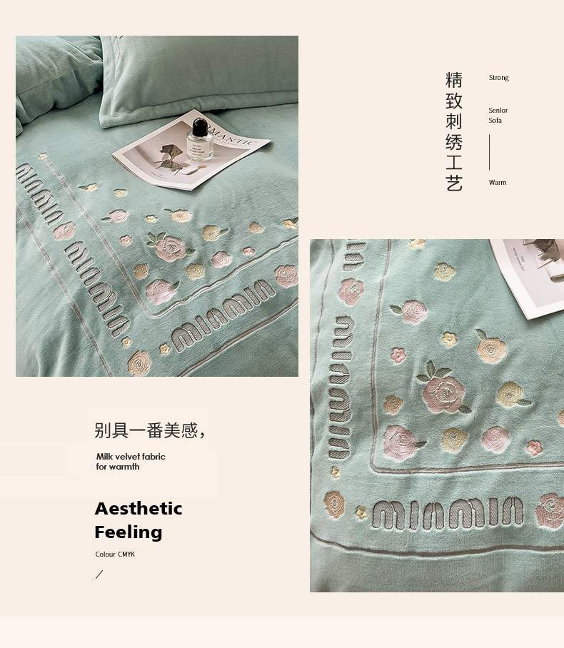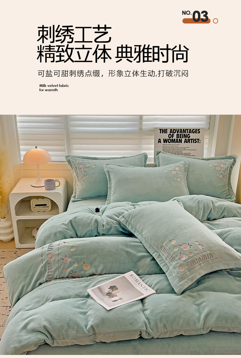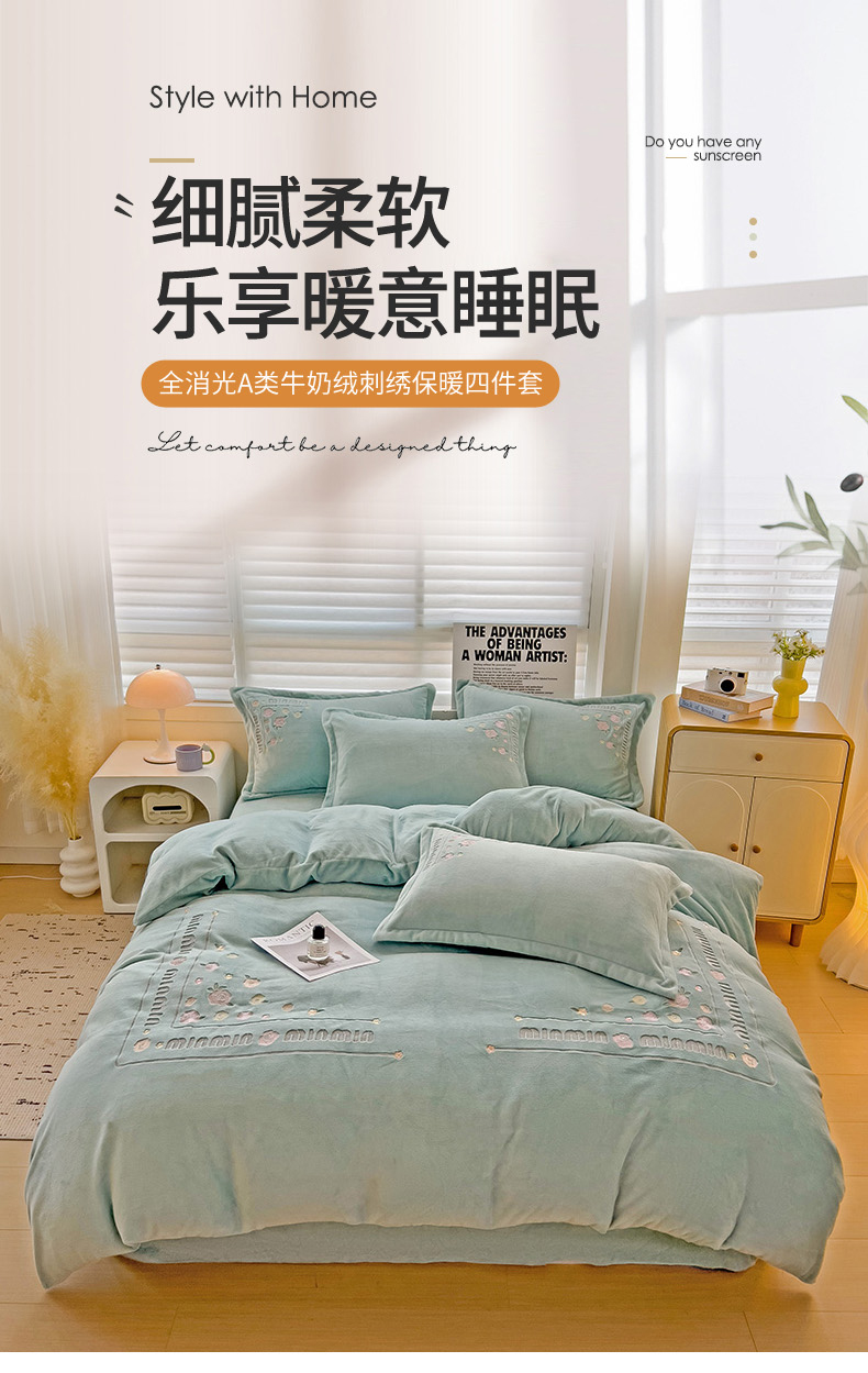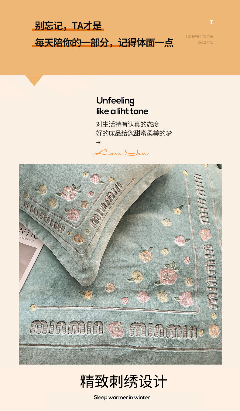 (总)星尚家纺 2024新款全消光230g牛奶绒刺绣保暖四件套-花漾,晨雾绿,豆沙粉,樱花粉