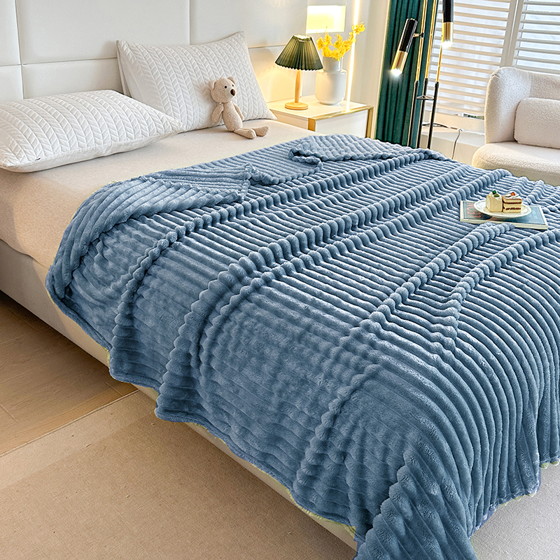 商品名称:芸锦豪 2024新款仿兔毛抽条毛毯-卷边款 蓝色