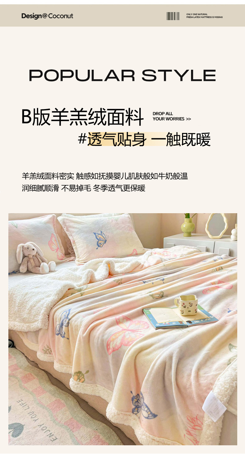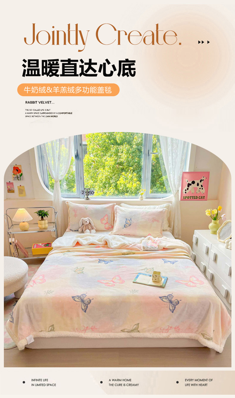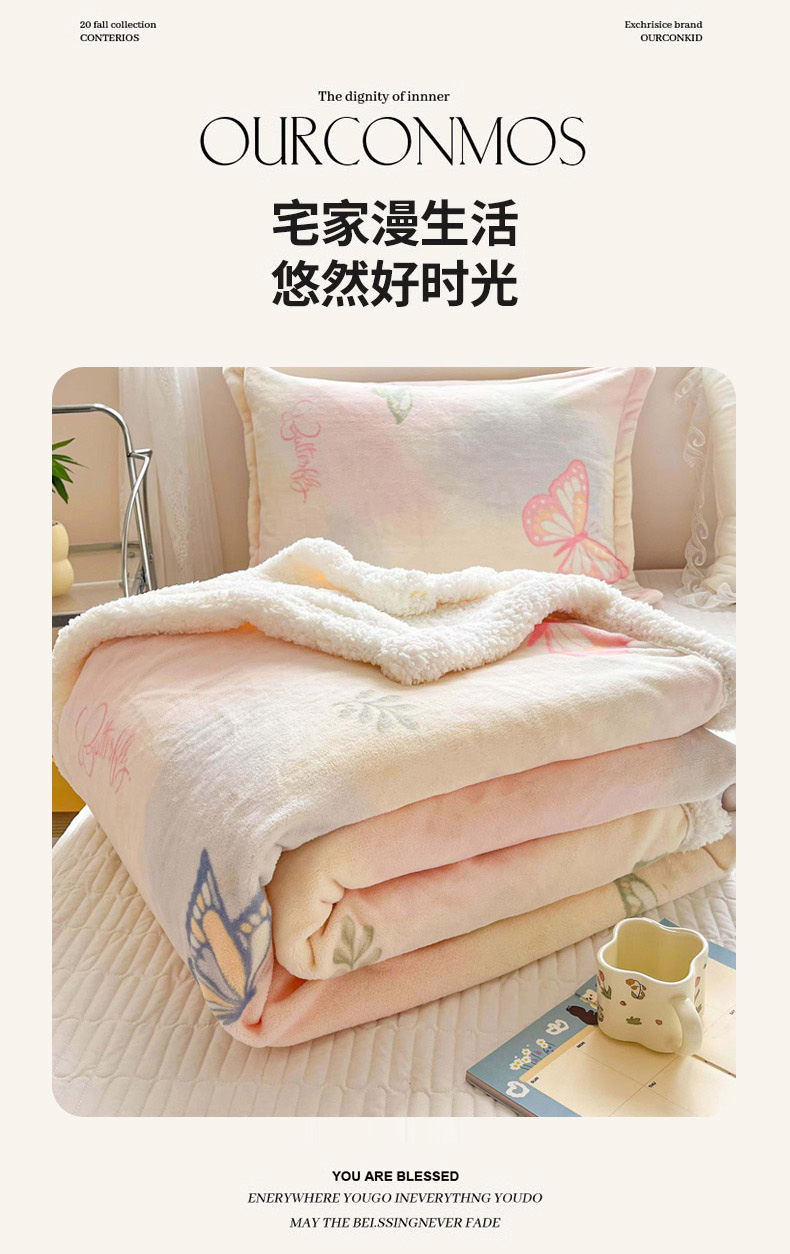 商品名称:沐慕 2024新款AB版牛奶绒拼羊羔绒毛毯毯子 毛毯-蝴蝶飘飘