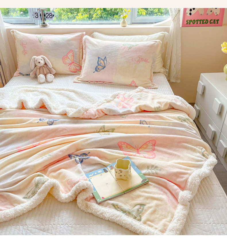 沐慕 2024新款AB版牛奶绒拼羊羔绒毛毯毯子 毛毯-蝴蝶飘飘
