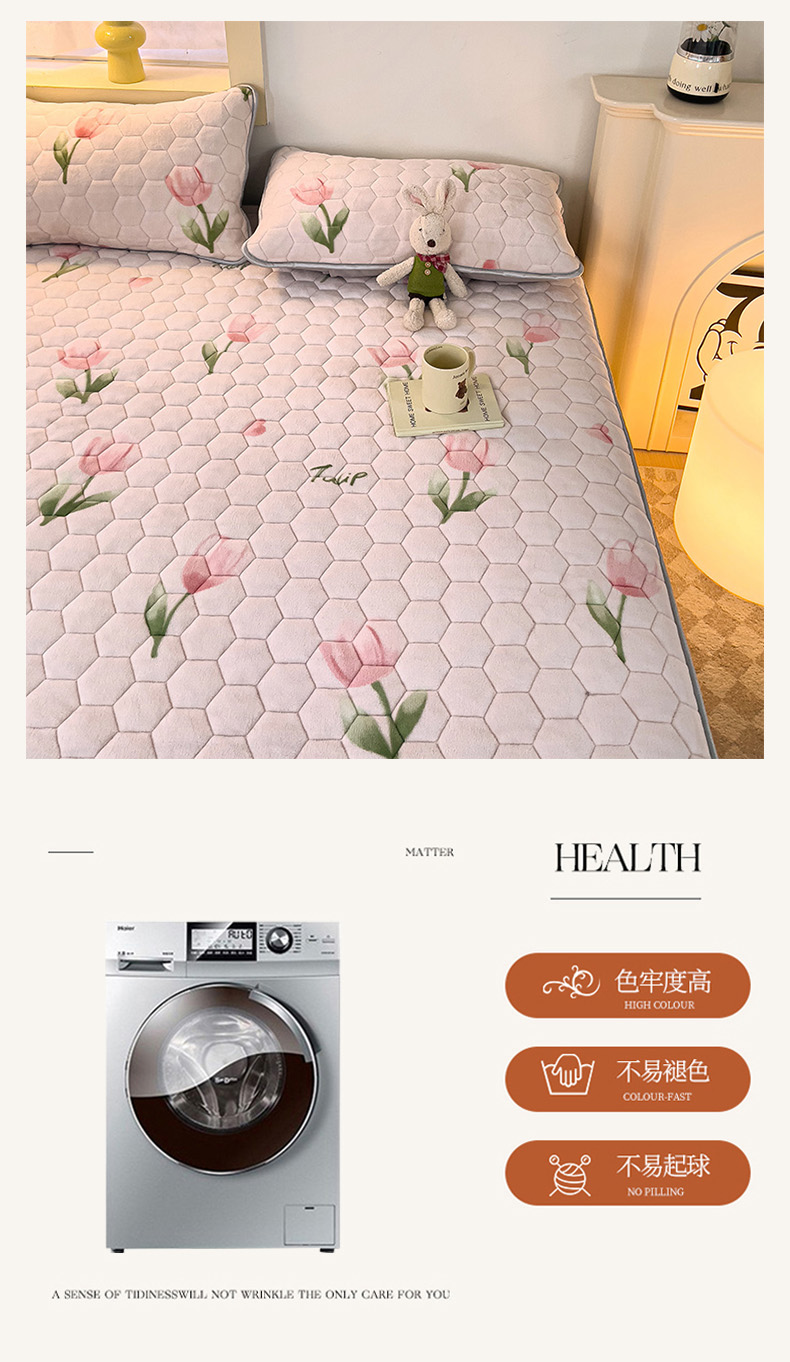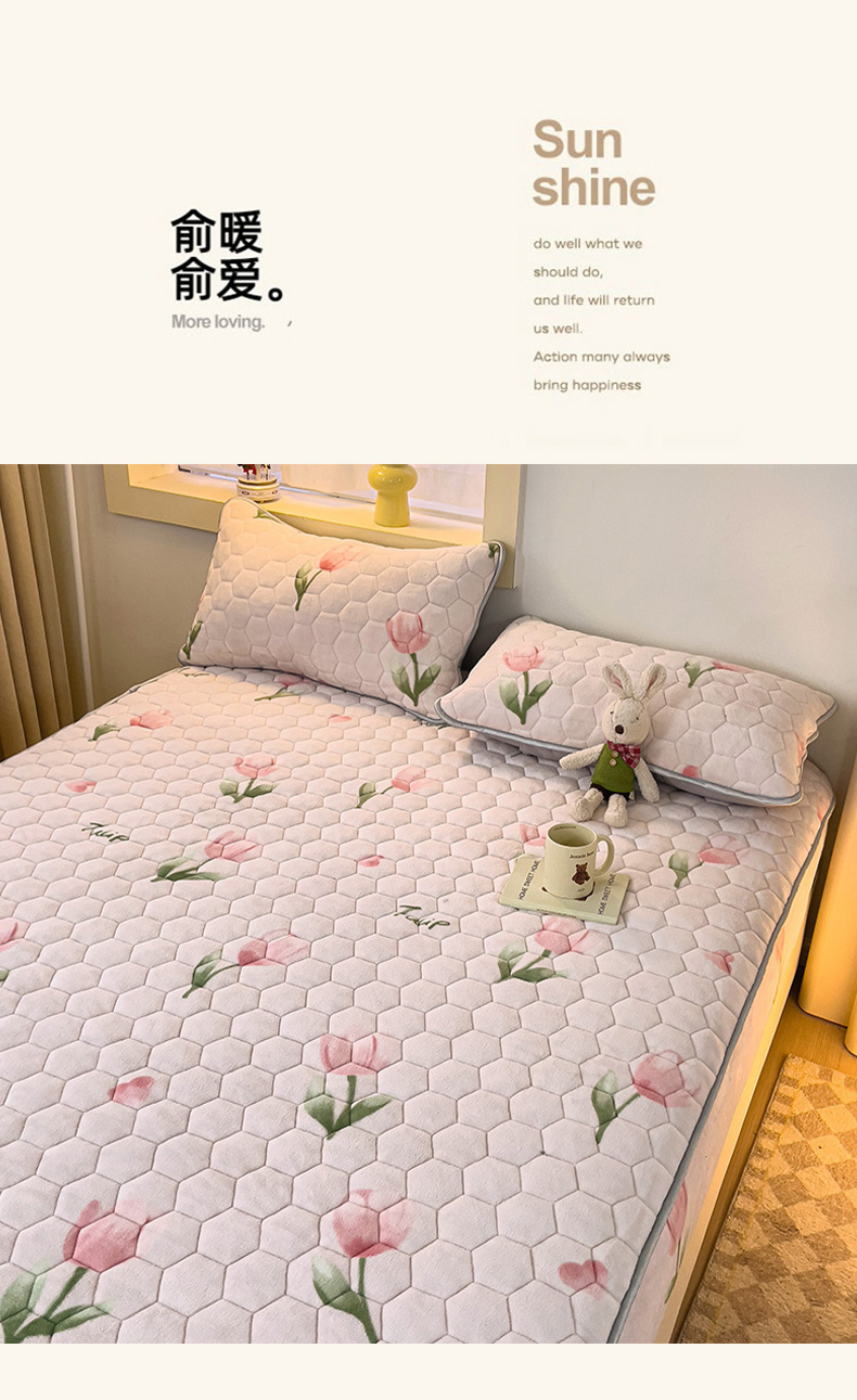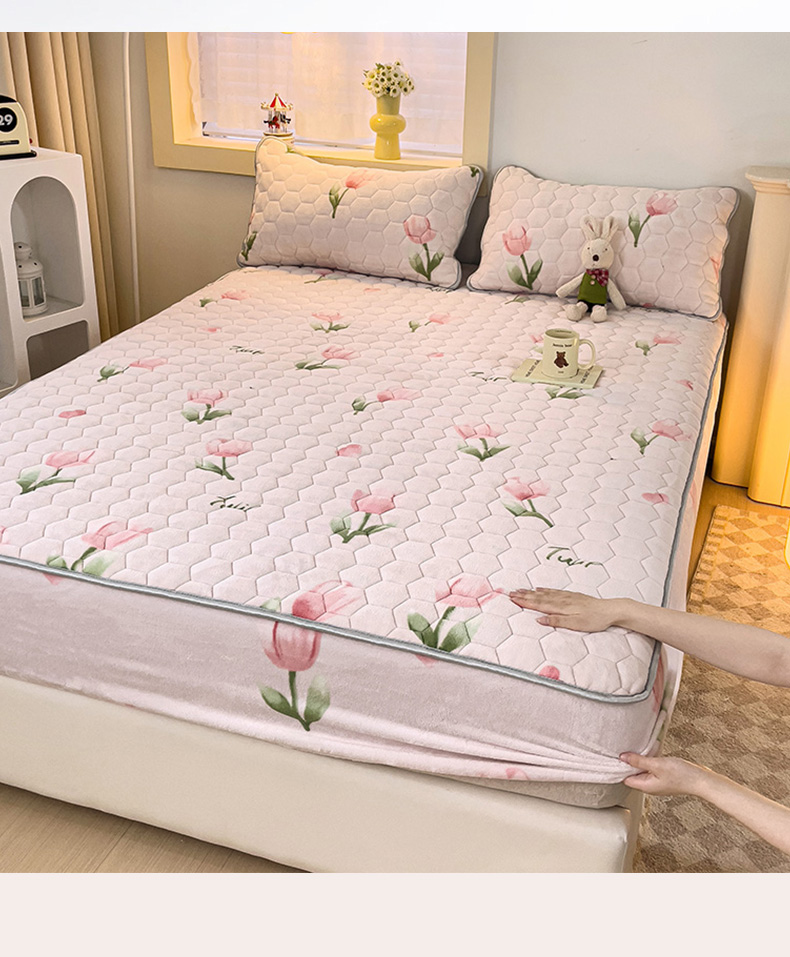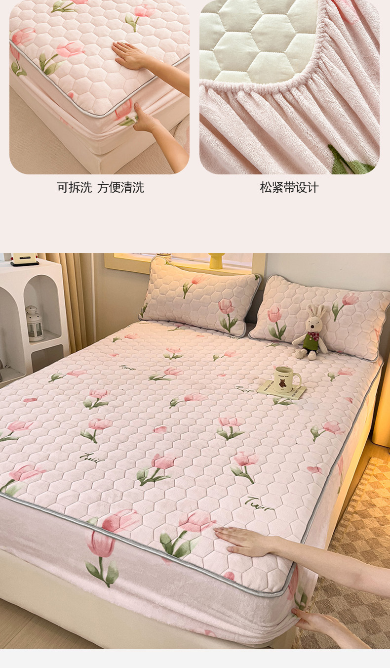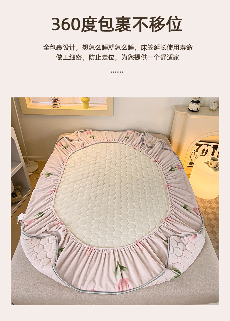 梦舒羽 2025新款牛奶绒夹棉床笠三件套床罩床单床盖护垫套 花语