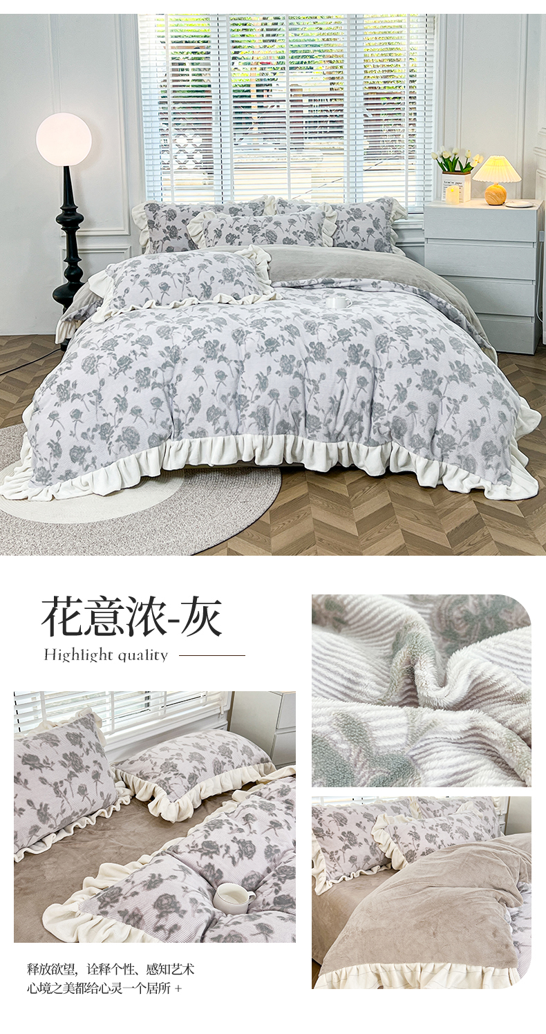 商品名称:金麦家纺 2024新款冬日暖阳系列A类牛奶雕花绒四件套 花意浓-灰