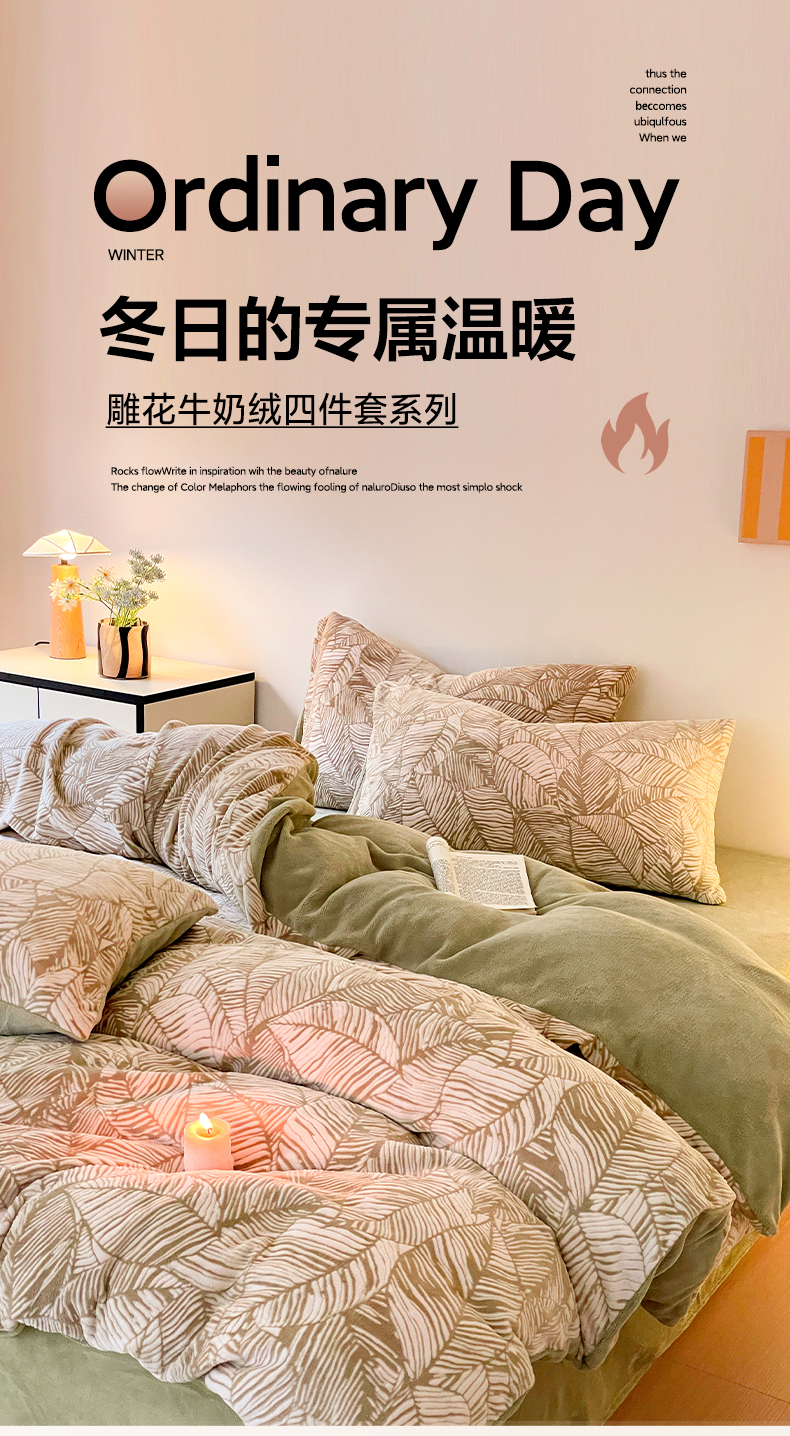 雅居纺家纺 2024新款花卉雕花绒四件套 深色树叶