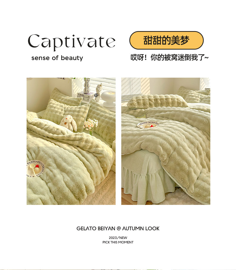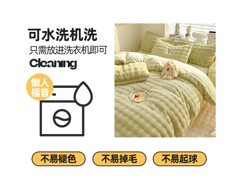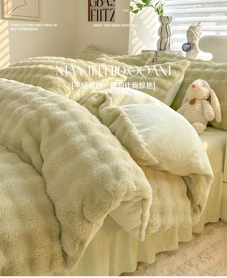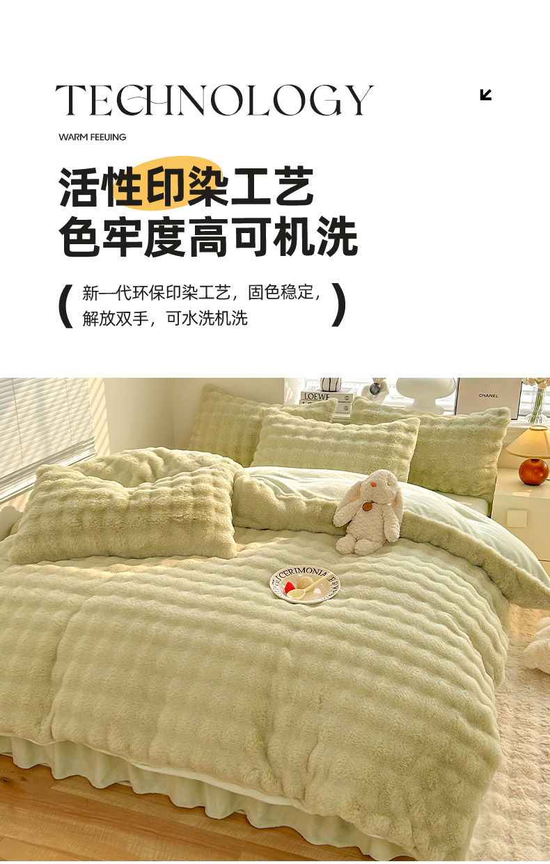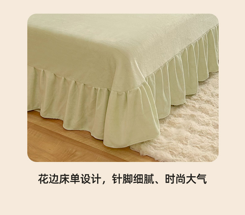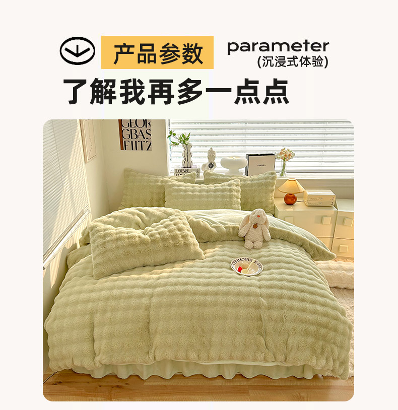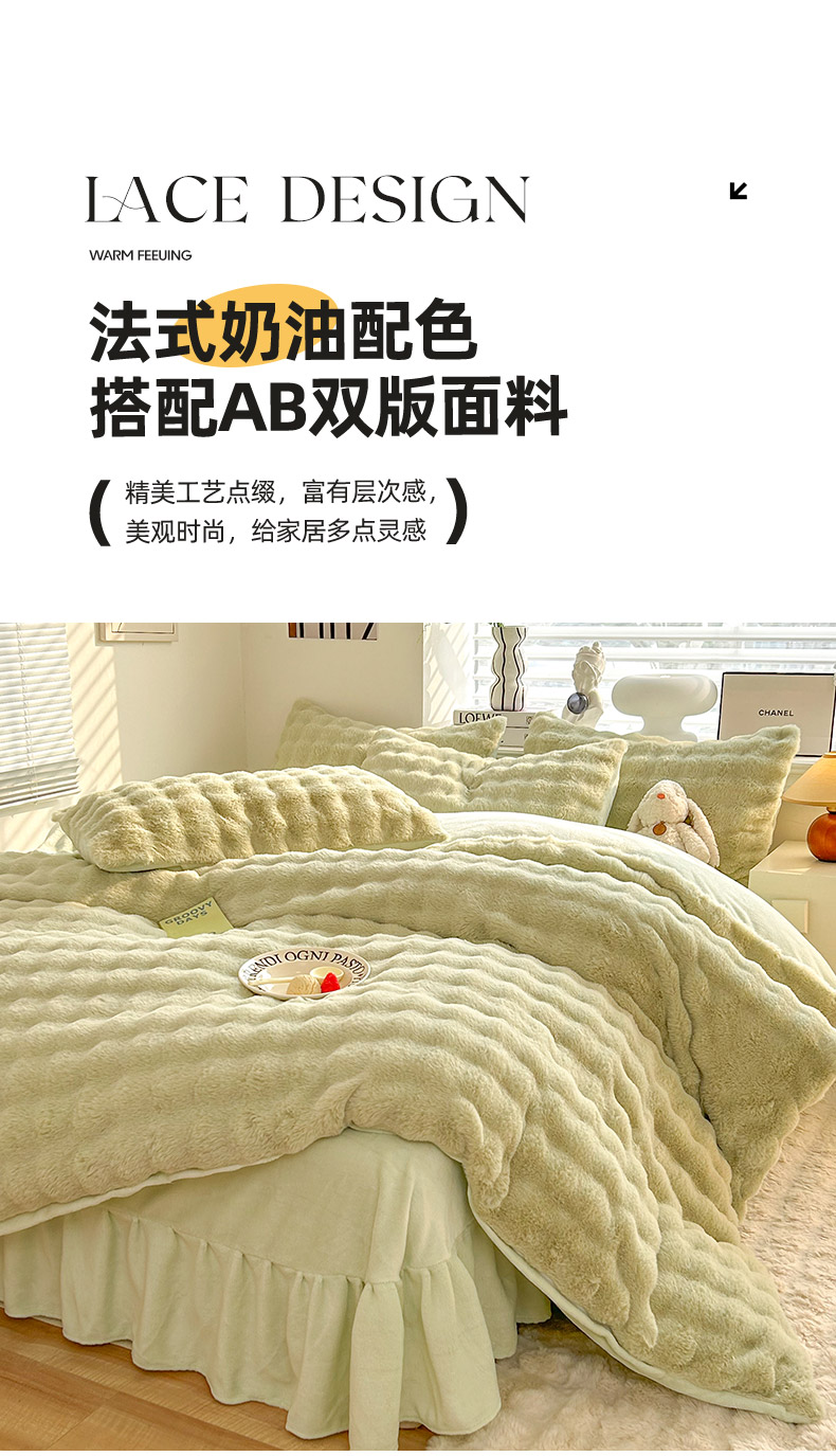 商品名称:欧冠家纺 2024秋冬新款纯色泡泡绒和七彩泡泡床裙款四件套 泡泡-抹茶绿