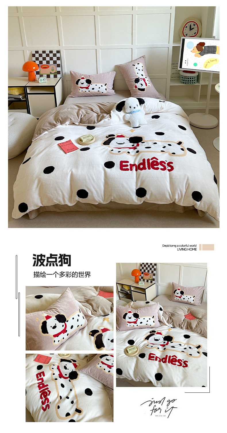 美乐迪家纺 2024新款高克重牛奶绒卡通印花四件套 波点狗