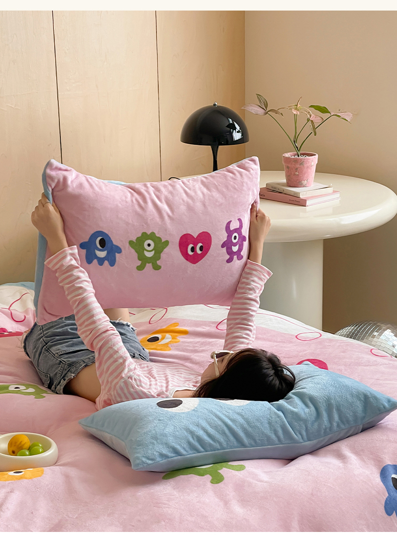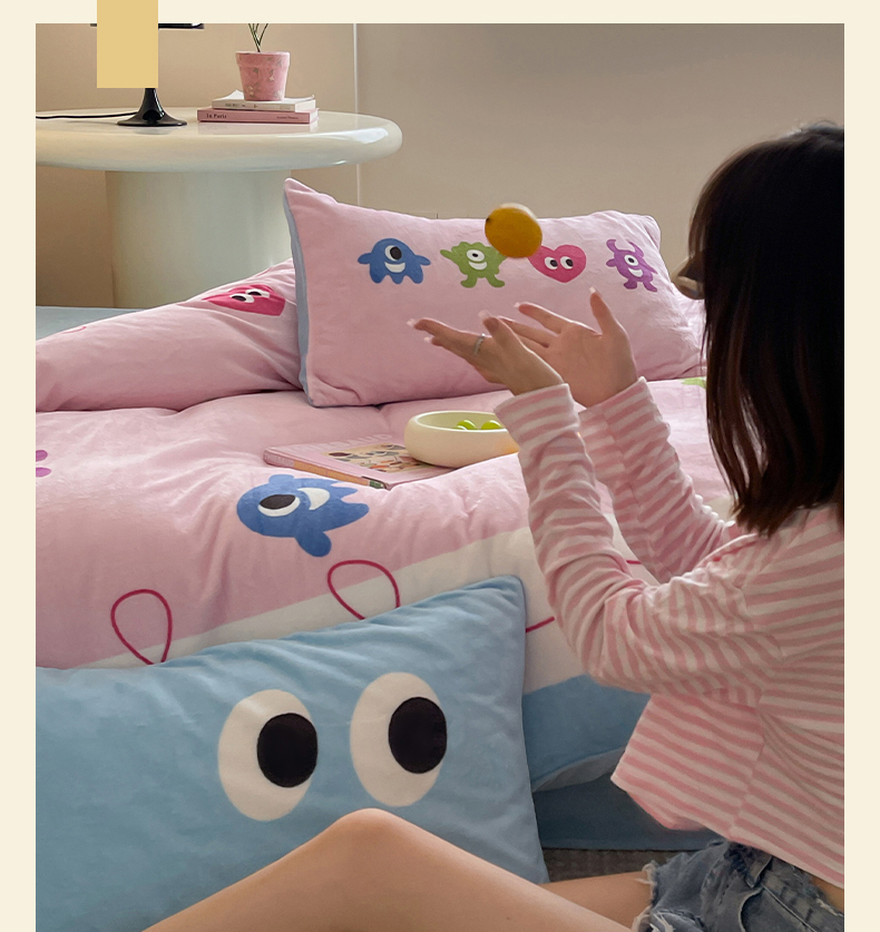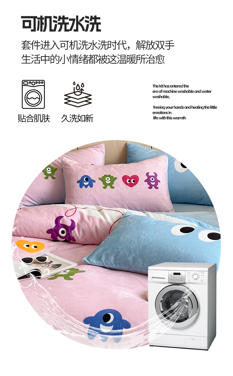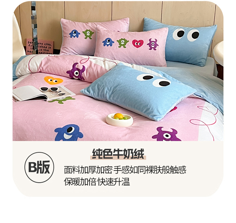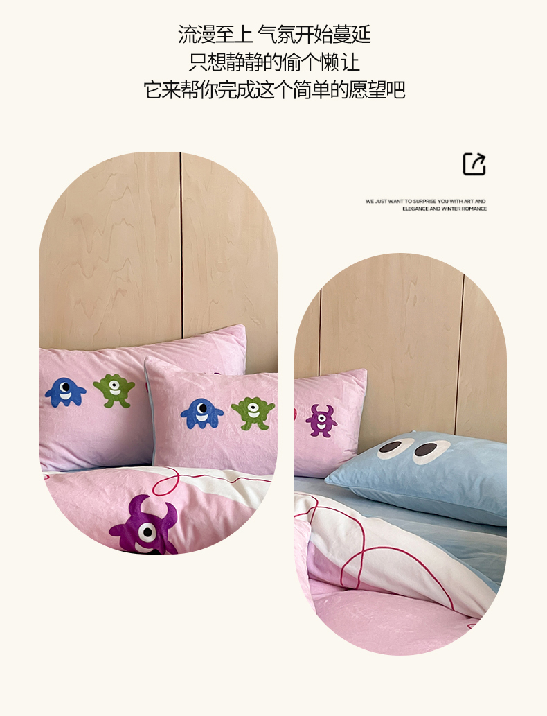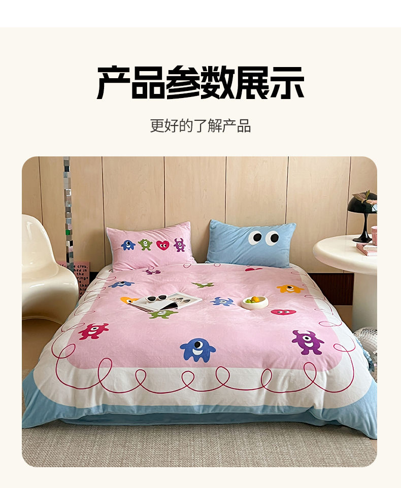 商品名称:羚羊语家纺 2024新款ins博主风牛奶绒四件套数码印花小红书爆款秋冬加厚宝宝绒婴儿绒法莱绒法兰绒珊瑚绒三件套 小怪兽