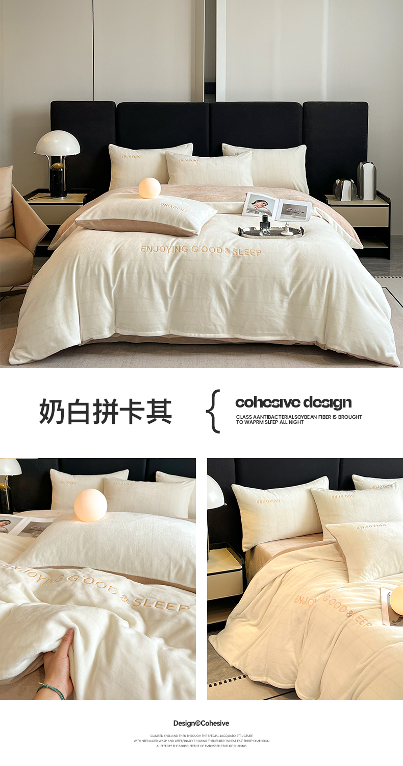 澳梵家居 2024新款牛奶绒刺绣四件套--【山岚系列】 奶白拼卡其