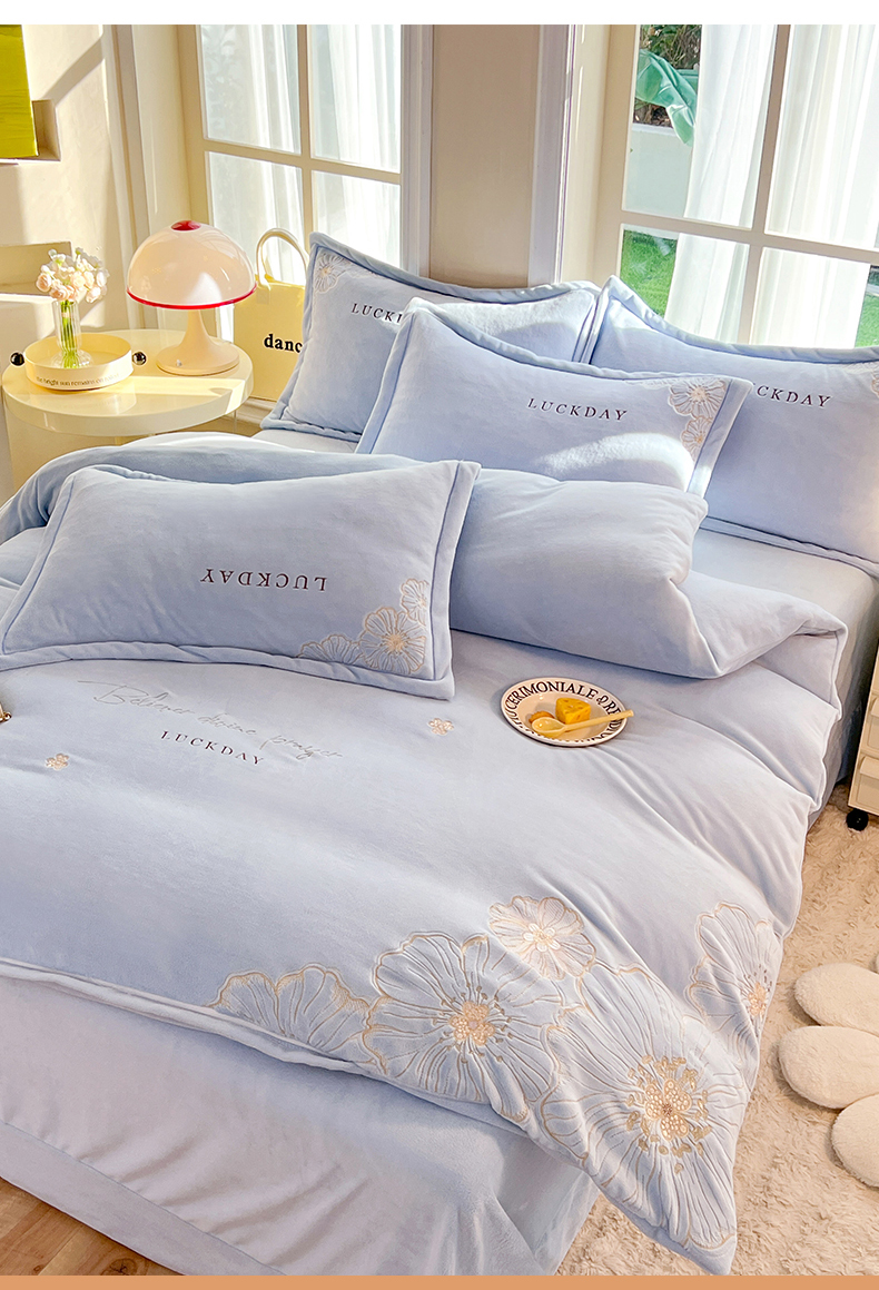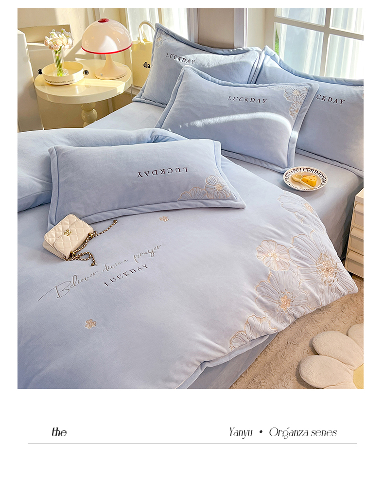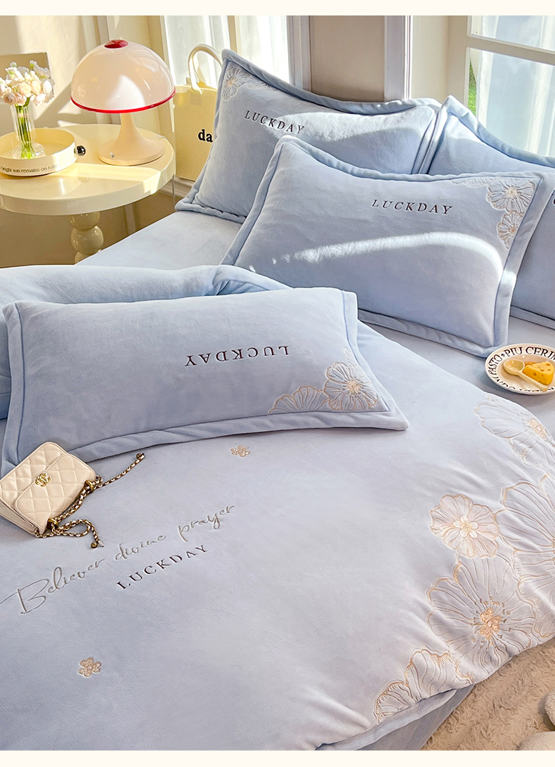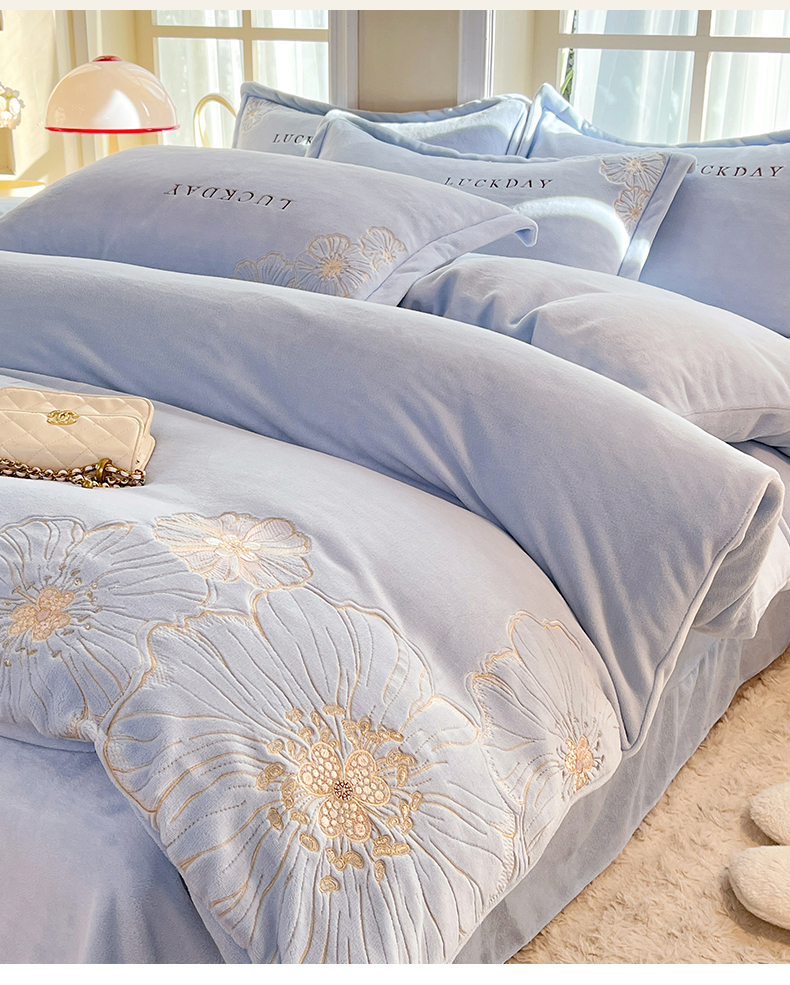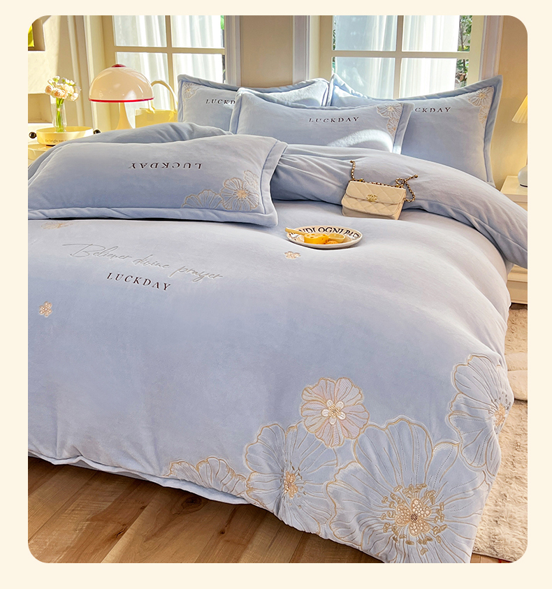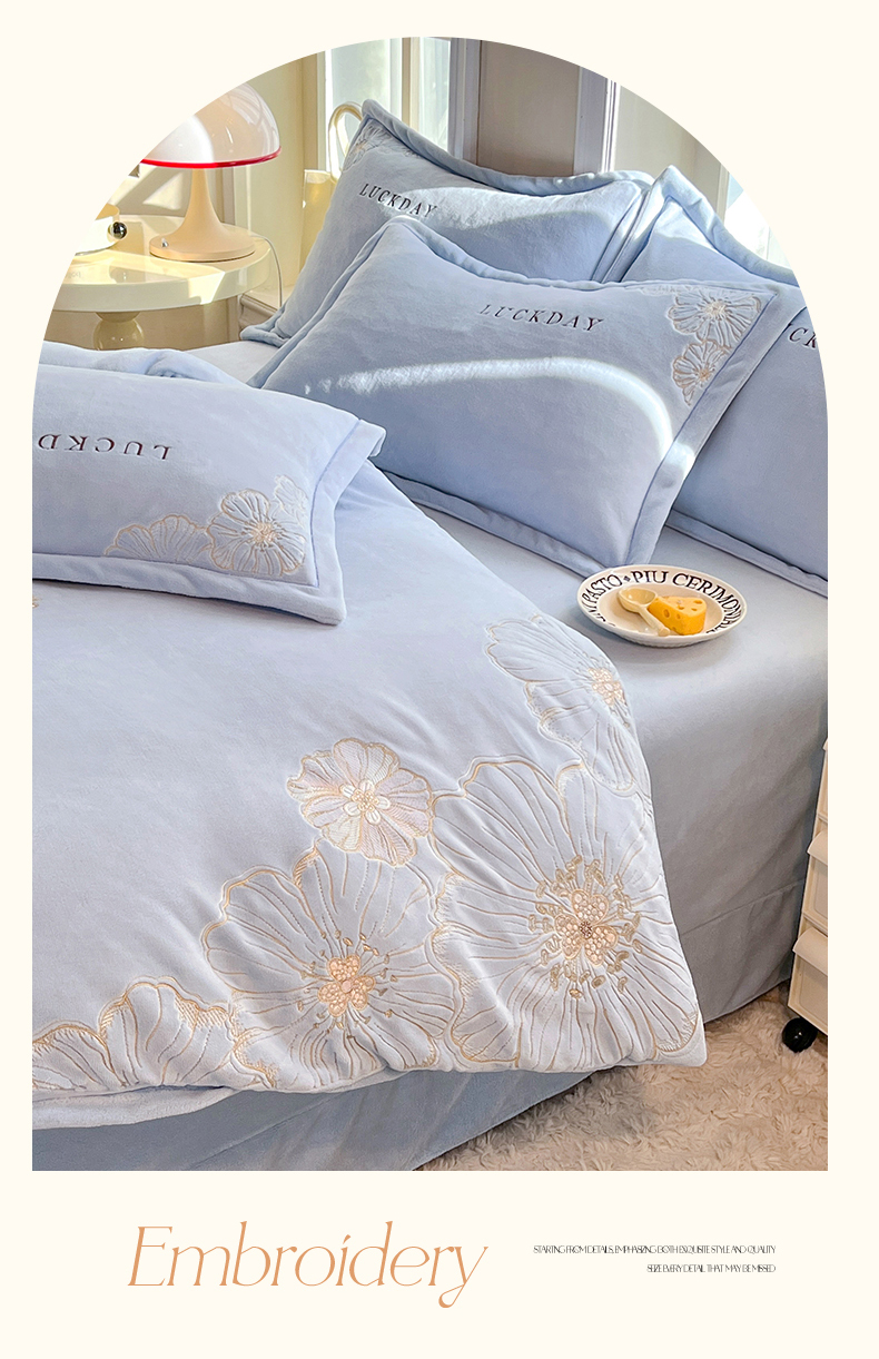 (总)绒棉世家 2025独家新款设计款高克重牛奶绒贴布绣四件套-花颜如梦系列,花颜如梦-淡蓝