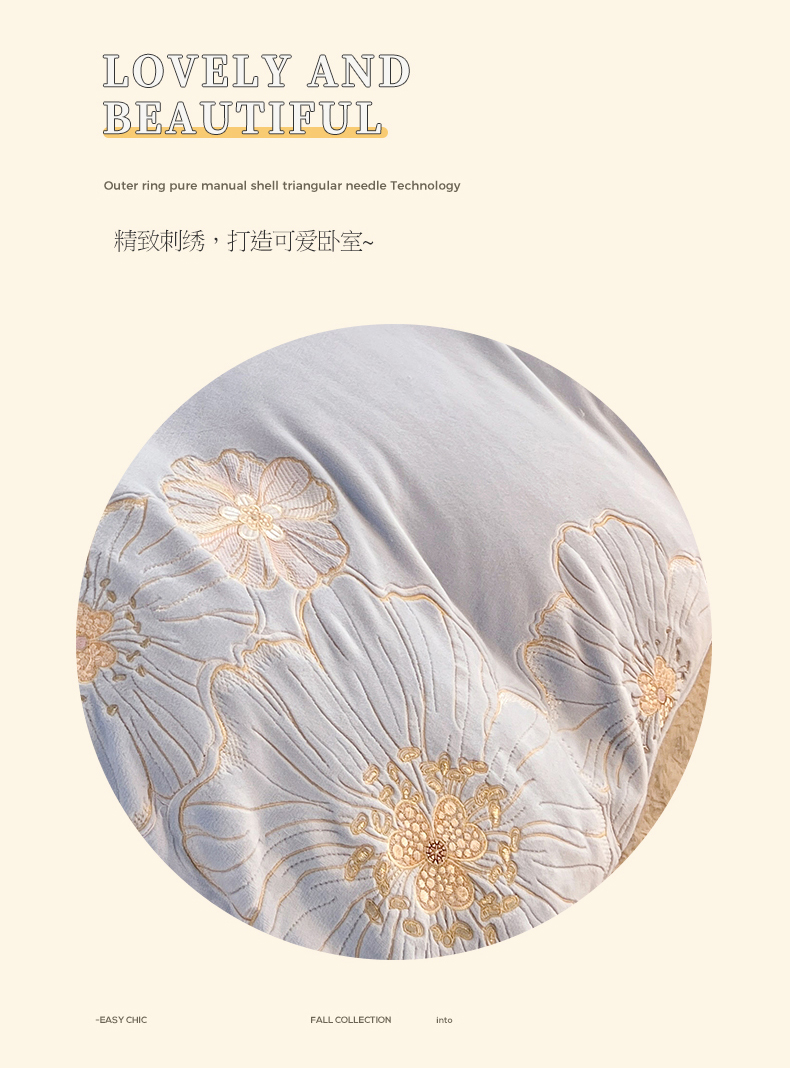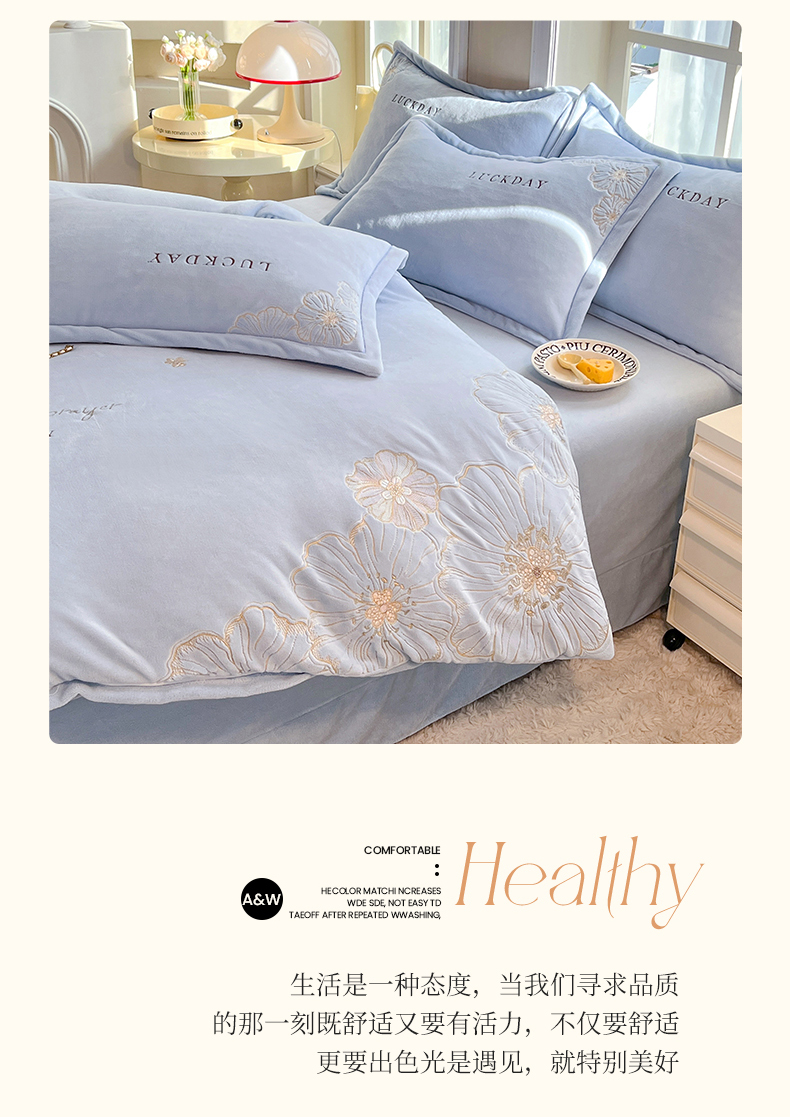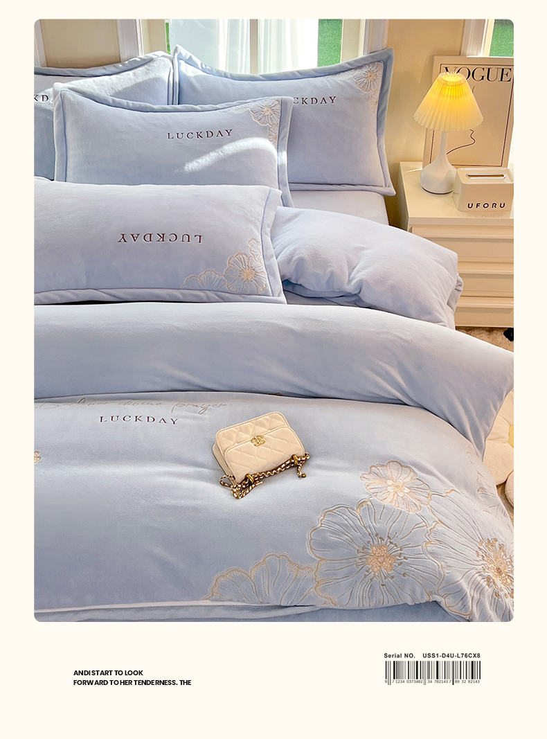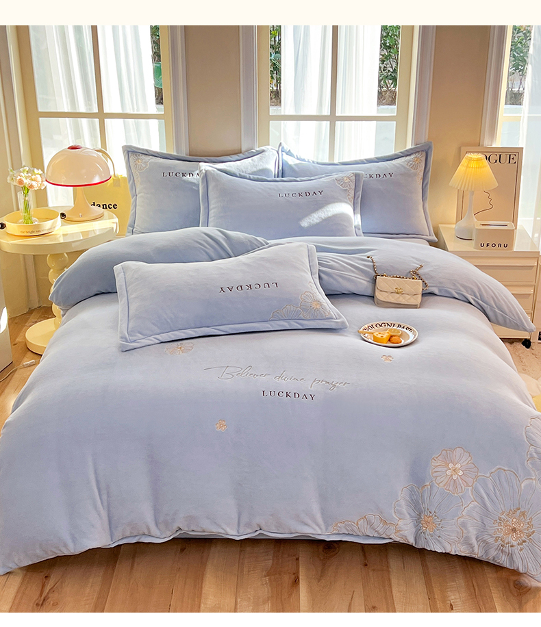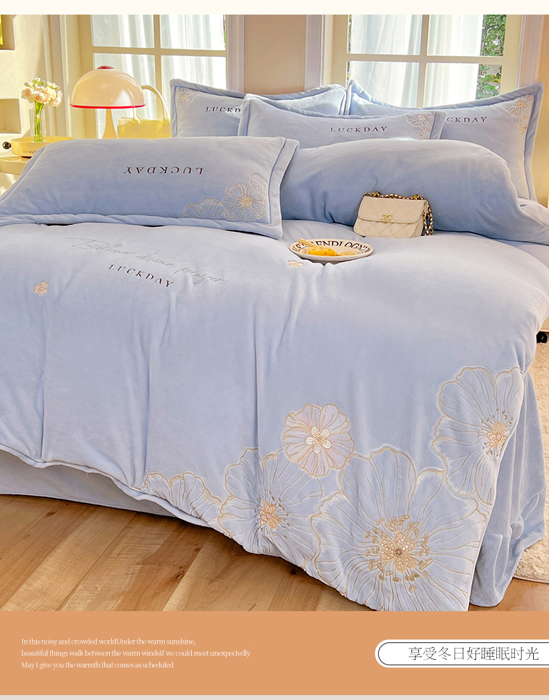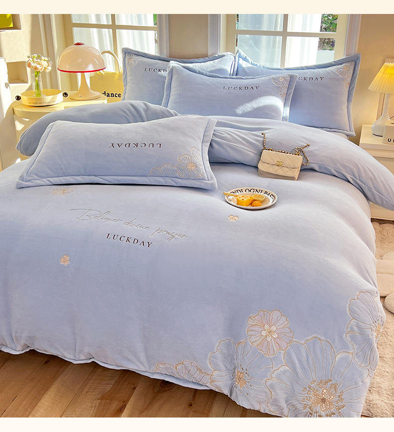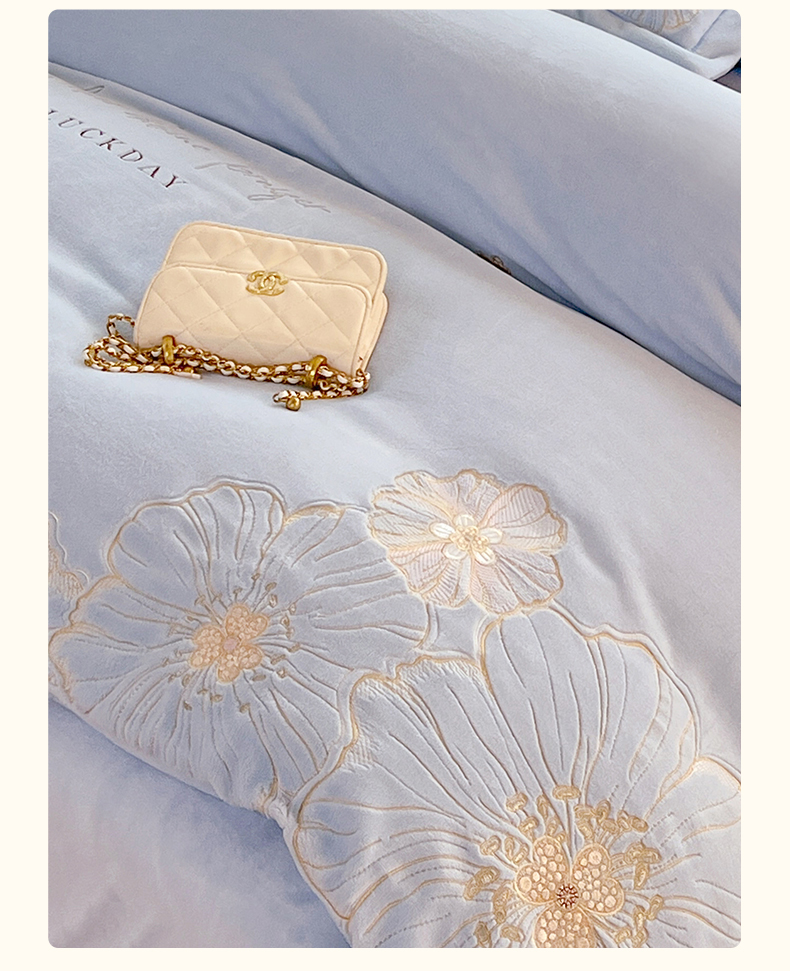(总)绒棉世家 2025独家新款设计款高克重牛奶绒贴布绣四件套-花颜如梦系列,花颜如梦-淡蓝