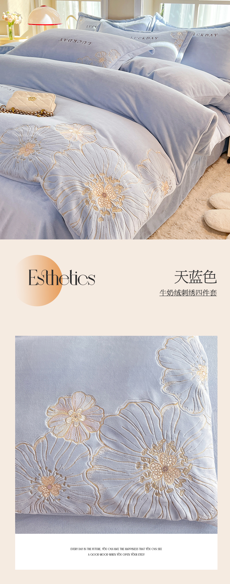 商品名称:绒棉世家 2025新款高端牛奶绒刺绣四件套-莫奈花园系列 莫奈花园-天蓝色