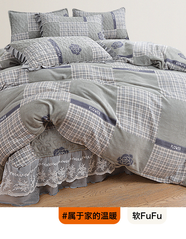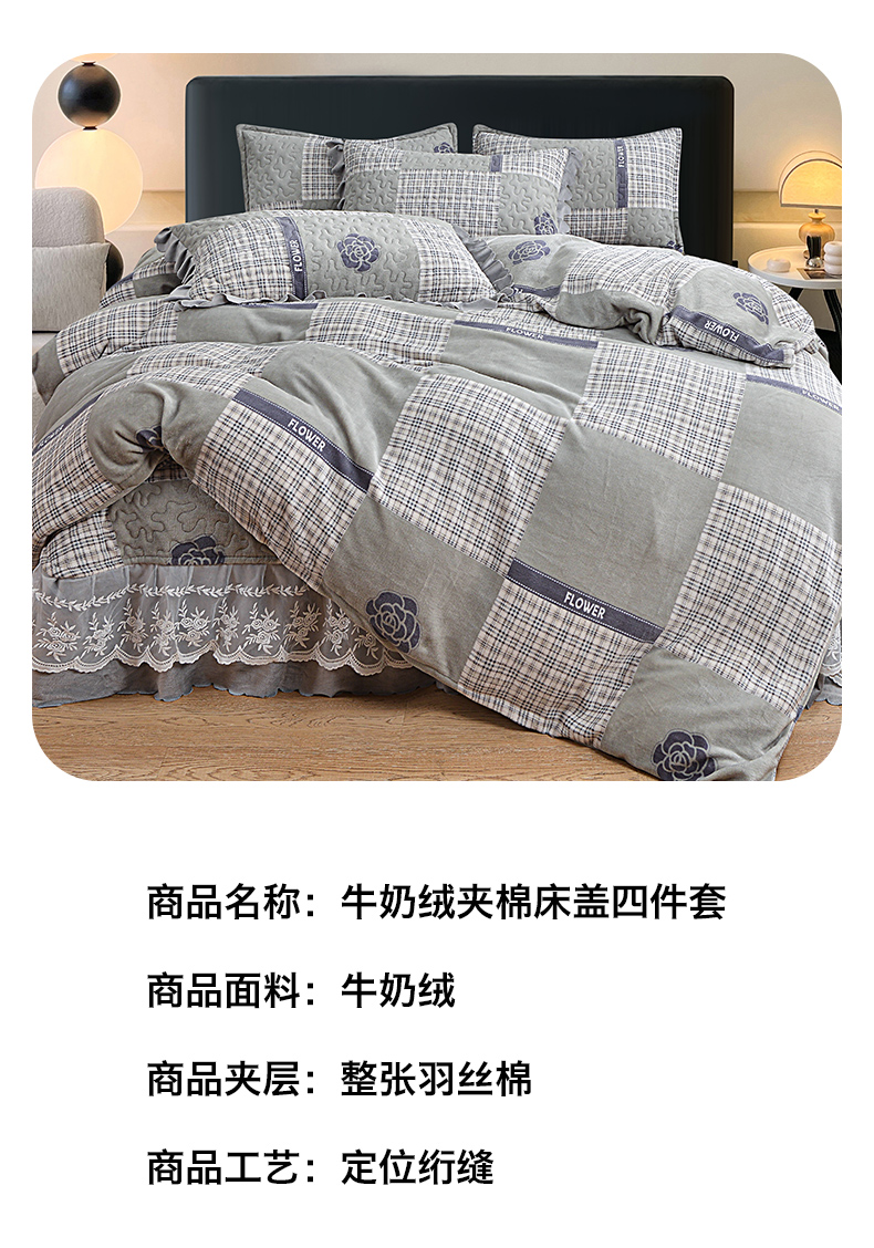 2024新款亲肤牛奶绒夹棉床盖四件套 恋爱山茶