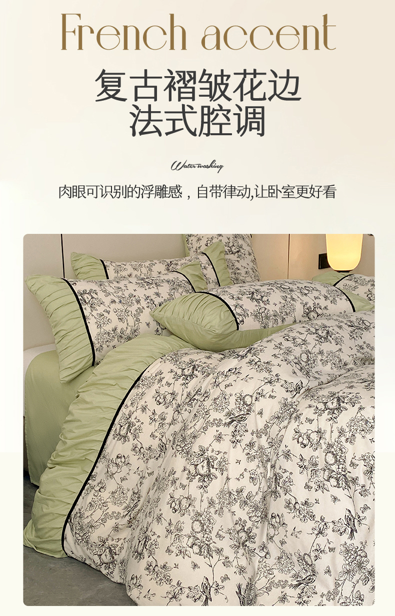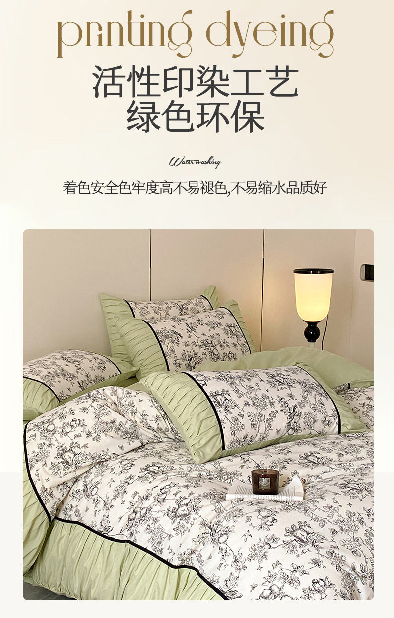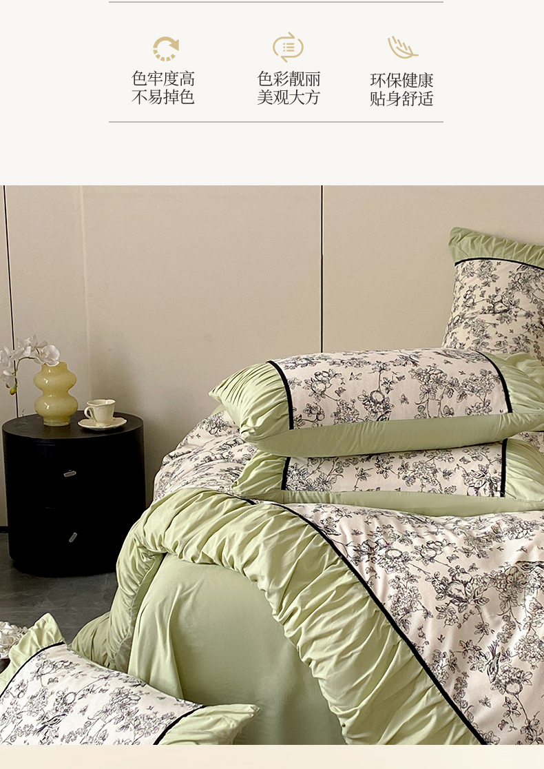 当前位置: 91家纺网 > 商品网购 > 床品套件 > 四件套 > 普通磨毛四件套 > 一左一右 2024秋冬新款法式复古印花褶皱花边水洗磨毛四件套-场景一(提供买家秀) 复古绿