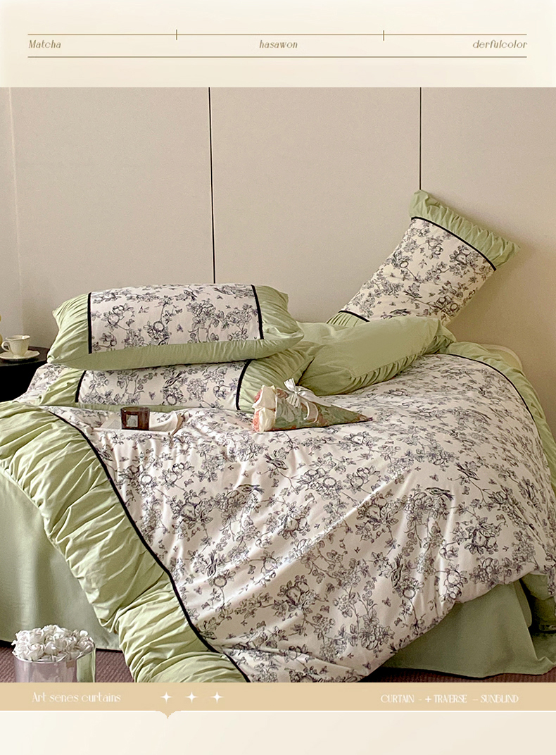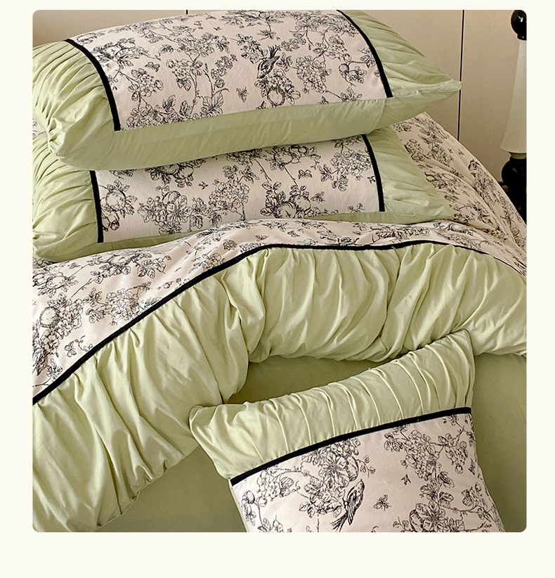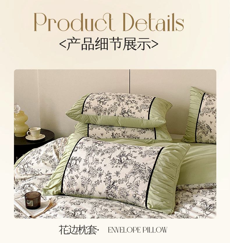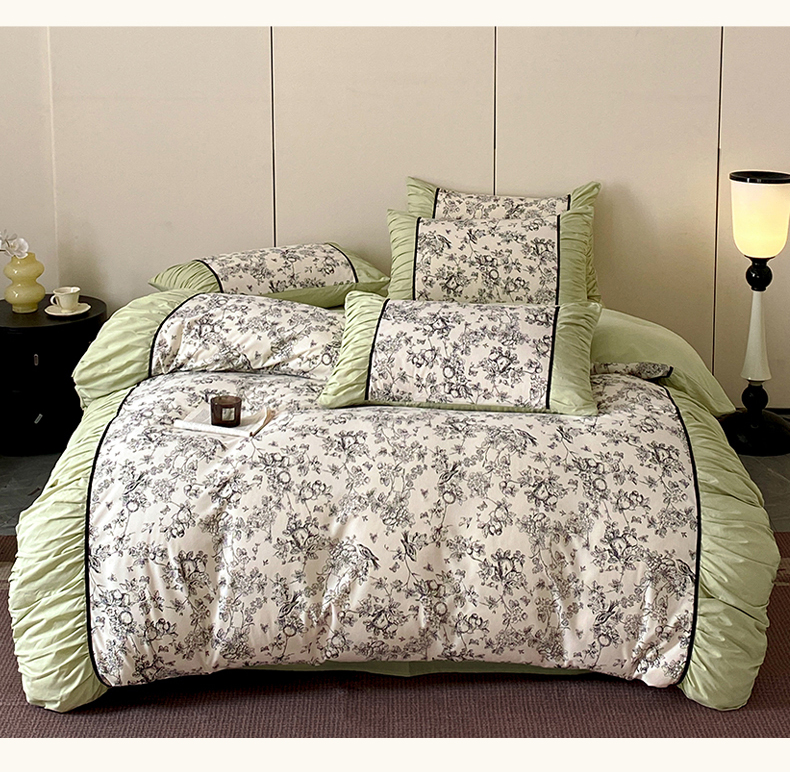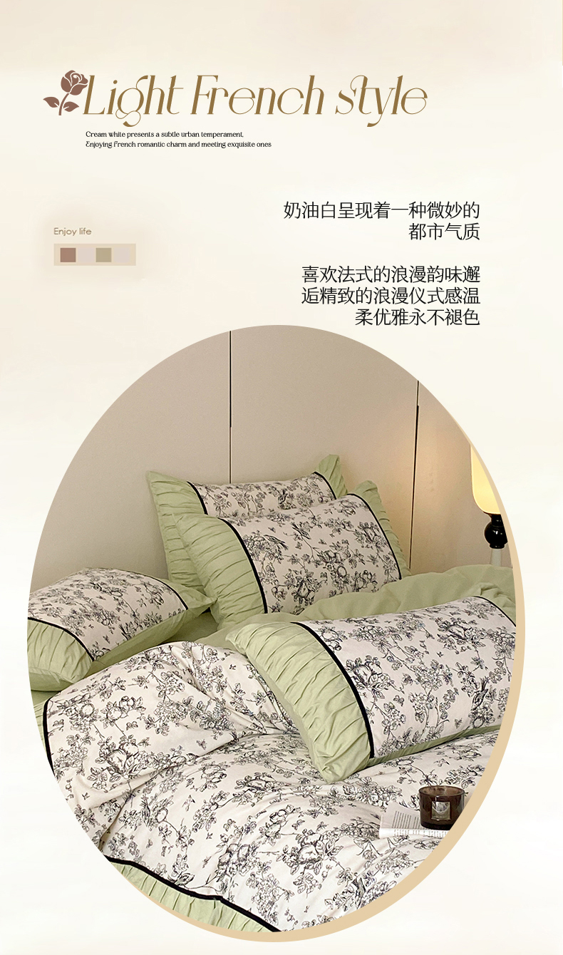 当前位置: 91家纺网 > 商品网购 > 床品套件 > 四件套 > 普通磨毛四件套 > 一左一右 2024秋冬新款法式复古印花褶皱花边水洗磨毛四件套-场景一(提供买家秀) 复古绿