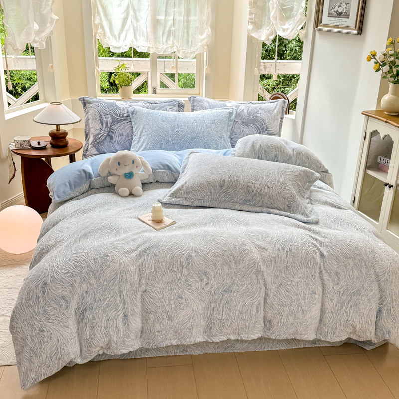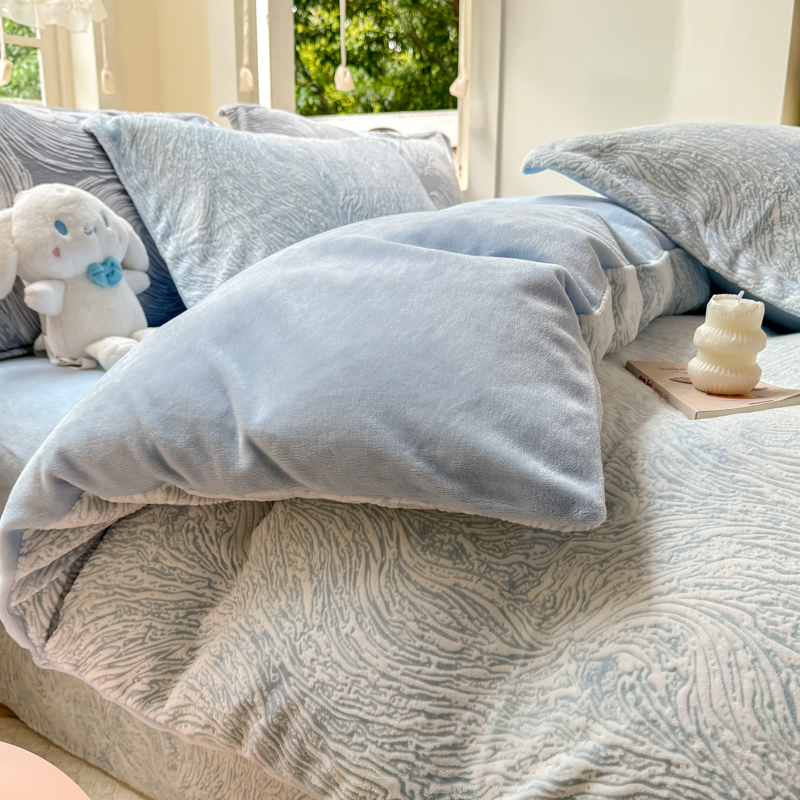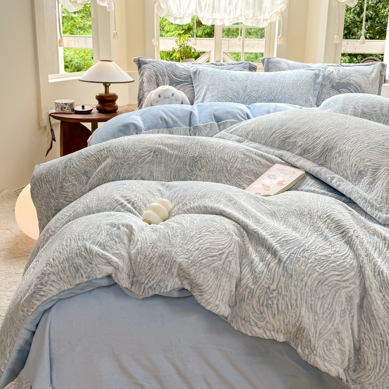 商品名称:梦莱斯 2024新款雕花牛奶绒四件套 肌理纹-月光蓝