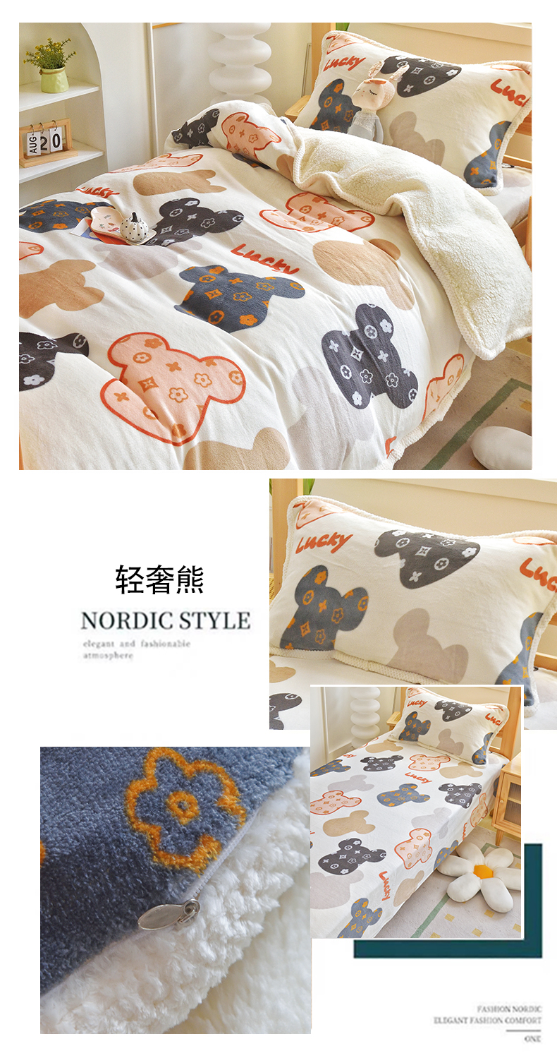 当前位置: 91家纺网 > 商品网购 > 床品套件 > 三件套 > 多乐家纺 2024新款学生宿舍牛奶绒羊羔绒三件套 轻奢熊