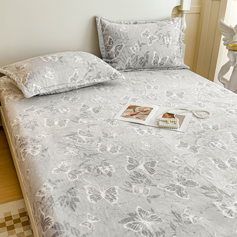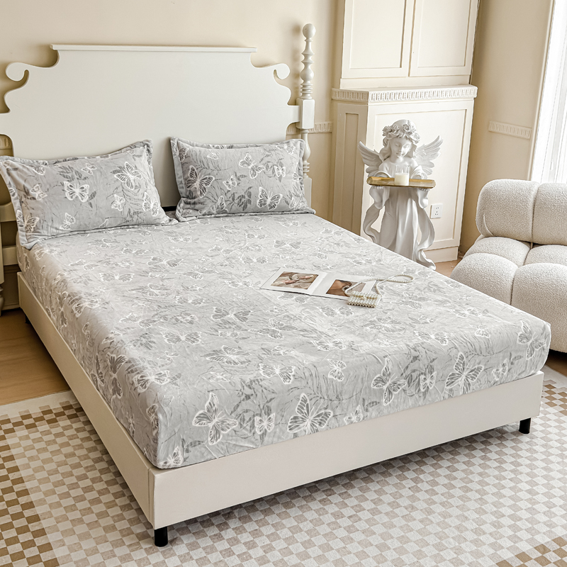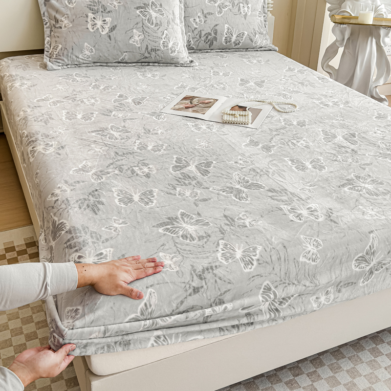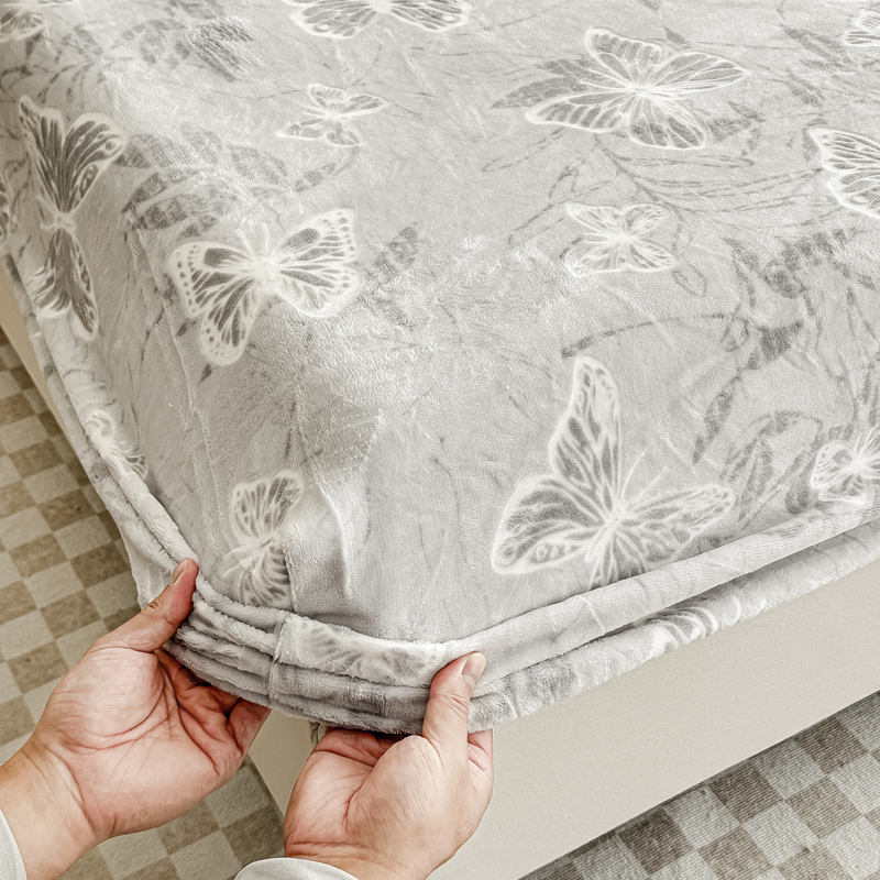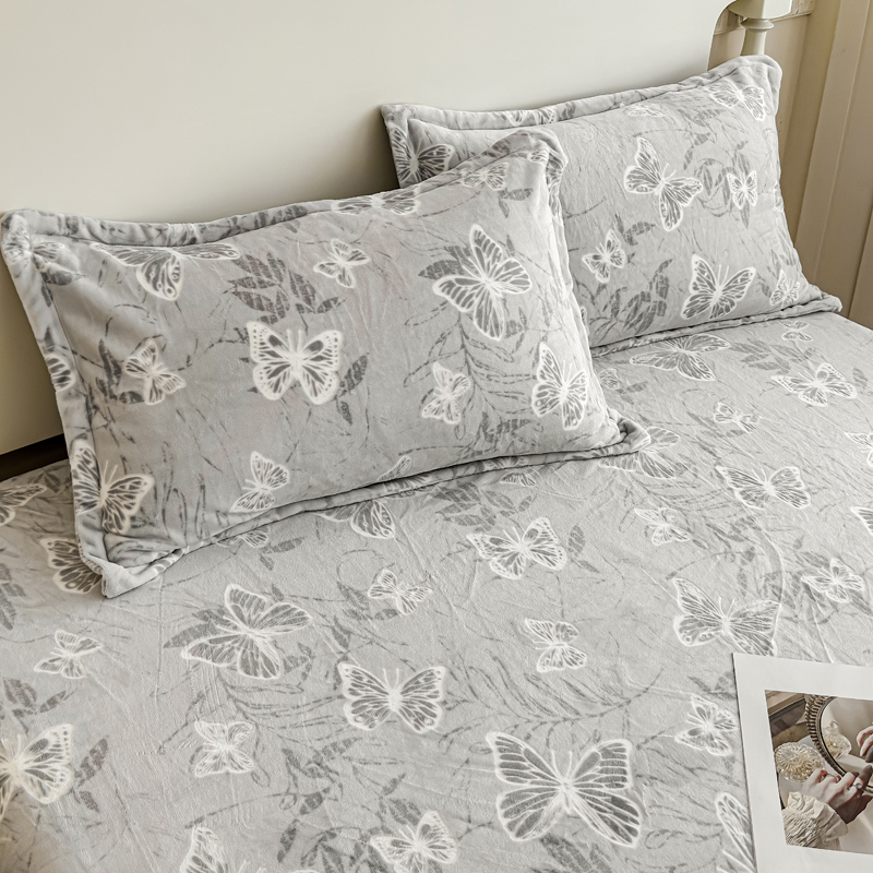 • 91家纺网 家纺一手货源 找家纺 金丝鸟家纺 2024新款加厚240g立体雕花牛奶绒床笠 蝴蝶飞 灰
