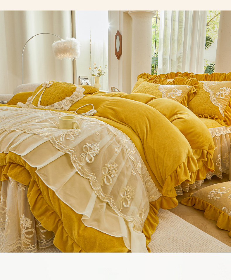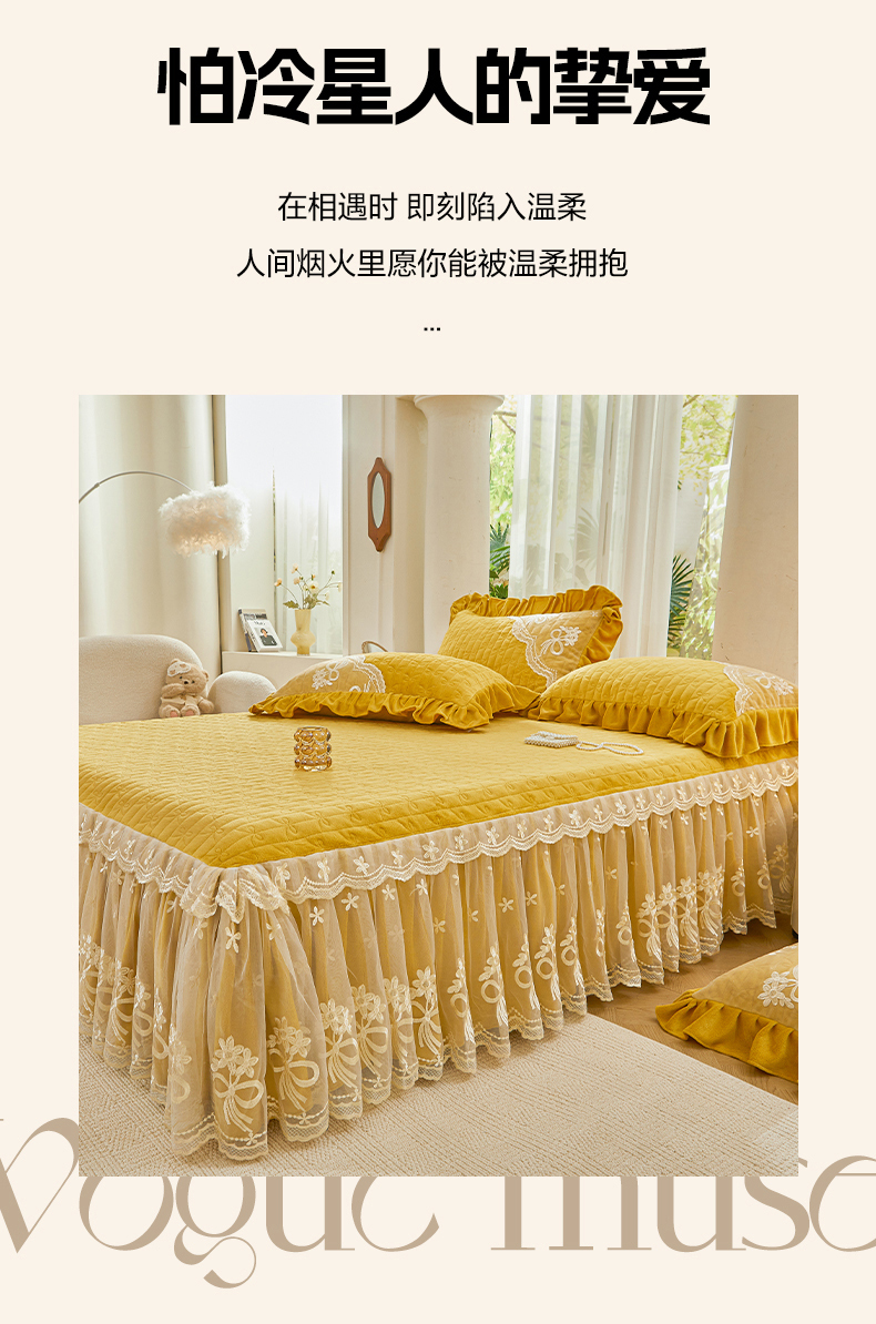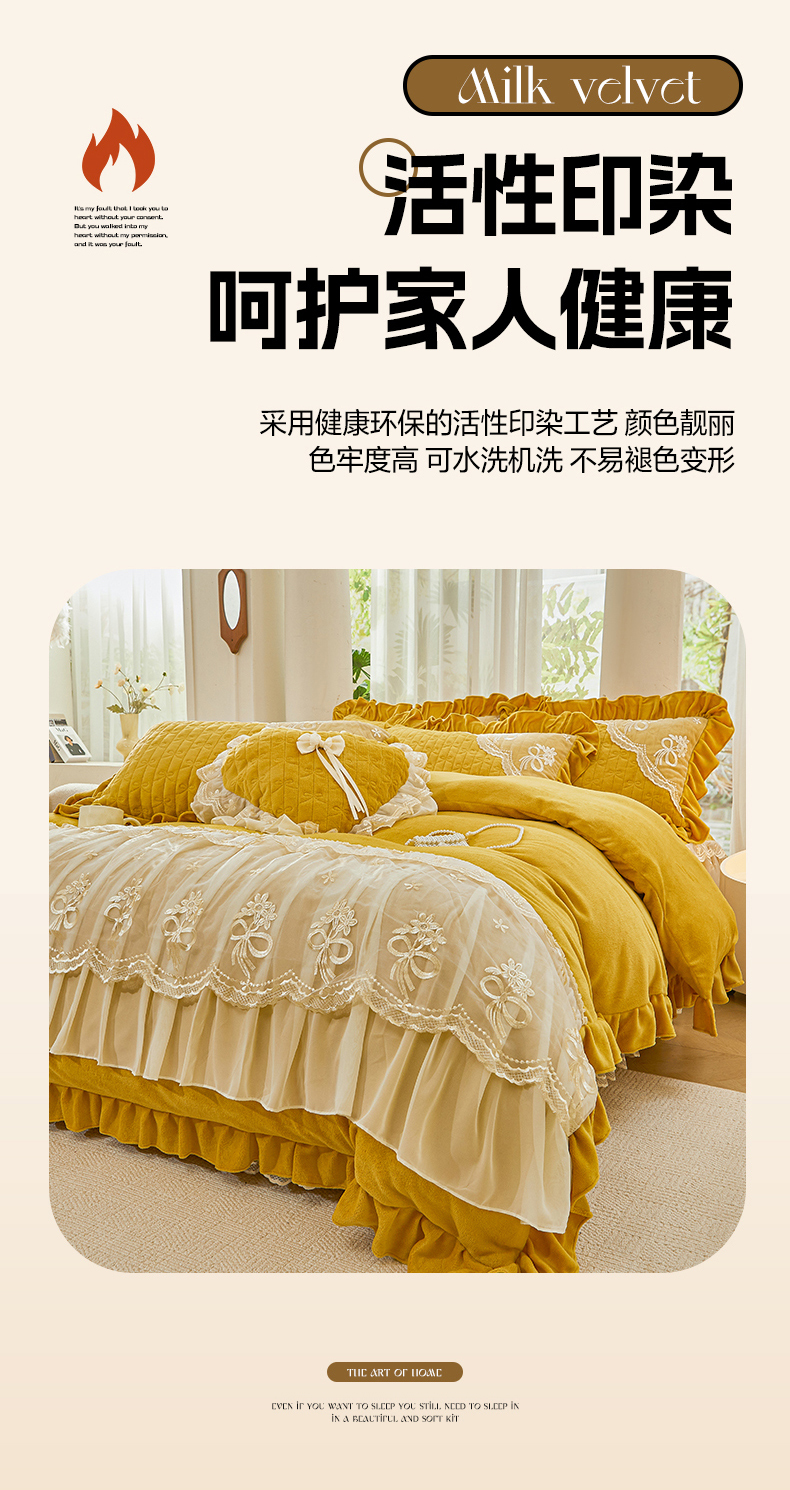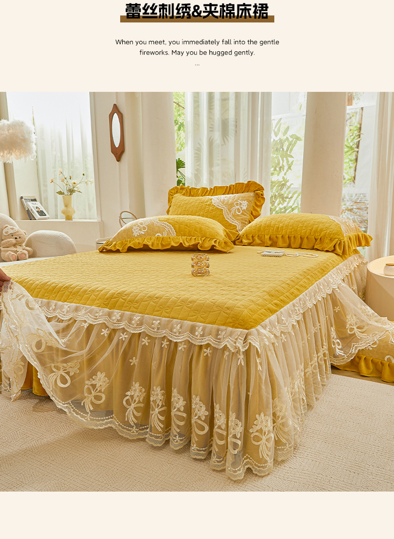 当前位置: 91家纺网 > 商品网购 > 床品套件 > 四件套 > 牛奶绒四件套 > 2024新款加厚牛奶绒蕾丝刺绣床裙四件套-莫奈花园系列 莫奈花园-嫩黄