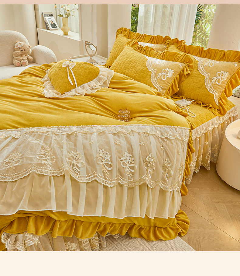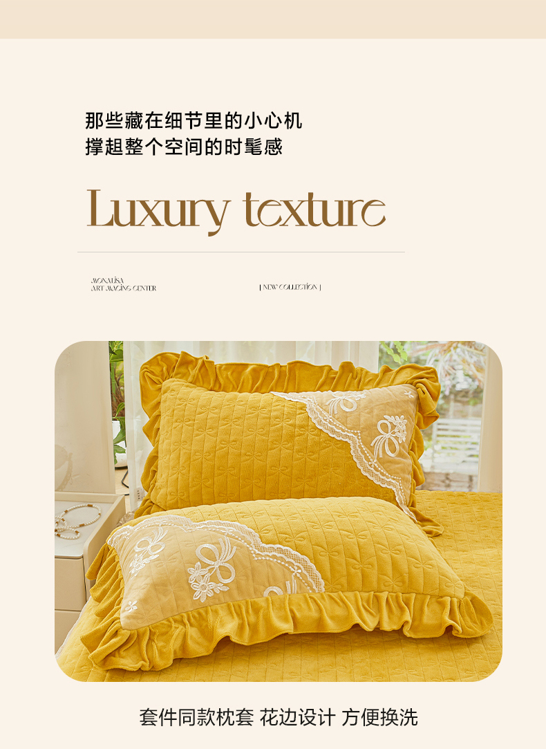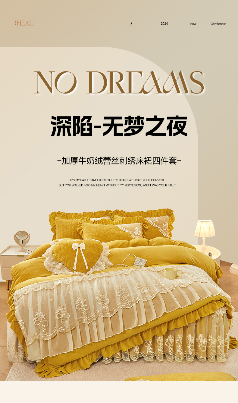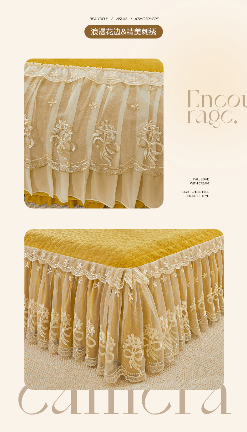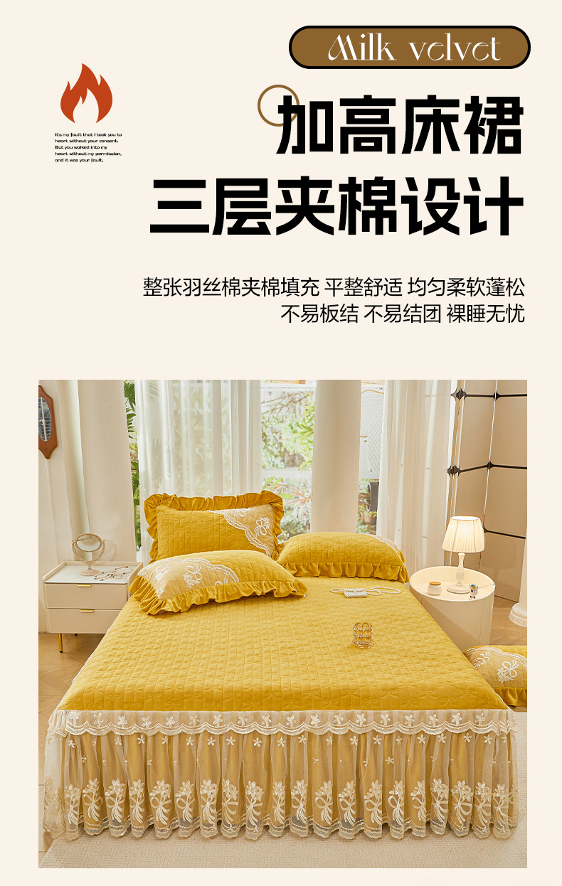 当前位置: 91家纺网 > 商品网购 > 床品套件 > 四件套 > 牛奶绒四件套 > 2024新款加厚牛奶绒蕾丝刺绣床裙四件套-莫奈花园系列 莫奈花园-嫩黄