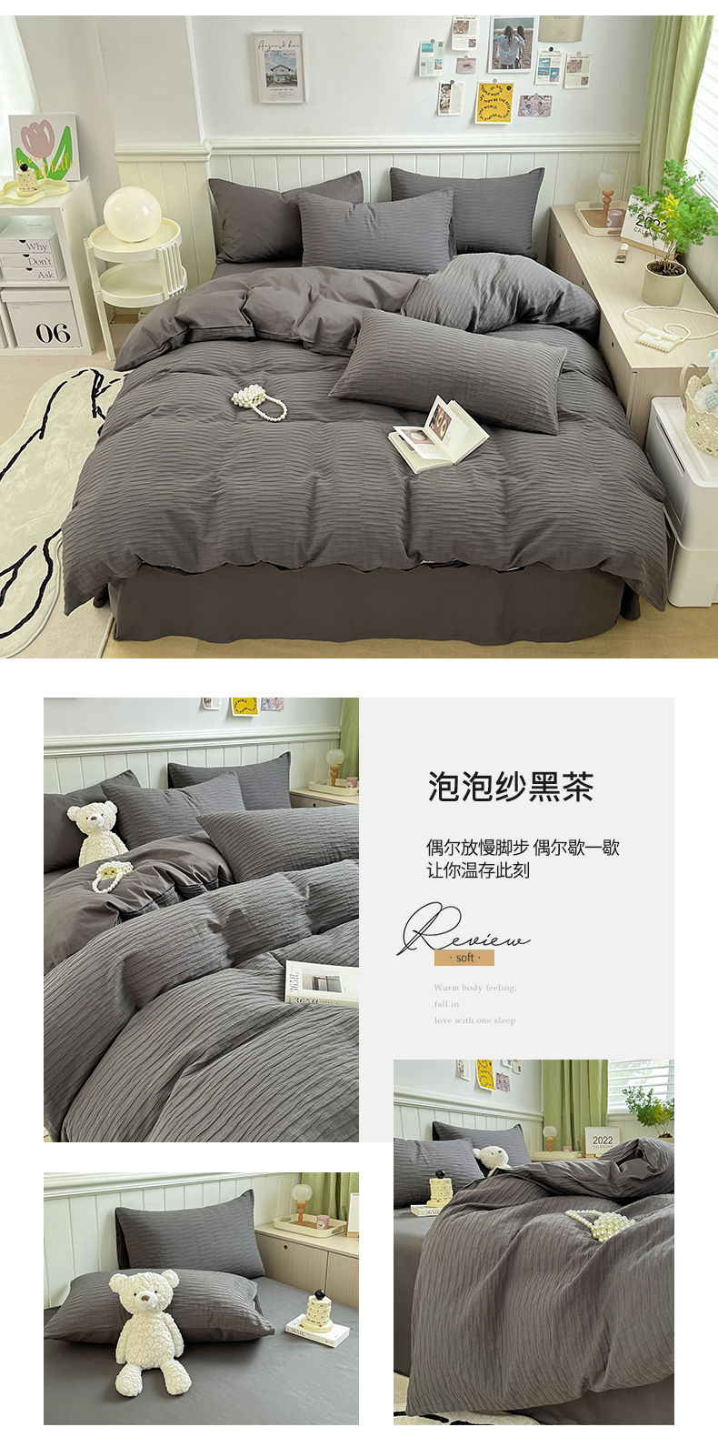 雅居纺家纺 2025新款全棉泡泡纱四件套 泡泡纱黑茶