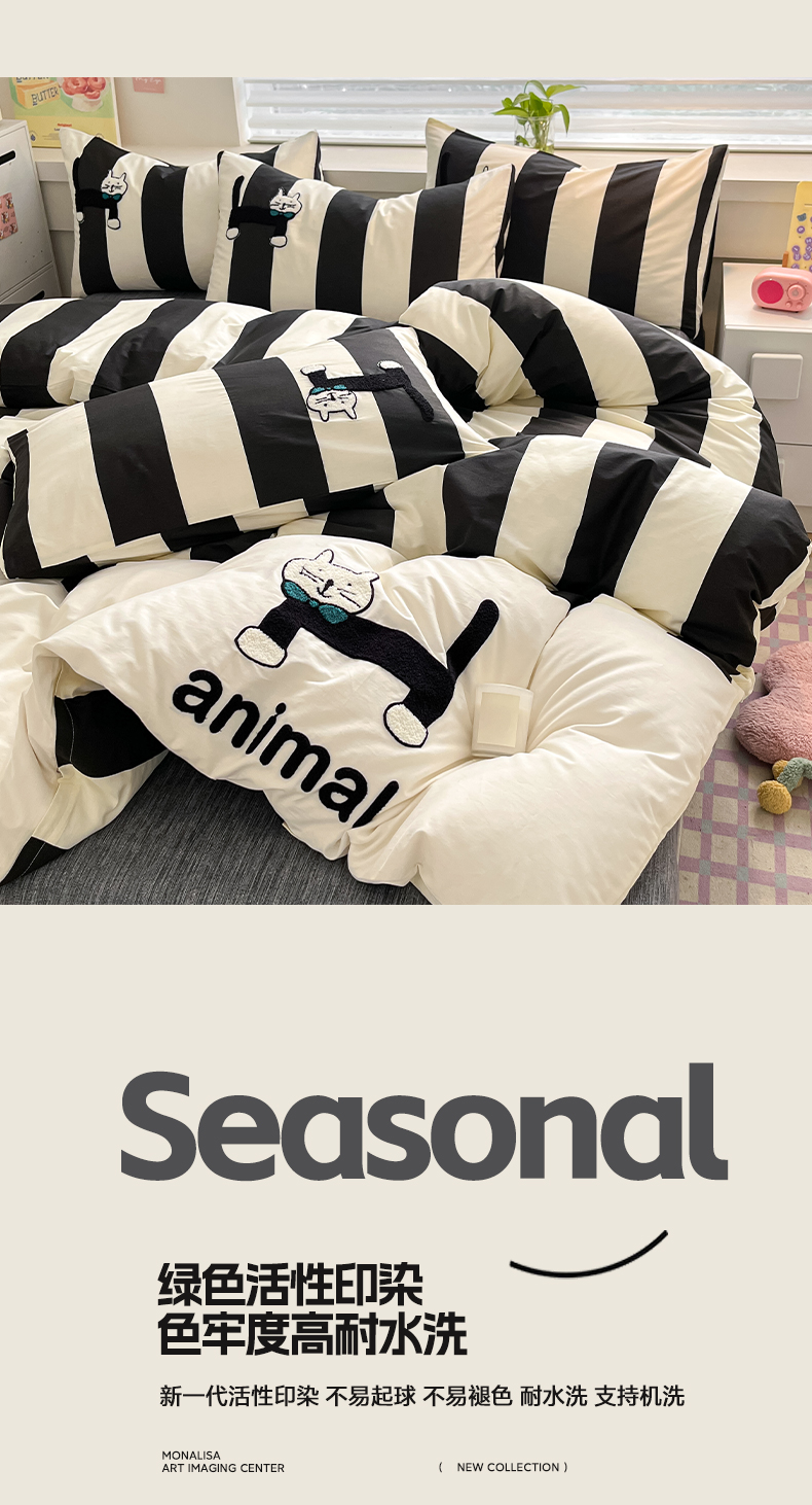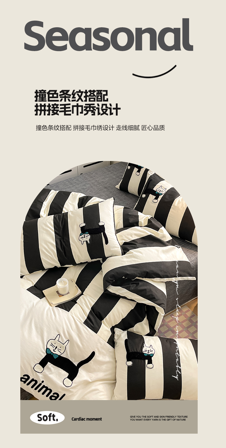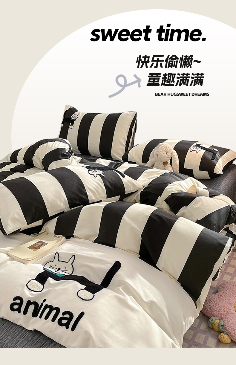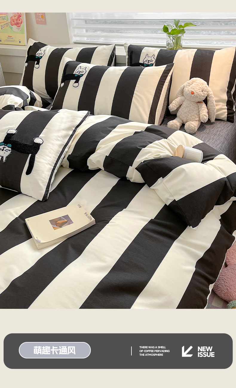 雅居纺家纺 2025新款全棉拼接贴布绣四件套 竖条黑绅士猫