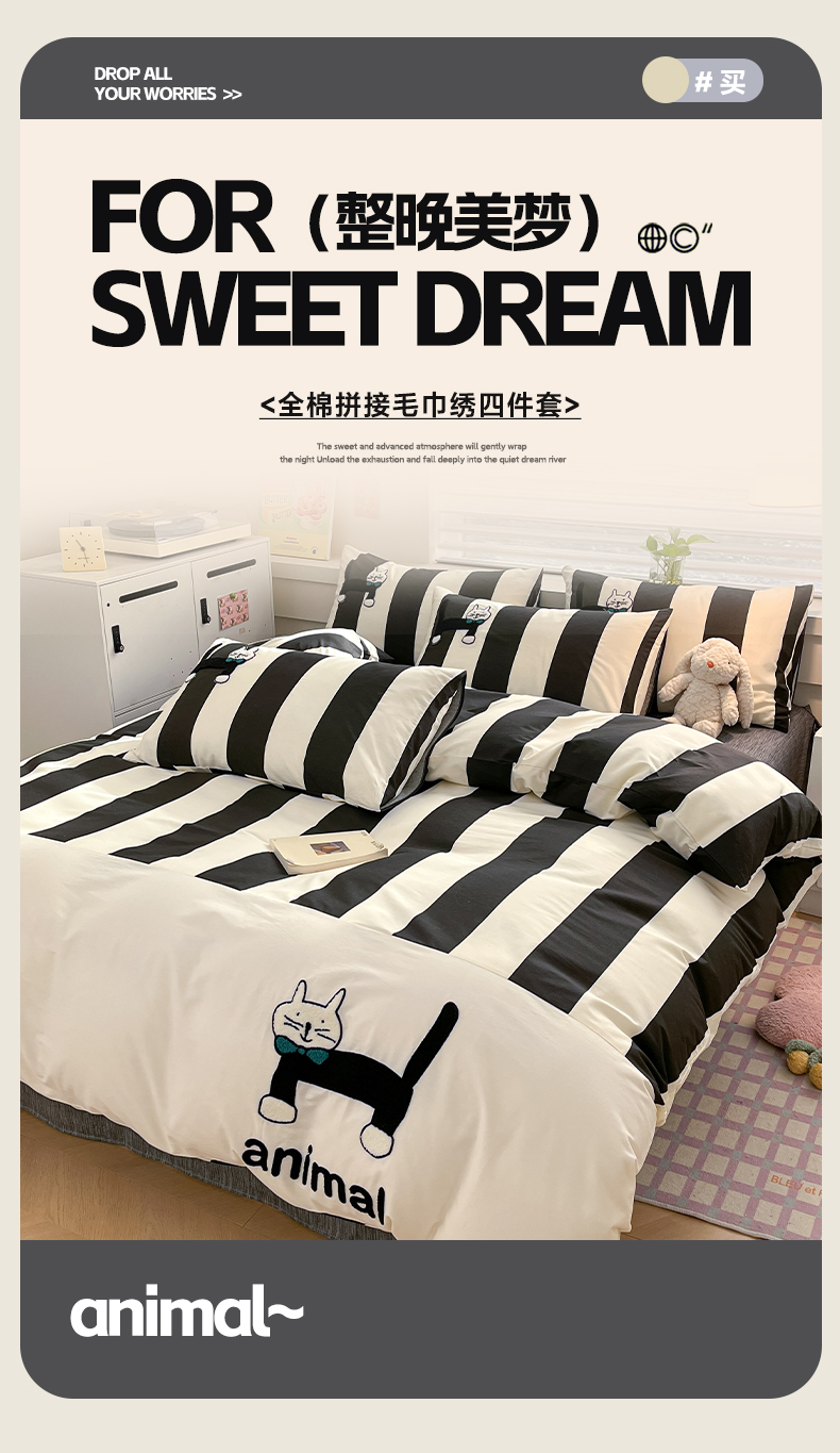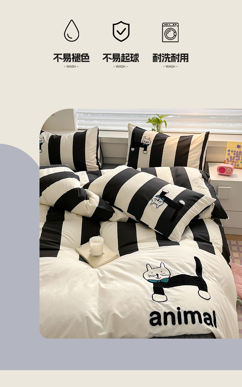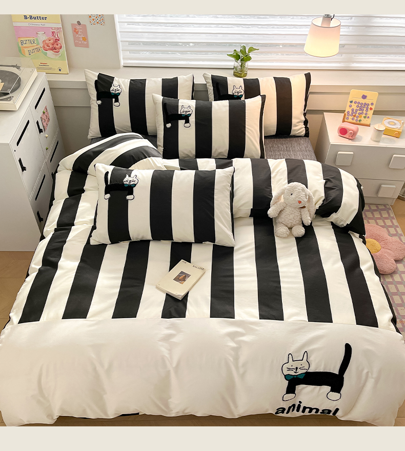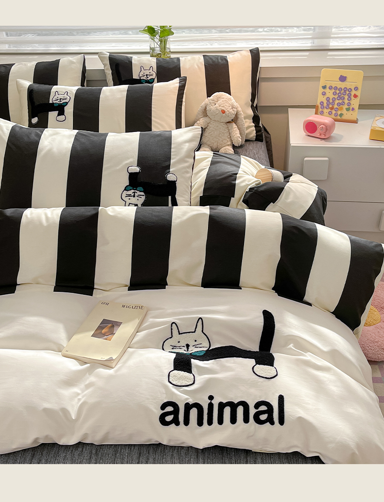 雅居纺家纺 2025新款全棉拼接贴布绣四件套 竖条黑绅士猫