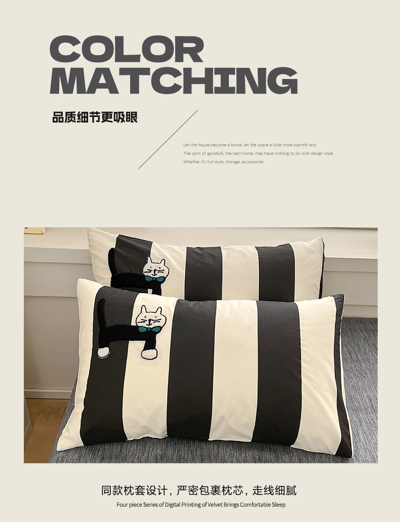 商品名称:雅居纺家纺 2025新款全棉拼接贴布绣四件套 竖条黑绅士猫