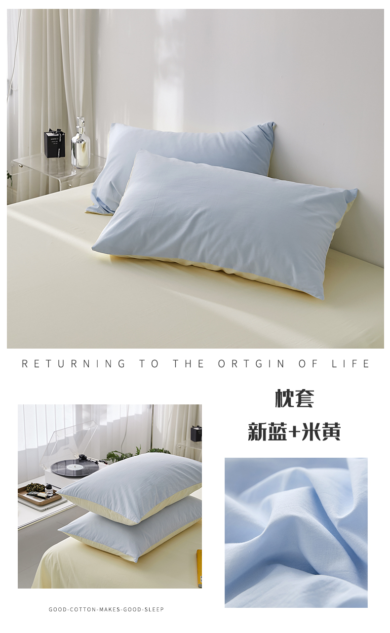 商品名称:雅居纺家纺 2025新款全棉素色水洗棉单枕套 新蓝+米黄