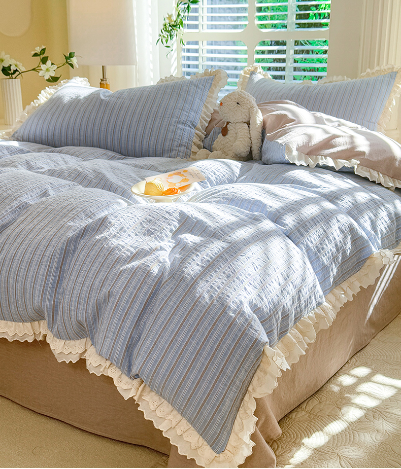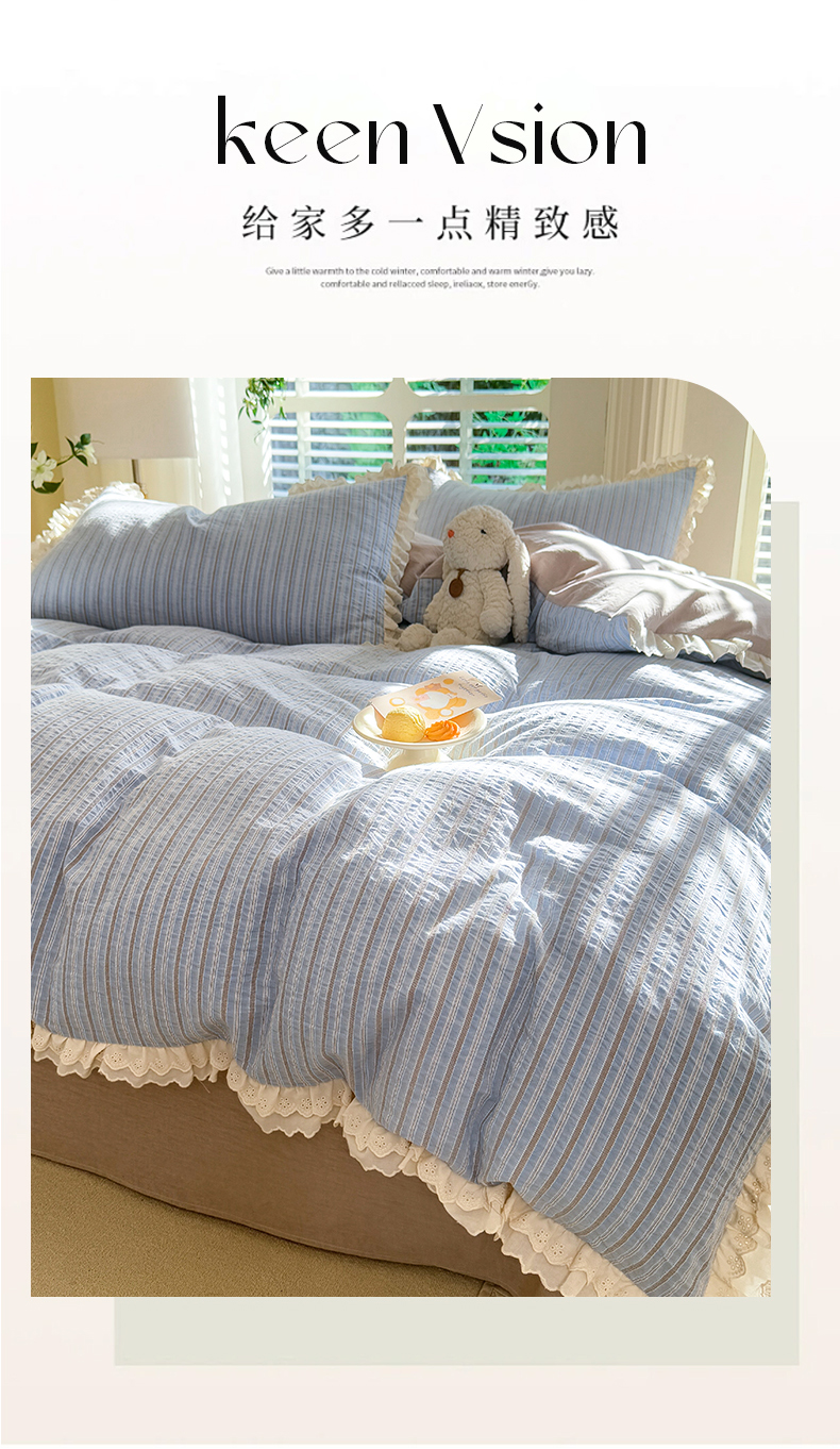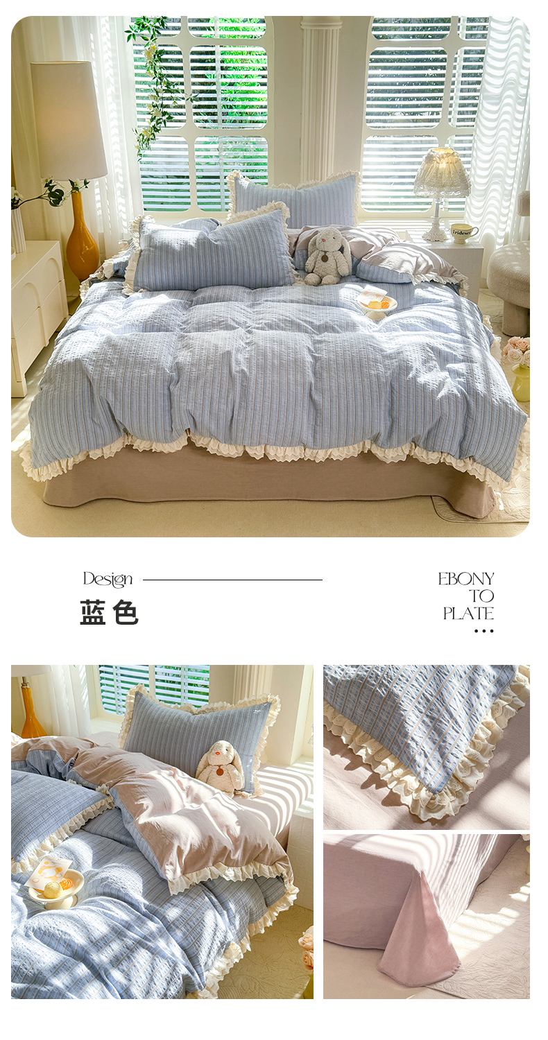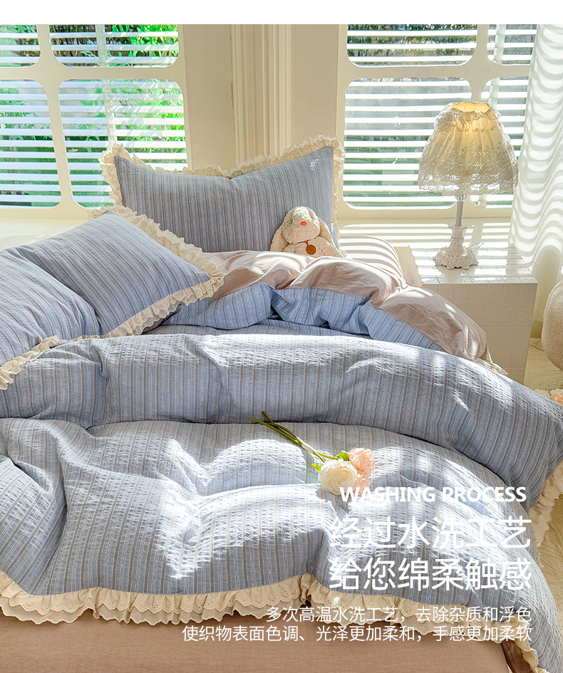 商品名称:棉小二 2025新款全棉色织花边提花水洗棉四件套-麦香 麦香-蓝色