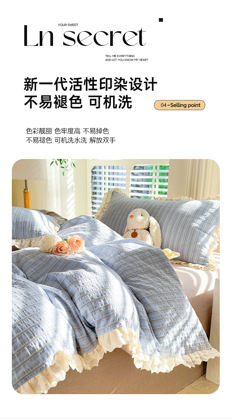 (总)棉小二 2025新款全棉色织水洗棉花边夏被四件套,麦香-兰,麦香-粉,麦香-绿