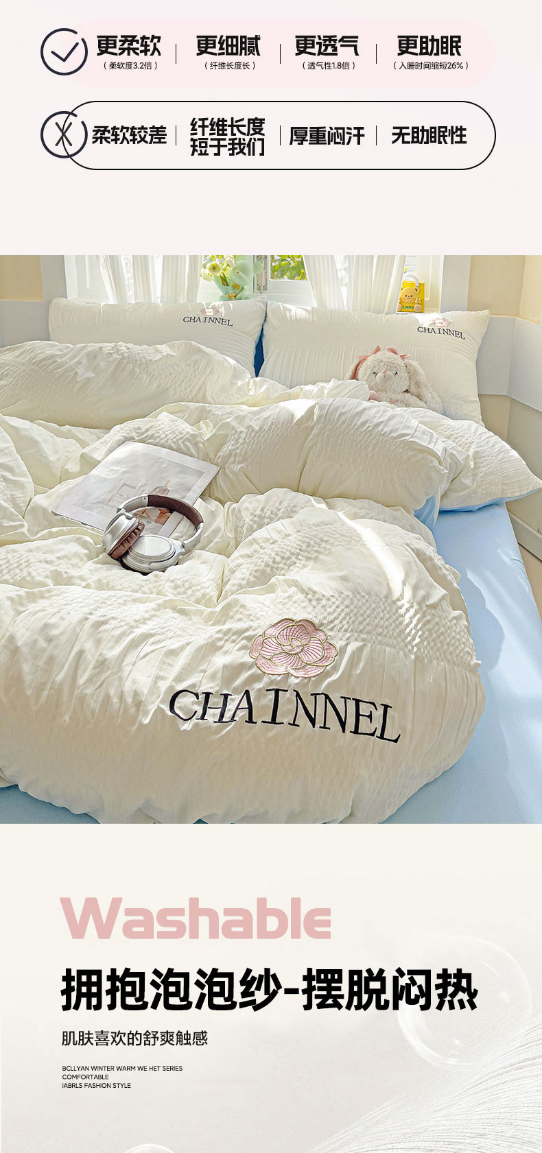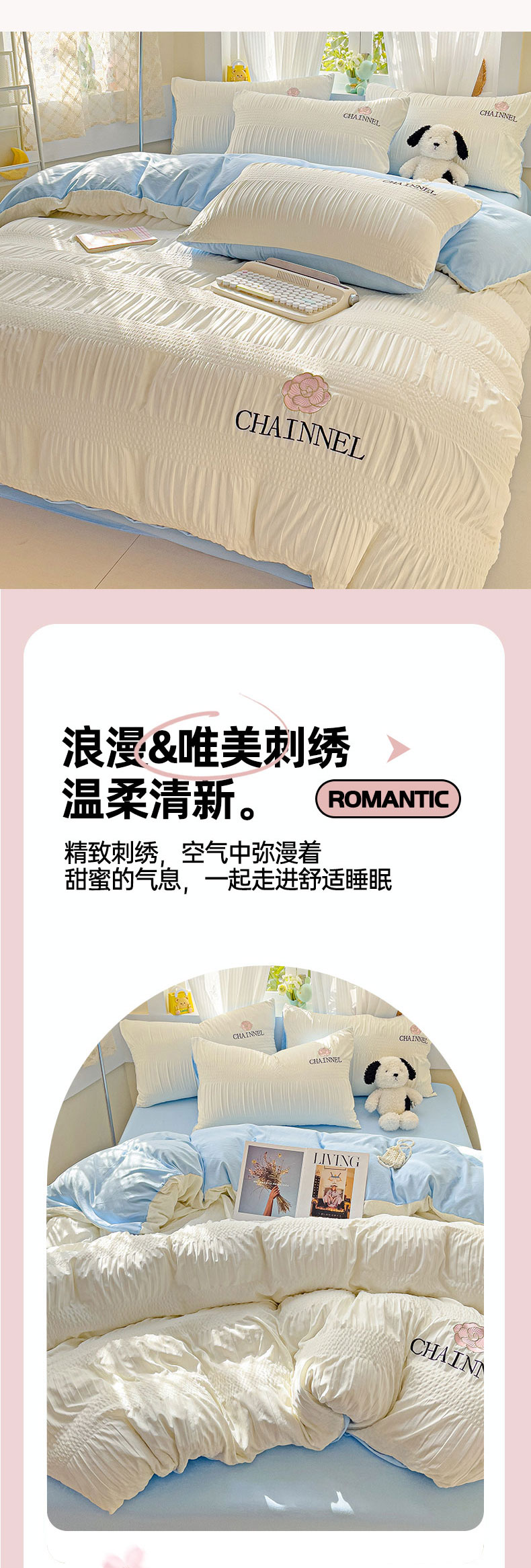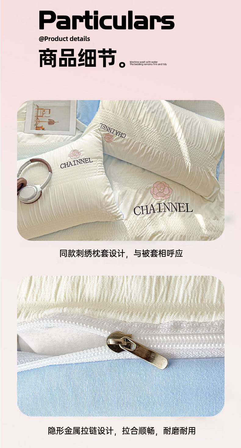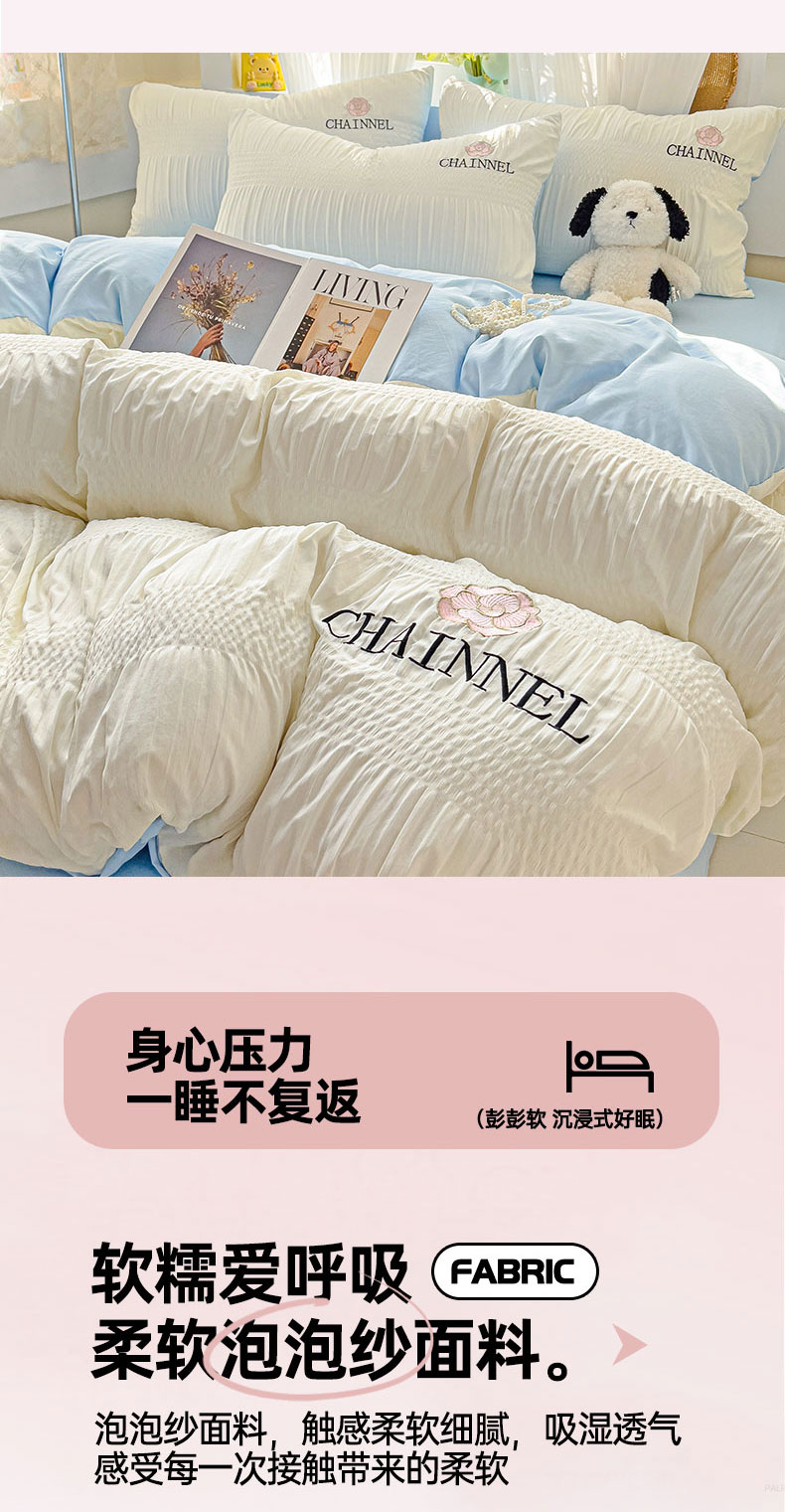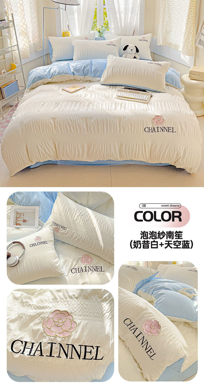 当前位置: 91家纺网 > 商品网购 > 床品套件 > 四件套 > 其它四件套 > 灰鲸 2025新款泡泡纱系列南笙刺绣四件套 泡泡纱南笙-奶昔白+天空蓝