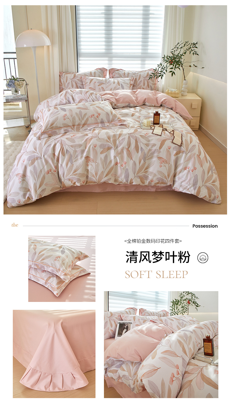 商品名称:启航家居 2025春夏全棉铂金棉数码印花四件套 清风梦叶粉