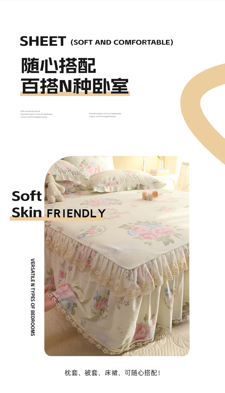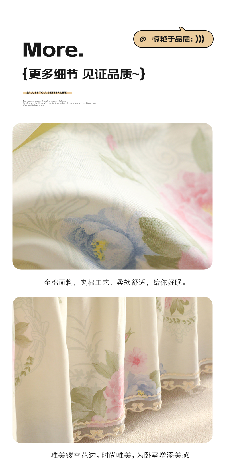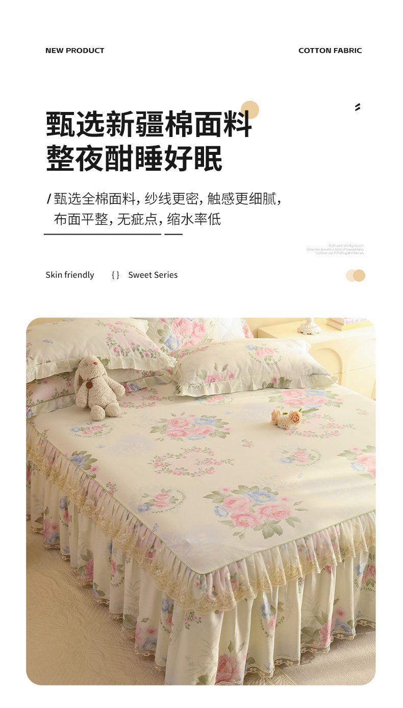(总)美达家纺 2025新款全棉纯棉AB版蕾丝小花边单层床裙四件套,解语花,南湘,沁雨花叶,悦棠