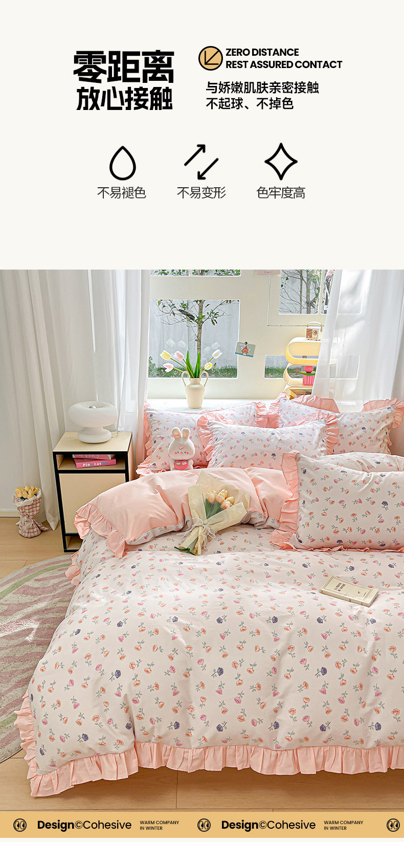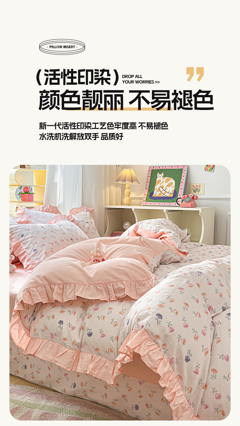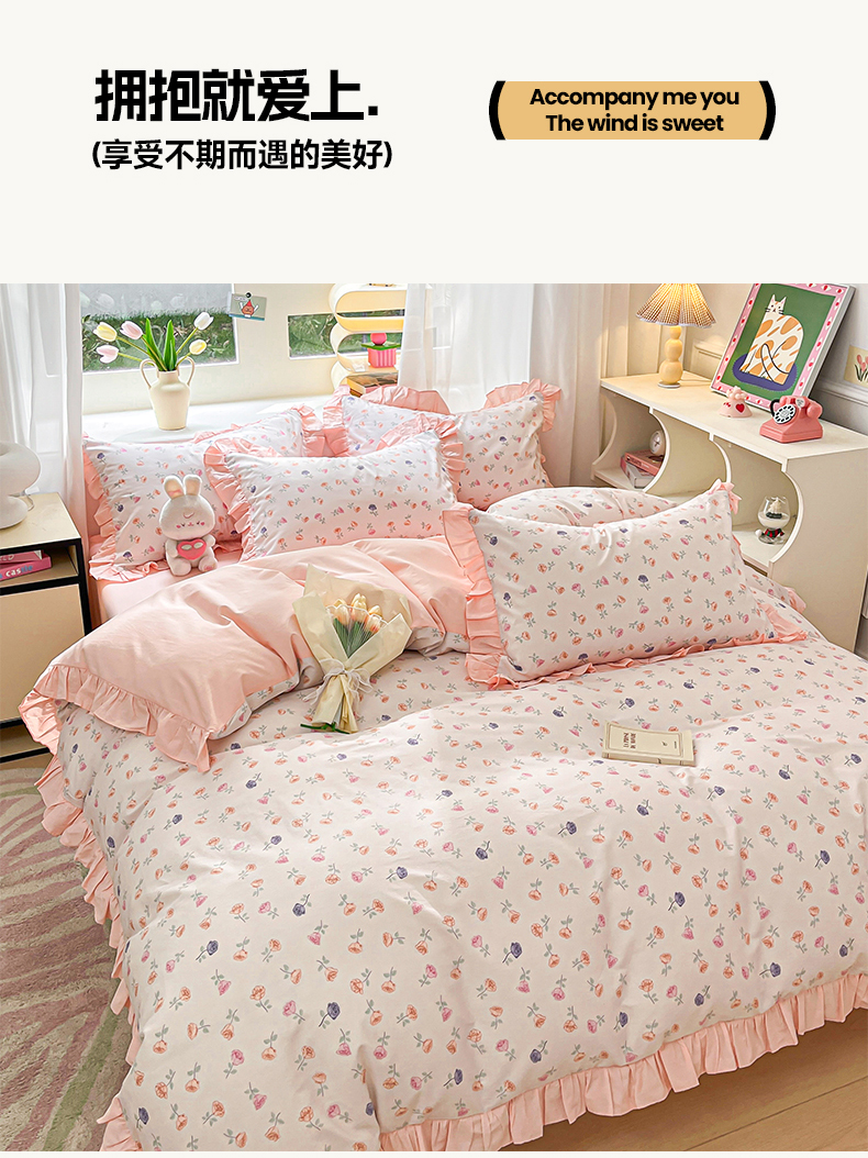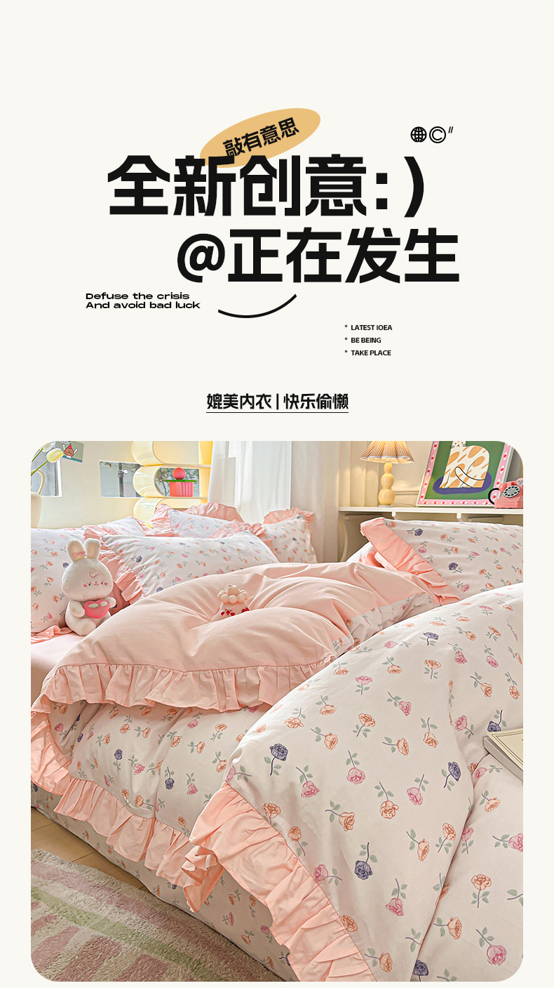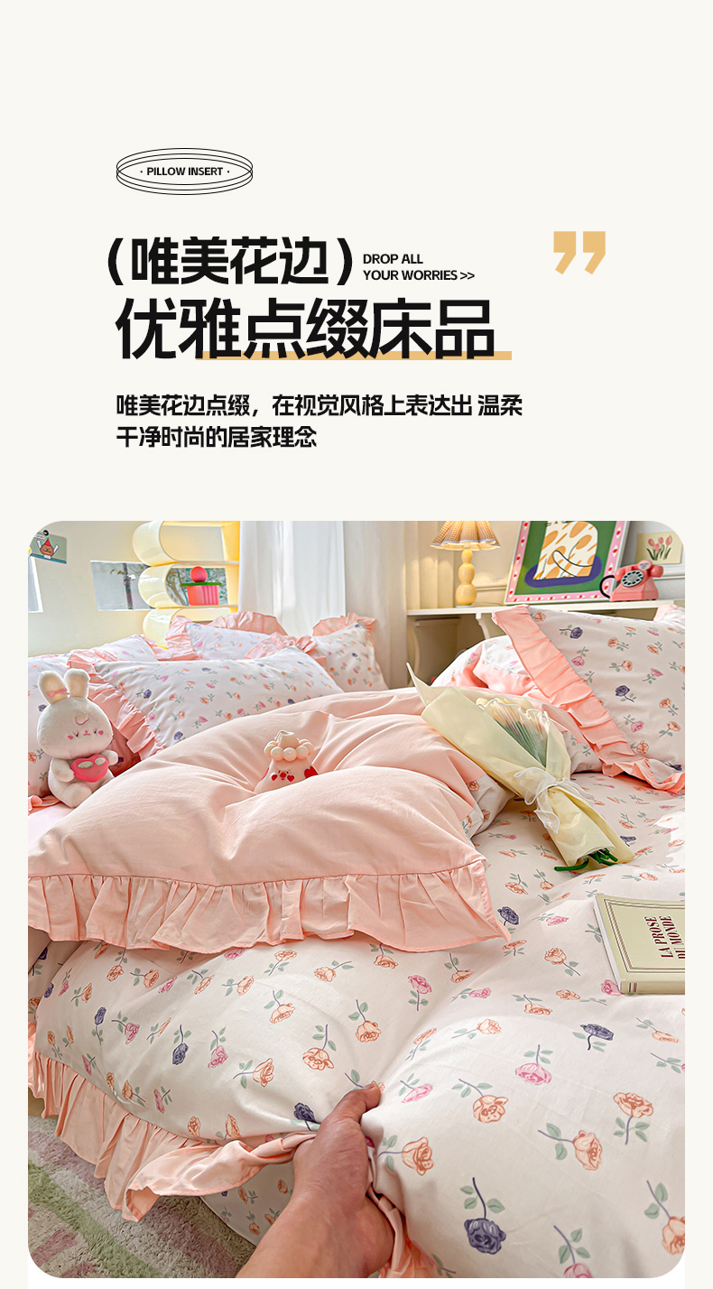 商品名称:美洲琳 2025新款40支13372全棉韩版公主风花边四件套 花妃语寐-粉